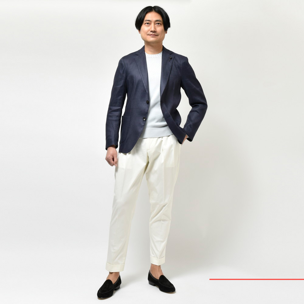 こちらはライトウェイトながらも着ると確かにカチッとしてムードが漂う一着でして、ラフにサラッと合わせるのが良いかなと。