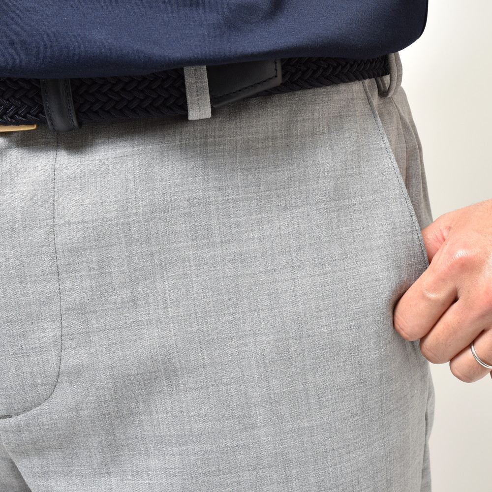 レーヨン33%×ポリエステル33%×ウール29%×ポリウレタン5%ということで、見た目はウール、タッチはサラリ、通気性に優れストレッチ性もあり運動性能も確保されています。