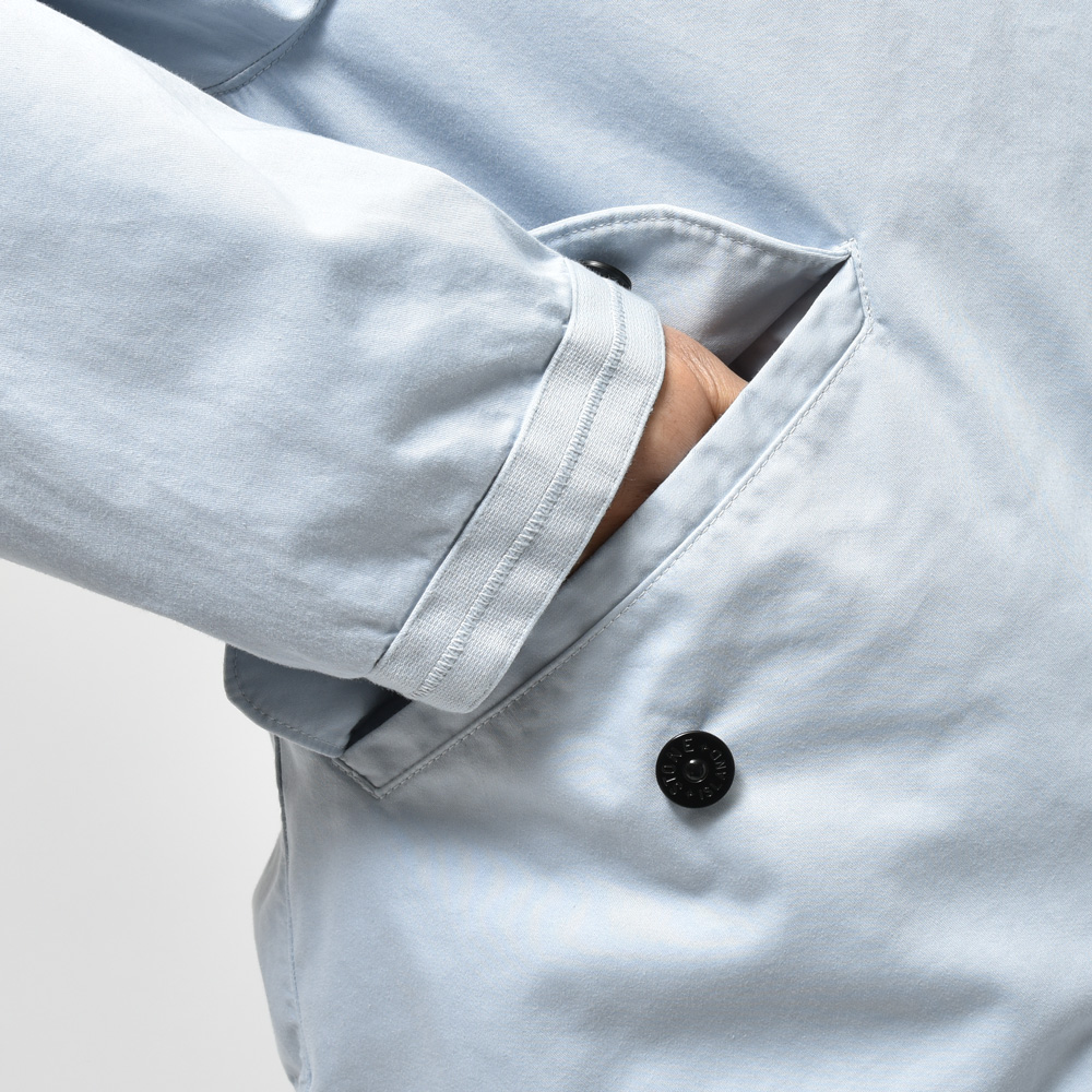 ディティールは気をてらわずといった所でして、左肩にはお馴染みのバッジ、袖口はボタンで調節可能なコットンテープが付いています。シンプルに纏められているからこそ長いスパンで活躍してくれる一着になっています。
