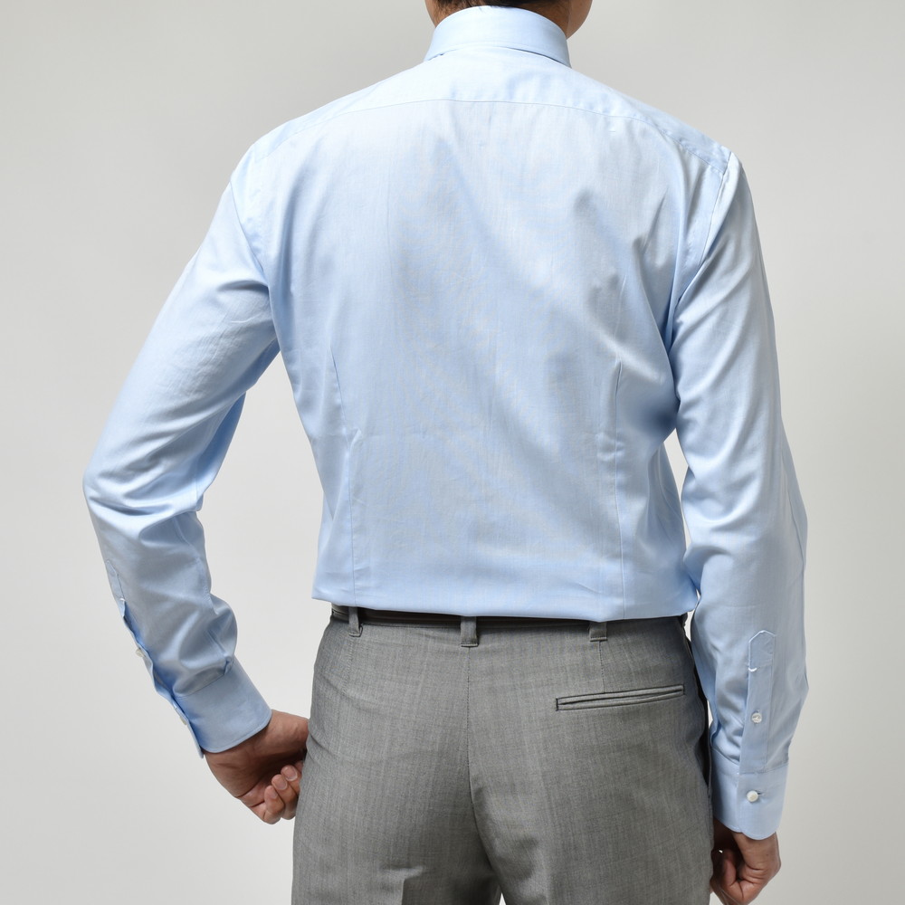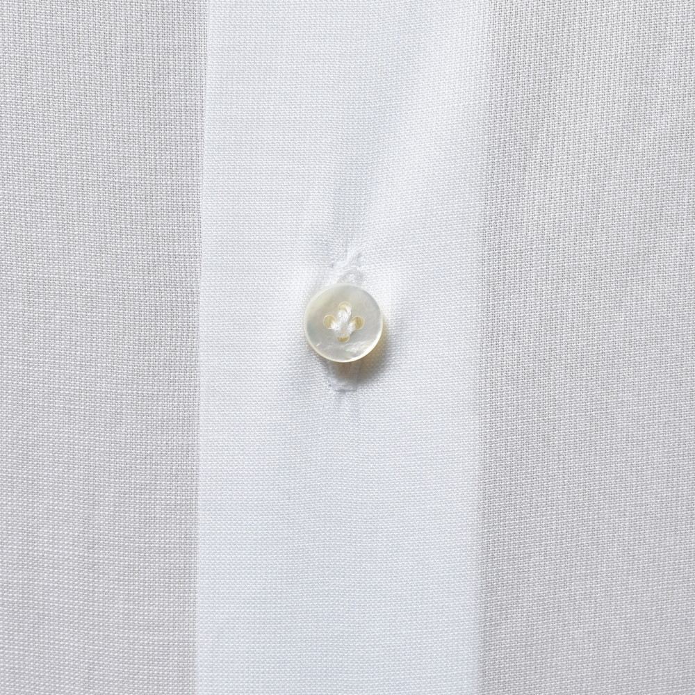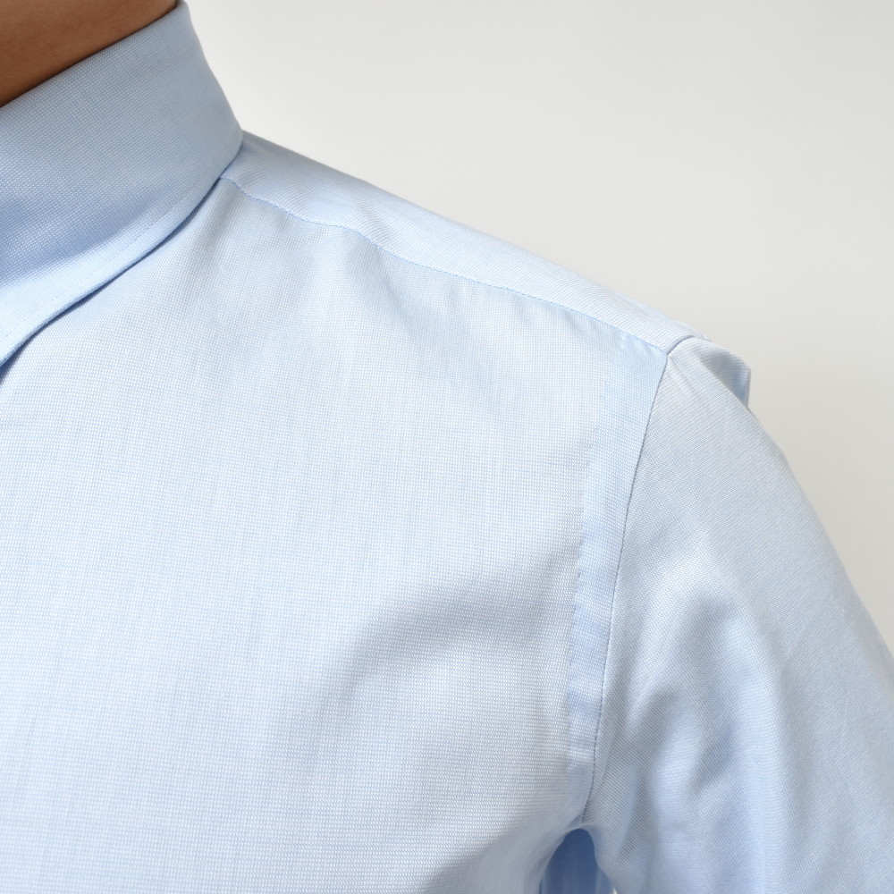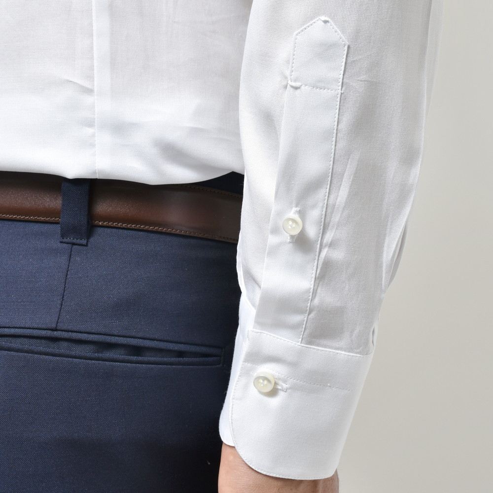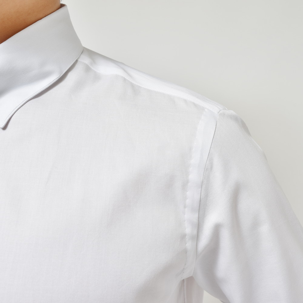 立体的で引き締まった見え方になりますので、Vゾーンがピリッとするんですよね。心地良いドレスシャツだと思います。