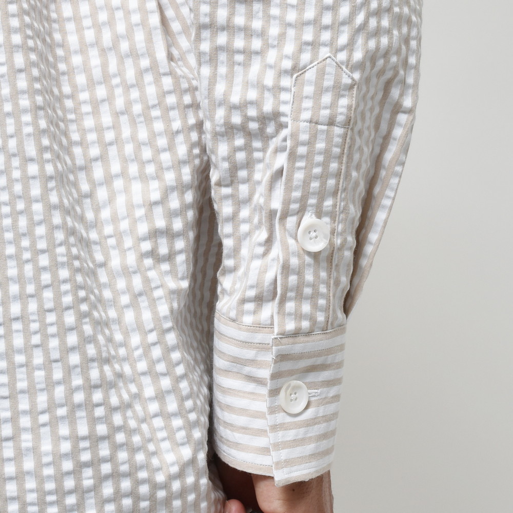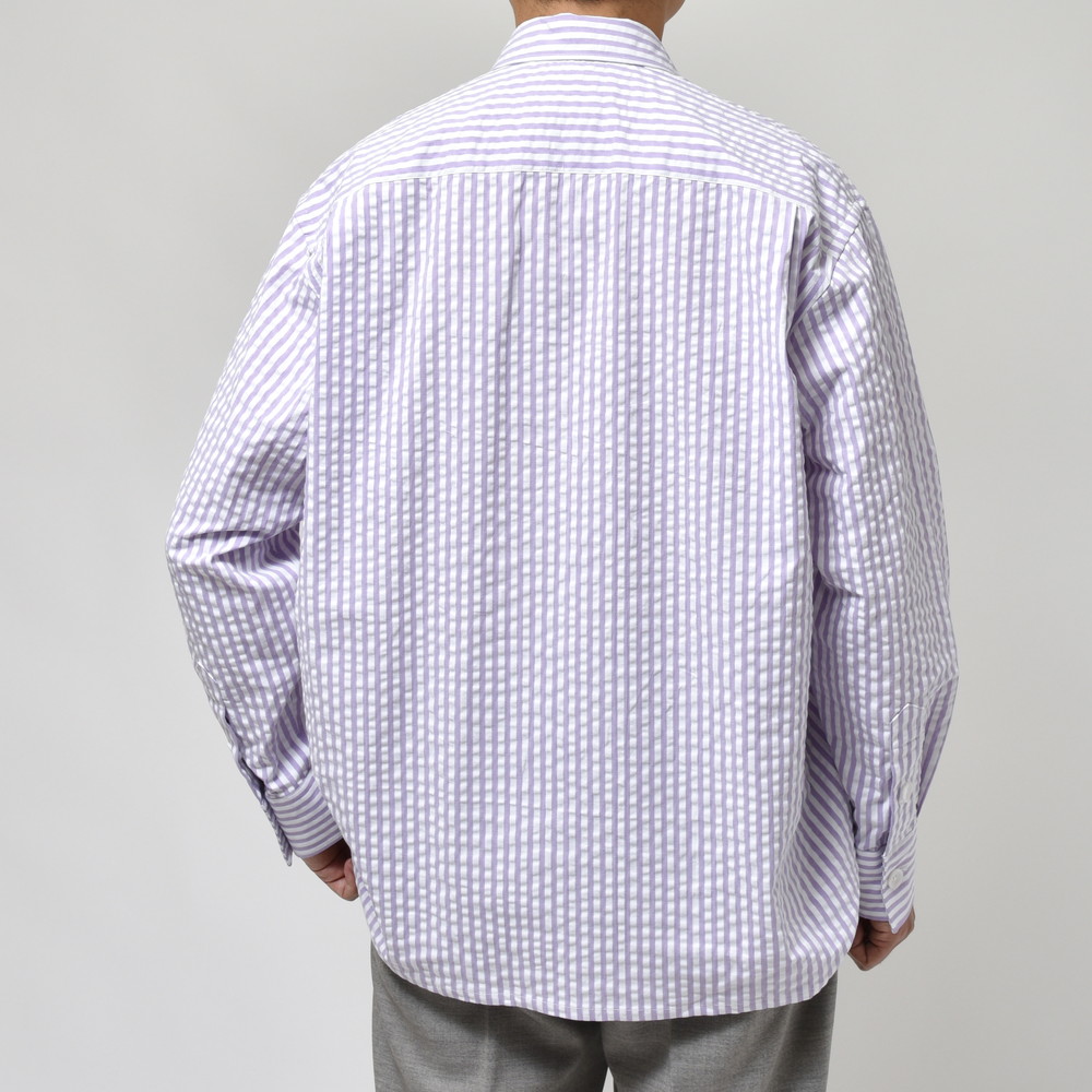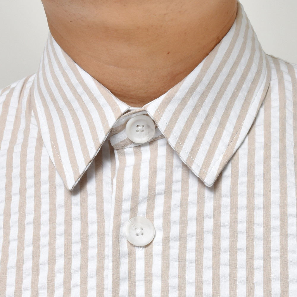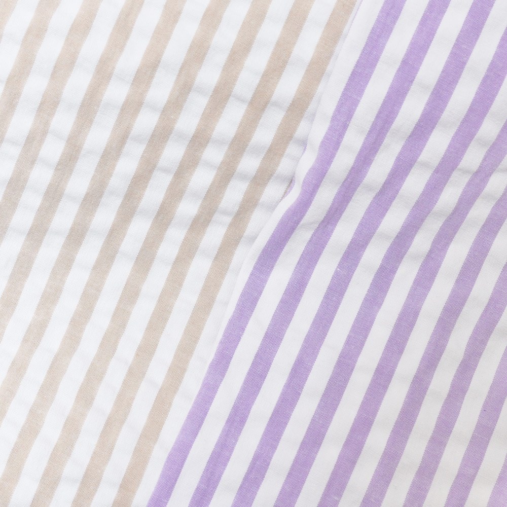 ポップなカラーのストライプもシアサッカー組織にすると少しマイルドで落ち着いた印象に見えます。