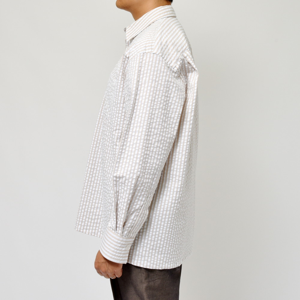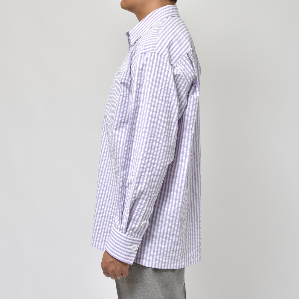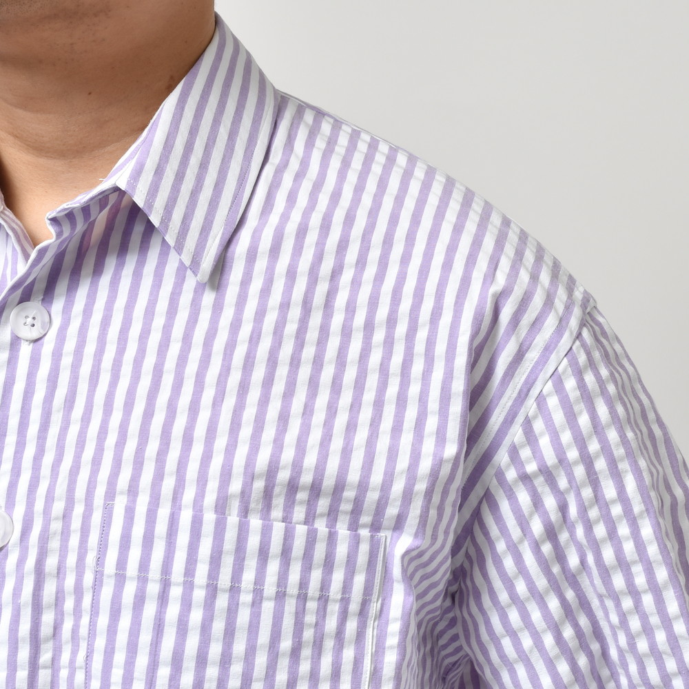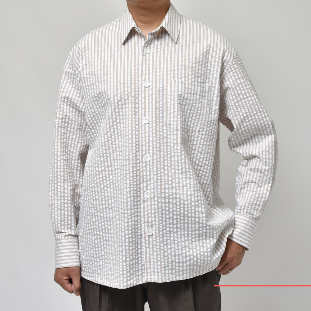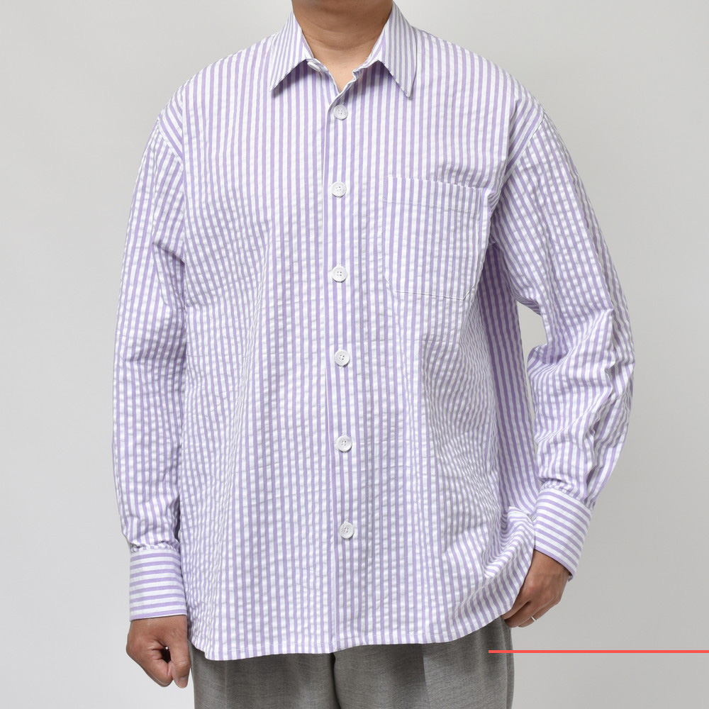 ポップなカラーのストライプもシアサッカー組織にすると少しマイルドで落ち着いた印象に見えます。