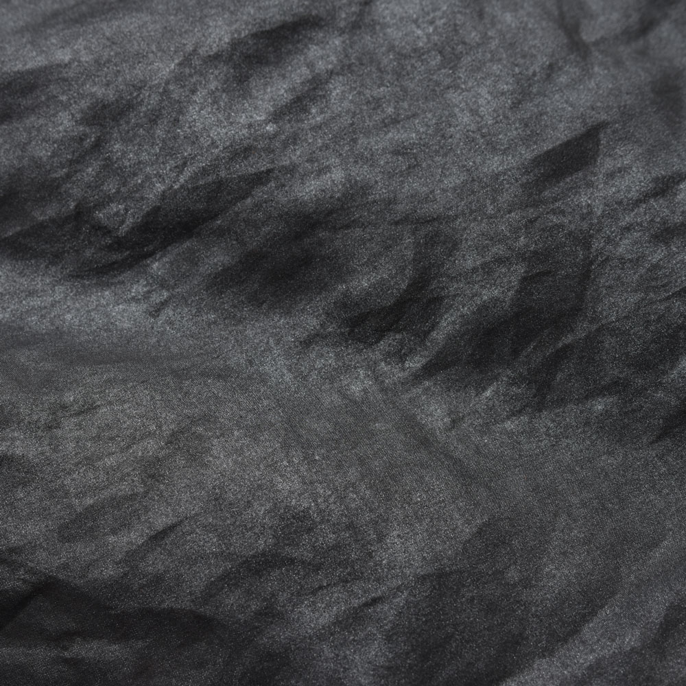 こちらはシルクを泥染した生地を採用していまして、独特の鈍い光沢感を放つ色合いになっています。まるで鋼のような色合いでありながらも風に吹かれると軽やかになびいてくれるアンバランスな雰囲気が絶妙にそそられるわけです。
