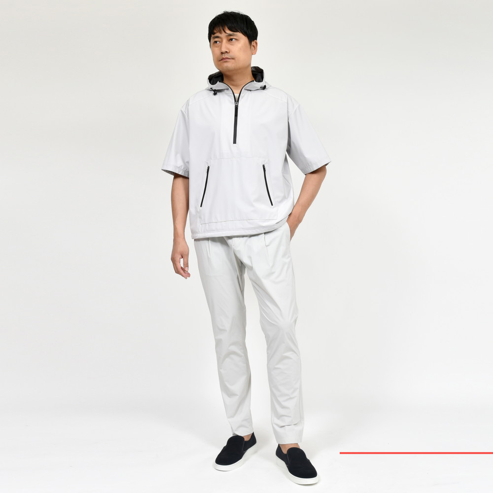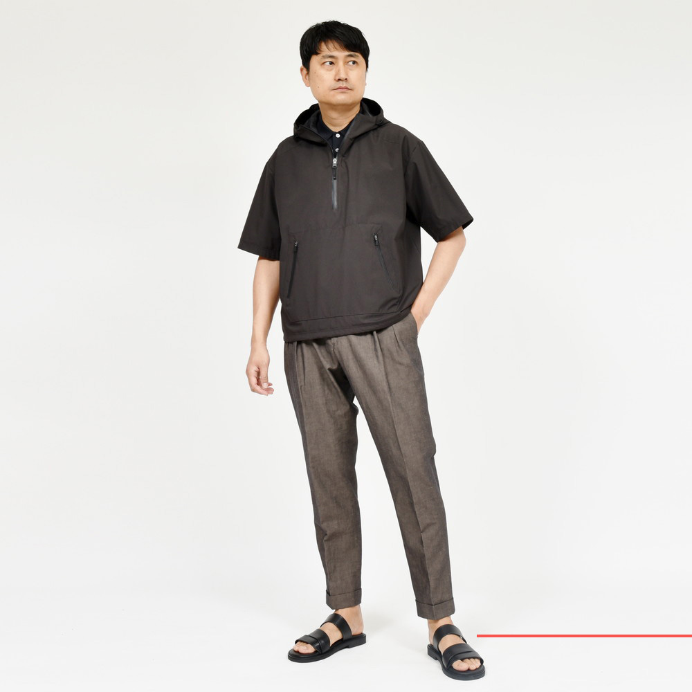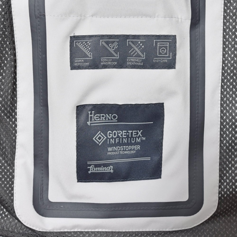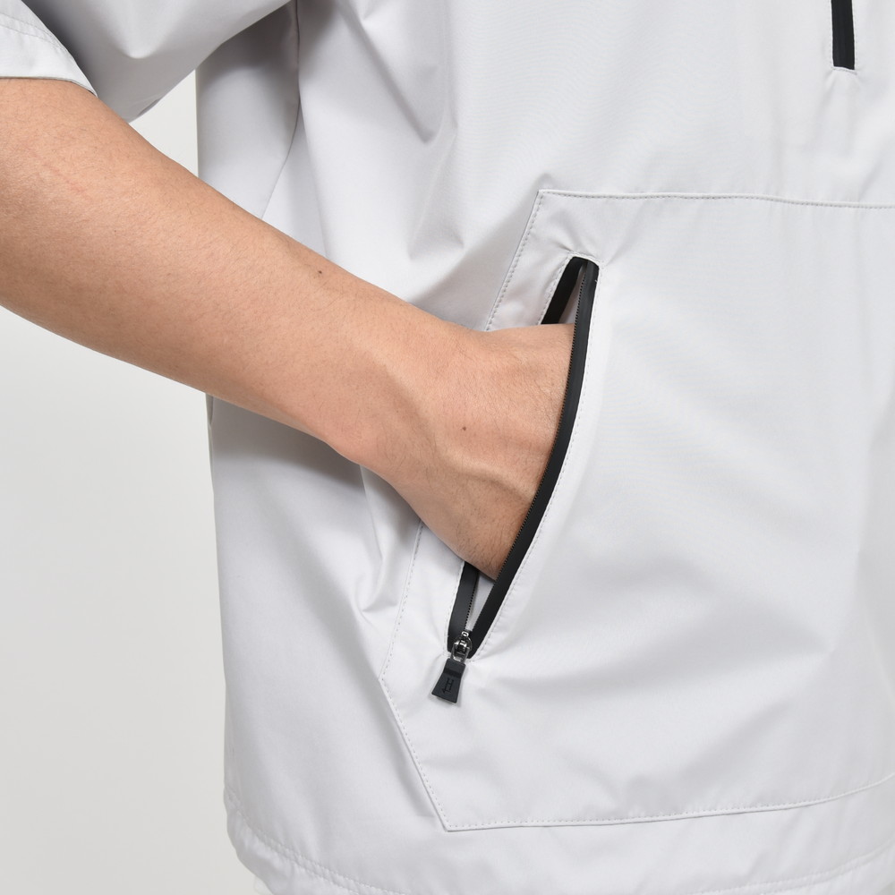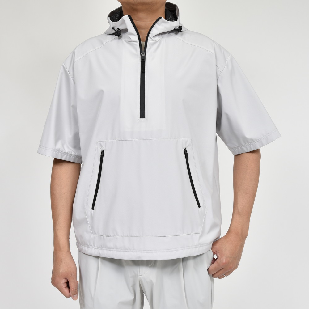HERNO(ヘルノ)Laminarラミナーでは定番素材となる2レイヤー仕様のGORE-TEX INFINIUM、こちらは少し珍しいデザインである半袖タイプのアノラックフーディーです。