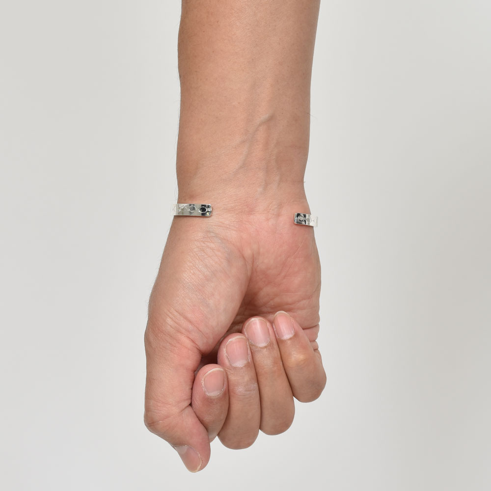 こちらはチェーンをモチーフにしたような柄が刻まれていまして、程よくクラフト感がありアーティスティックなムードも感じさせる仕上がりに。幅は約5ミリになっていまして手元で適度なアクセントになってくれて、かつ重ね付けにも対応可能な懐の深さも。