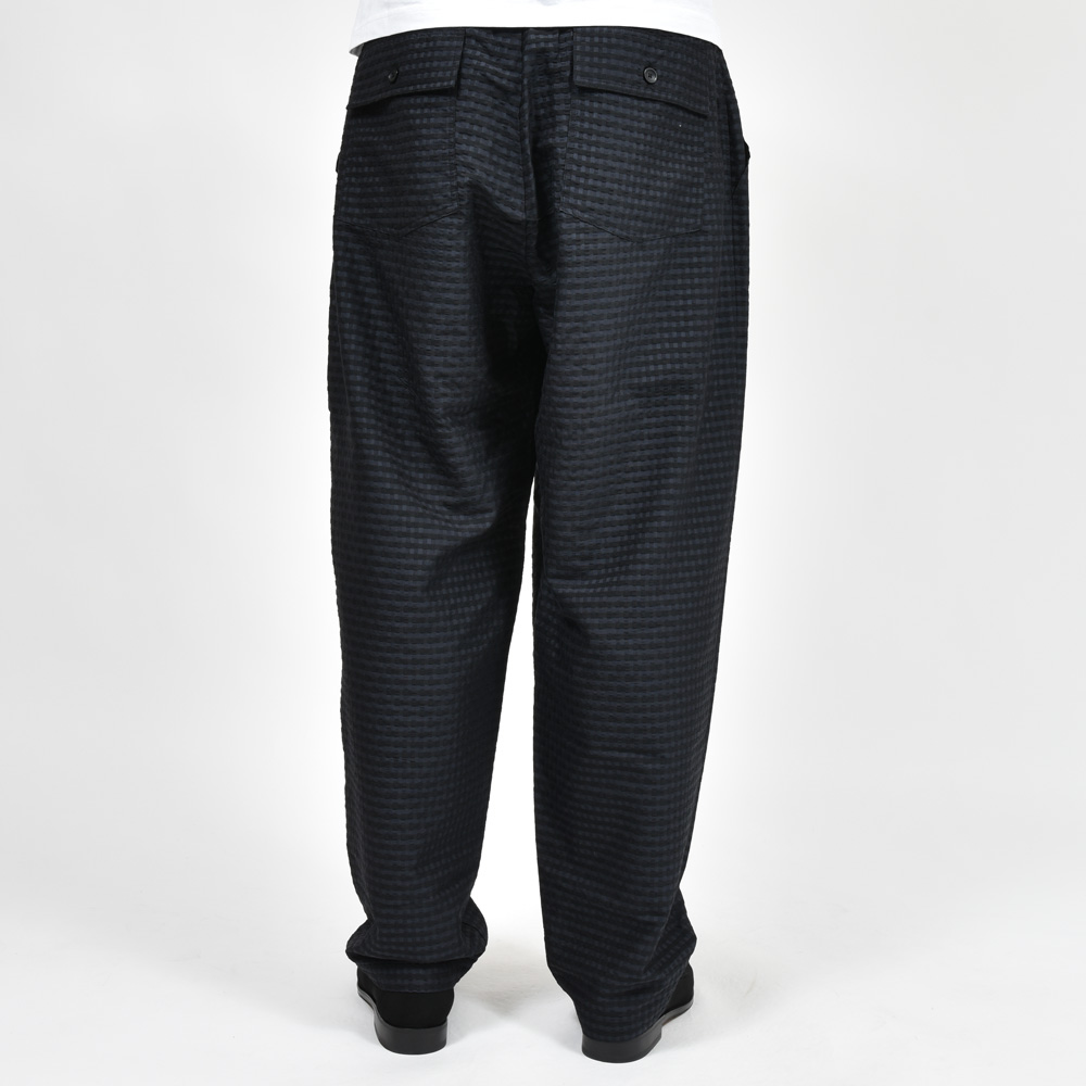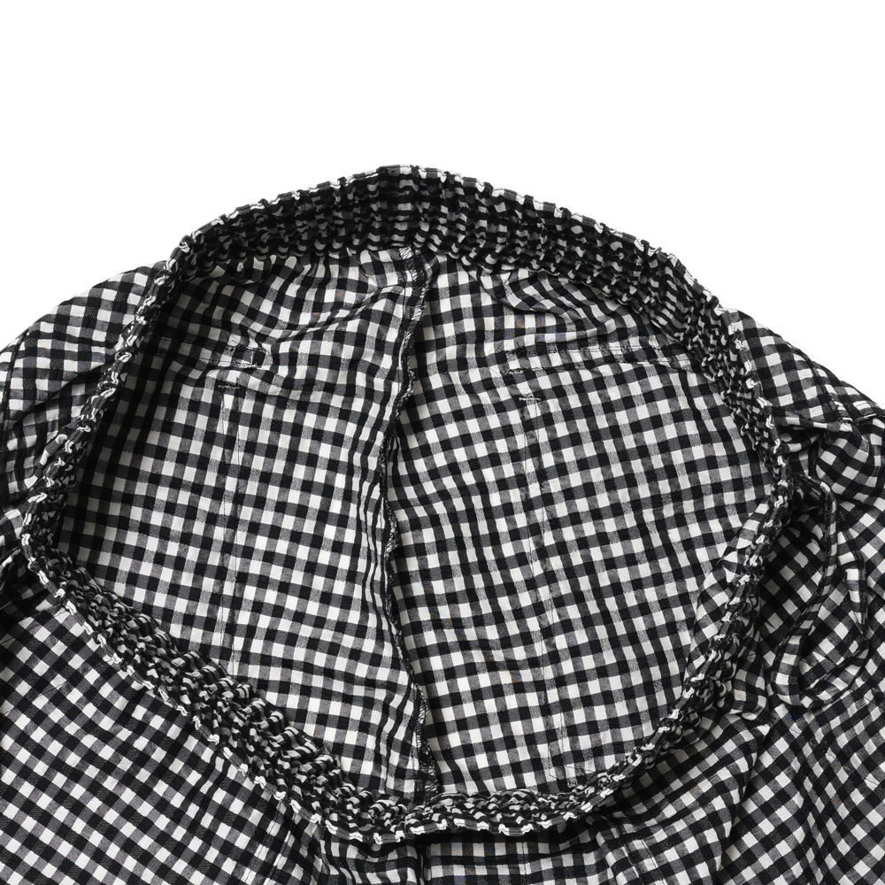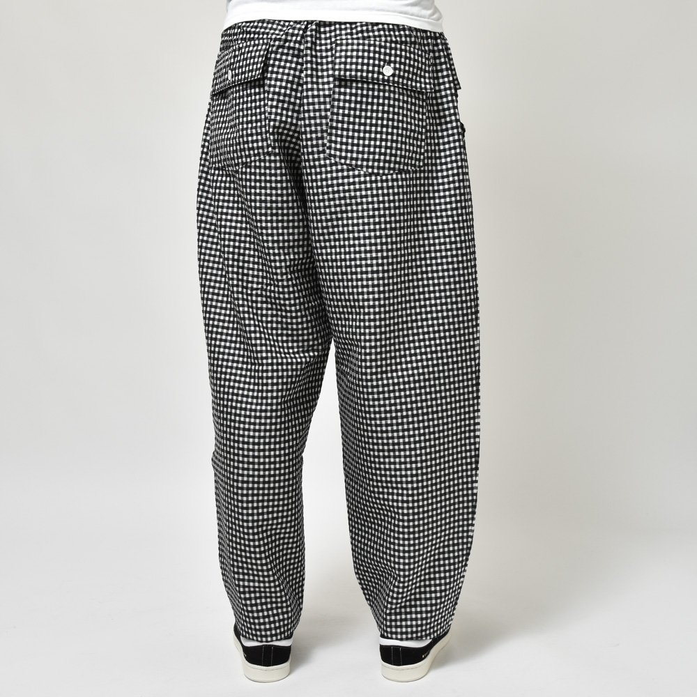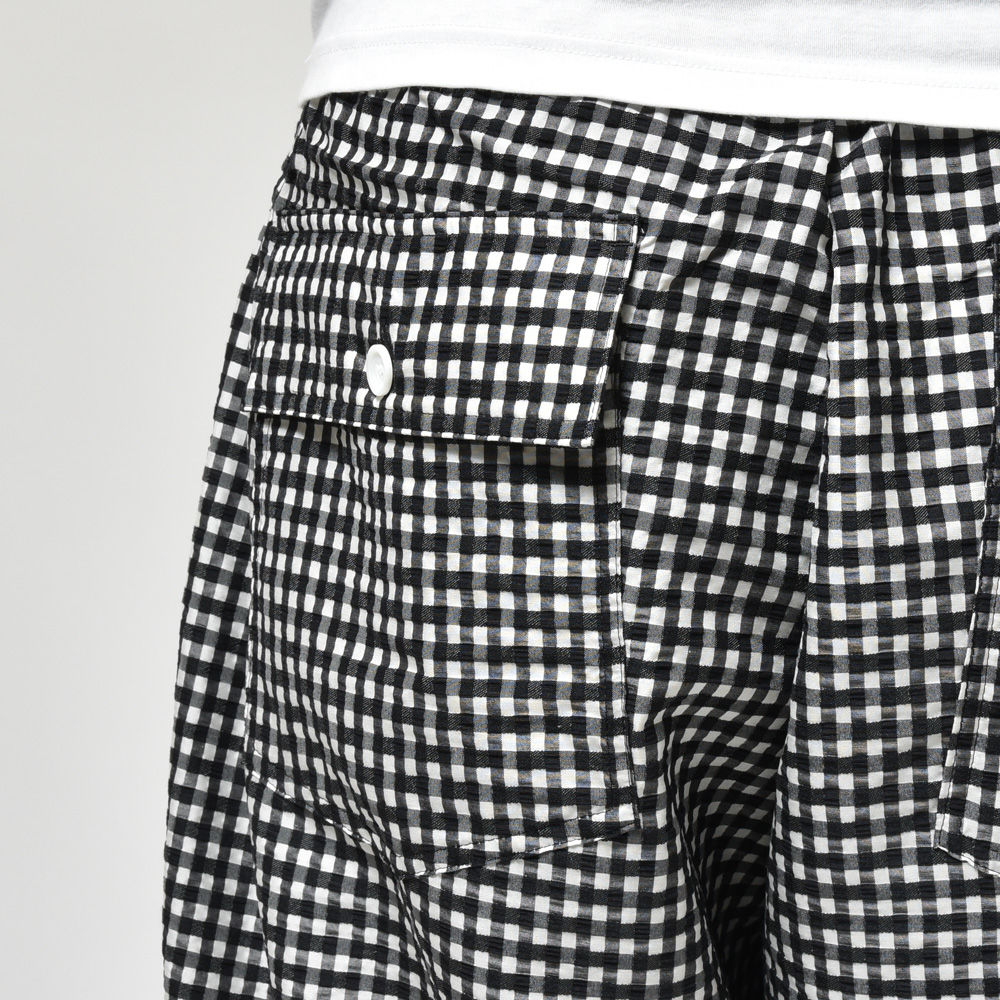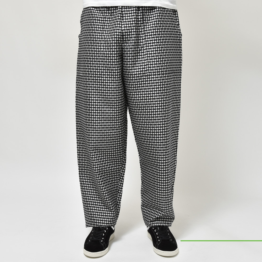 ギンガムチェックのパンツはどうしてもパジャマ系、もしくはコック系という感じになりますが、こちらは特別な素材使いということもありストリート、ほんのりモードの香りを漂わせる仕上がりです。