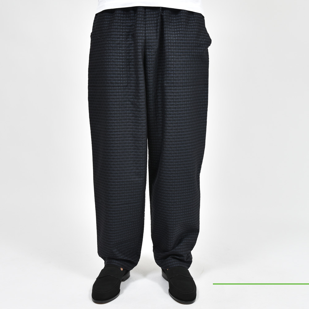 シルエットはバギーパンツようなワイドタイプになっています。裾に向かって緩やかにテーパードがかかっているのもポイント、ちなみにこのシルエットにこの生地の載せているのはbalconeのみだそうで結果的に別注扱いと相成りました。