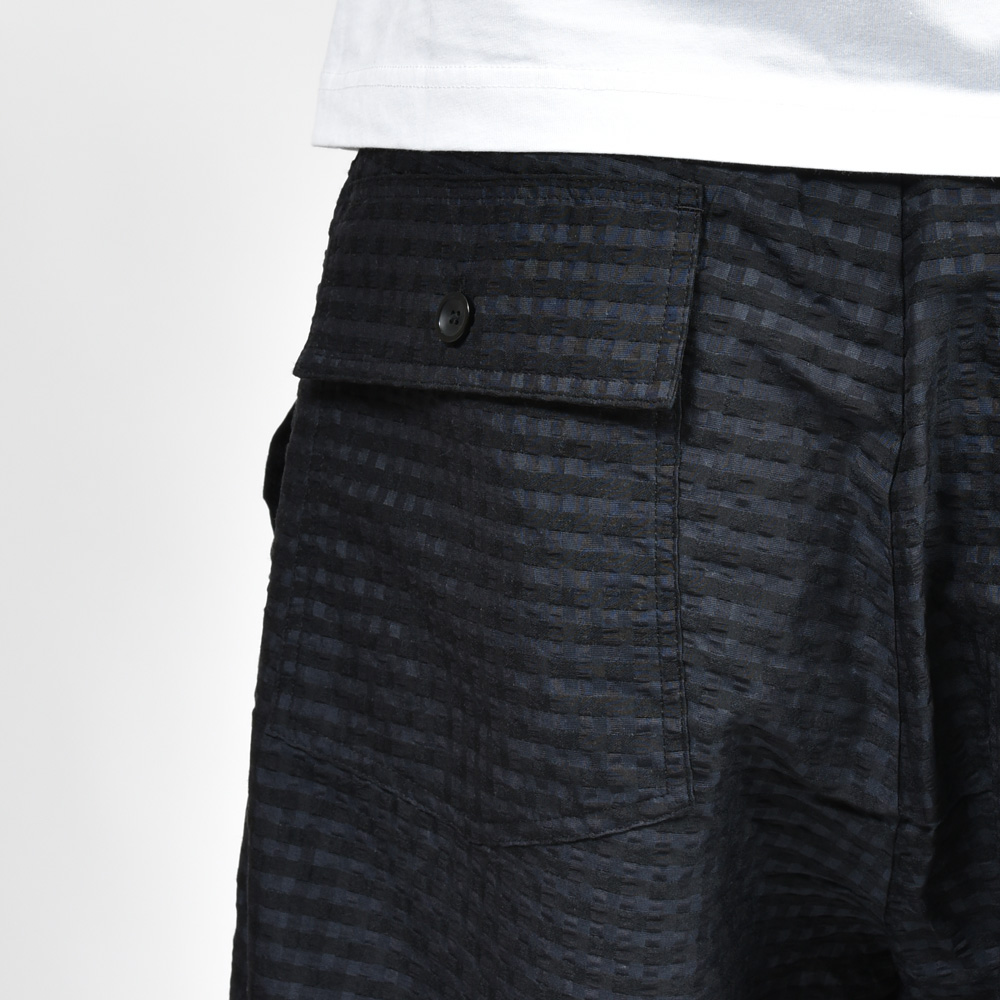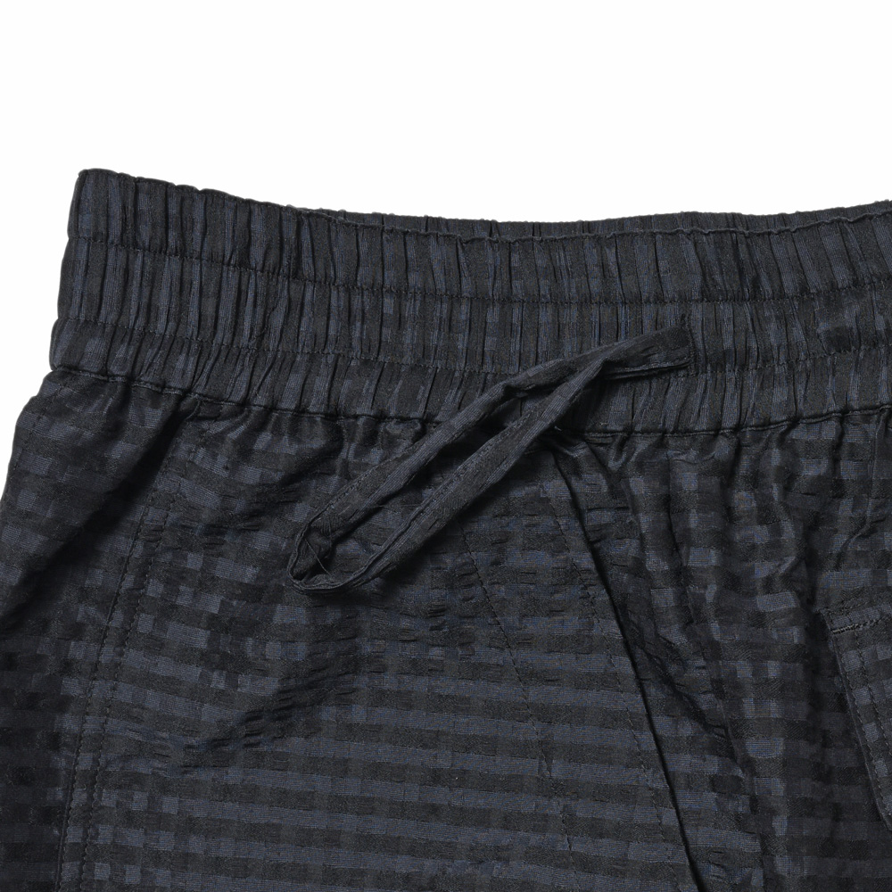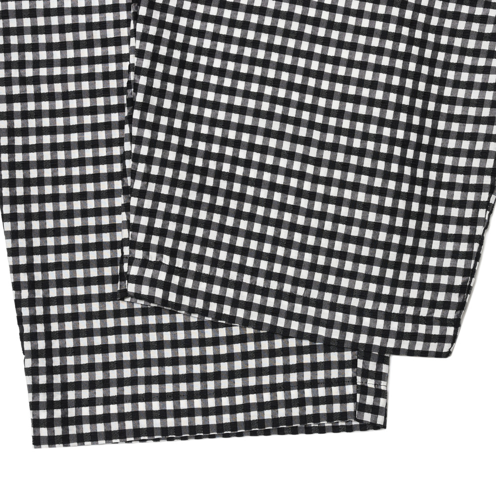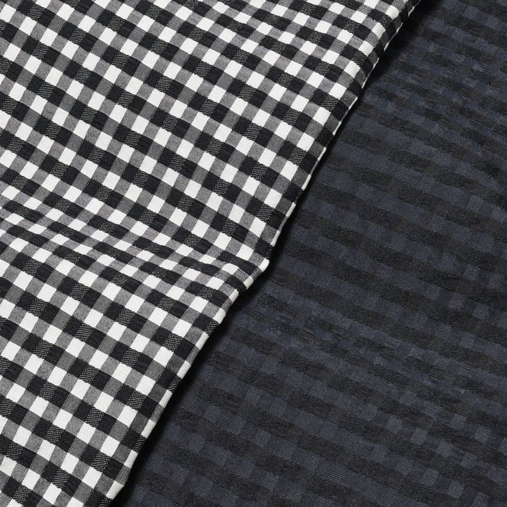 生地はシアサッカーのような凹凸のあるタイプで柄はギンガムチェックをセット、配色はモノトーンにすることでよりクールな雰囲気で着用していただける塩梅に。