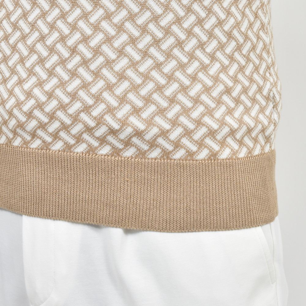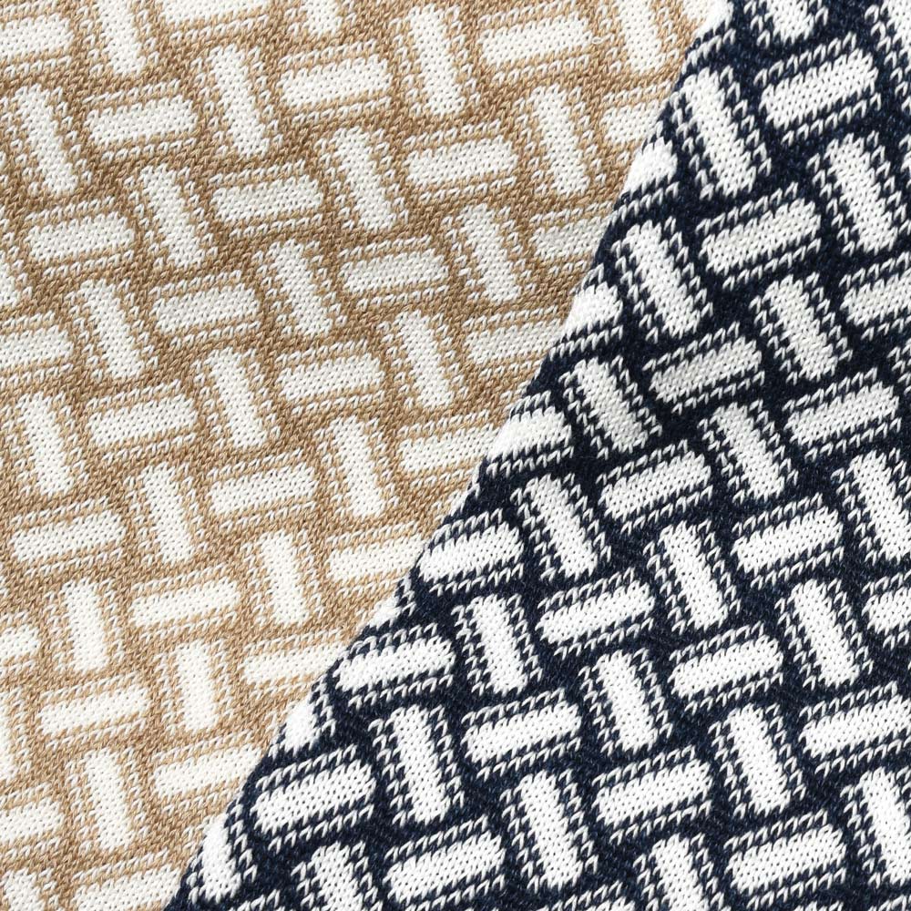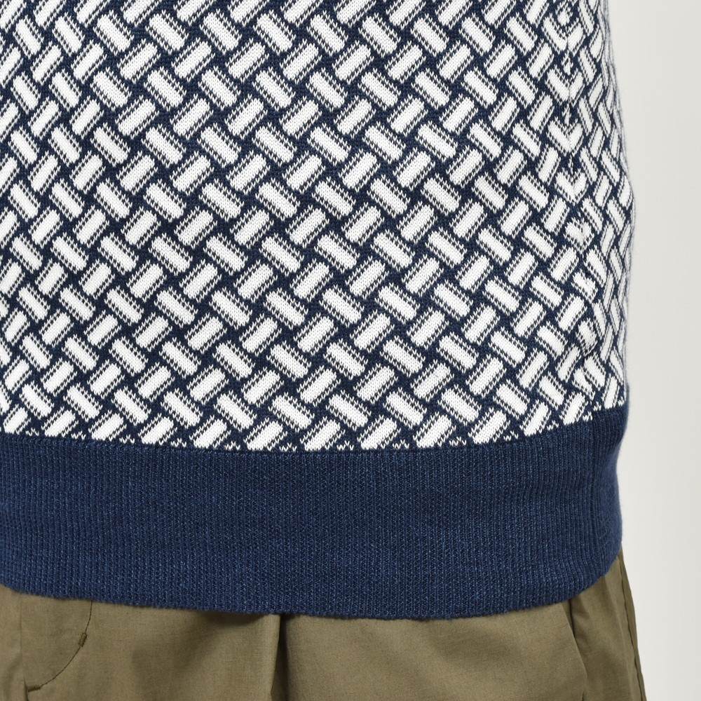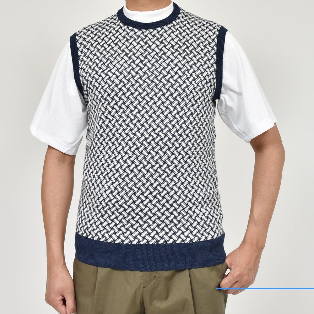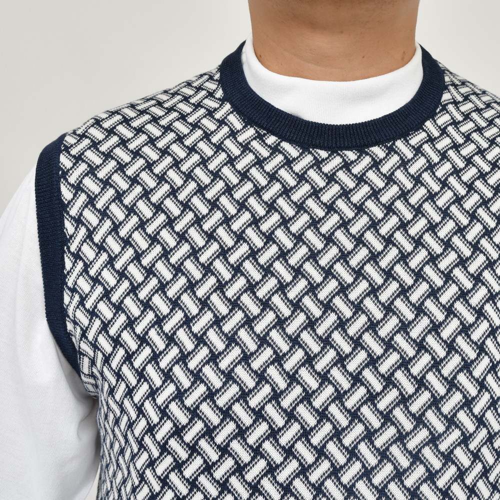 Drumohr伝統の模様でもある“ビスコッティ”柄をジャカード編みして作られたクルーネックベストで伝統柄でもあり斬新さも併せ持つ不思議な魅力があります。