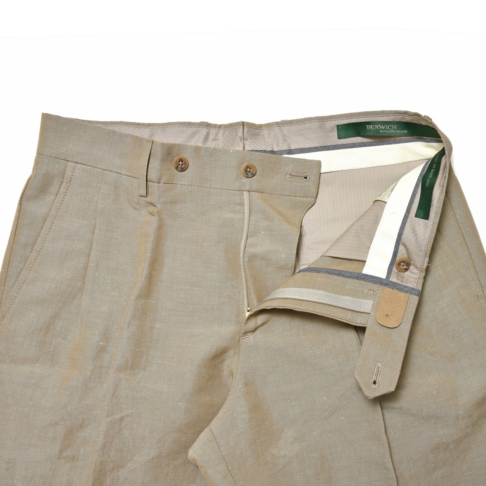 BERWICHではもはや定番ファブリックとなりましたコットンリネン生地を採用、コットンの肌触りの良さとリネン特有のシャリっとした質感の両方を併せ持つ素晴らしい生地で、ゆとりあるシルエットは汗をかきやすい時期でもベタつかず快適な穿き心地を実現。