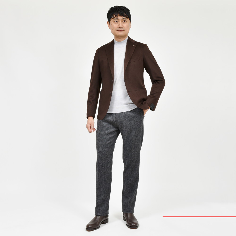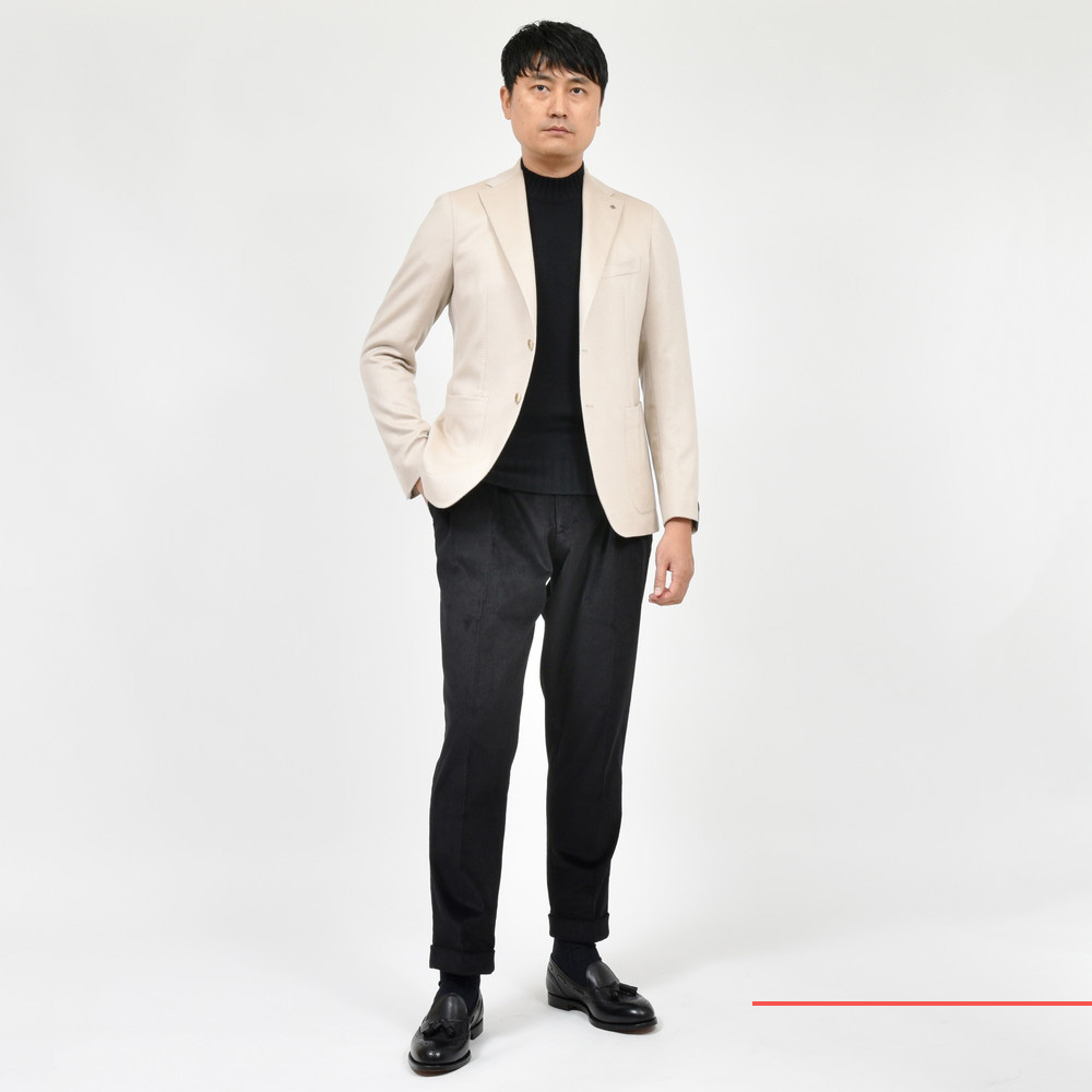 こちらはアウター程重く見えない、かといって軽さを重視しているわけではない中庸なバランスのカシミアサキソニーを採用。