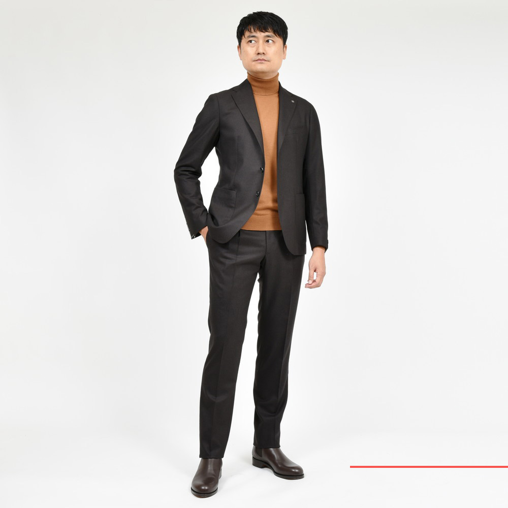 カシミアが入っていますがそれを全面的に押し出したタイプではありません、生地の雰囲気形成に一役買ってくれている印象です。副資材を極力使用しないモデルなので着心地は非常に快適、それでいて見栄えはキリッとシャープになっています。