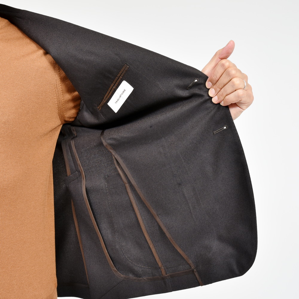 ダークな色味はベタっとした見え方になるとチープ感が出ますので、この生地のような深みと奥行きがあると格段に見え方が良くなり、類稀な品格が備わるんです。