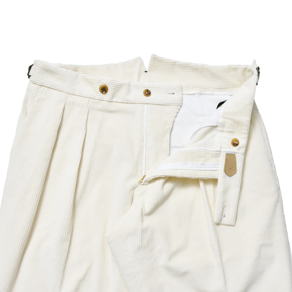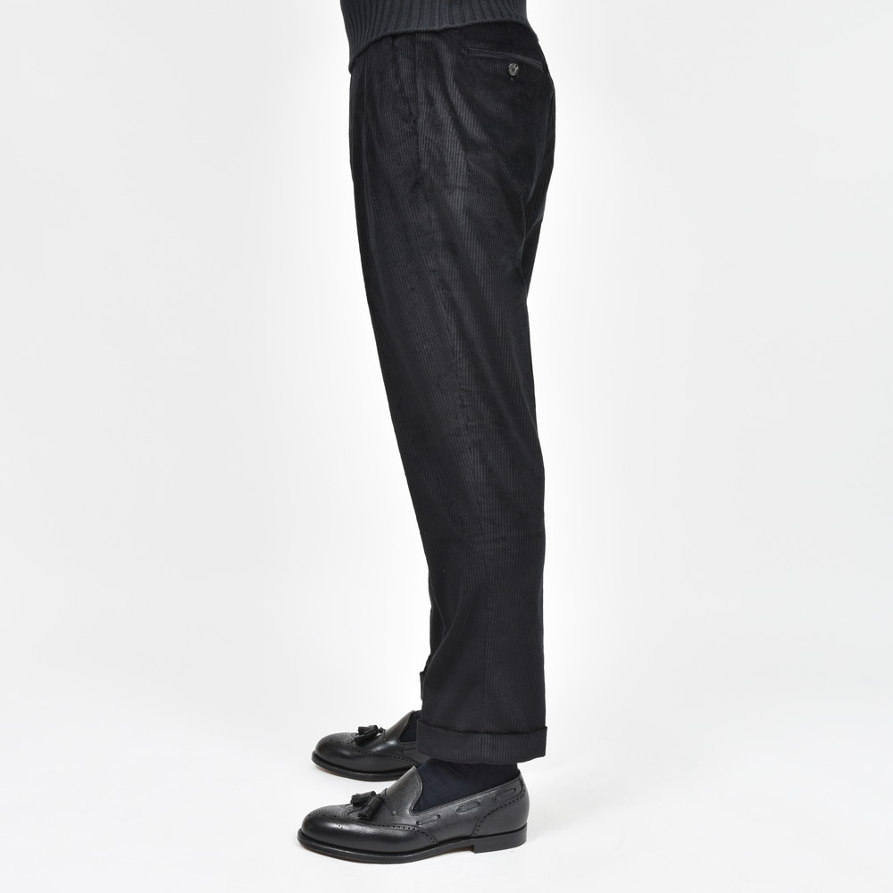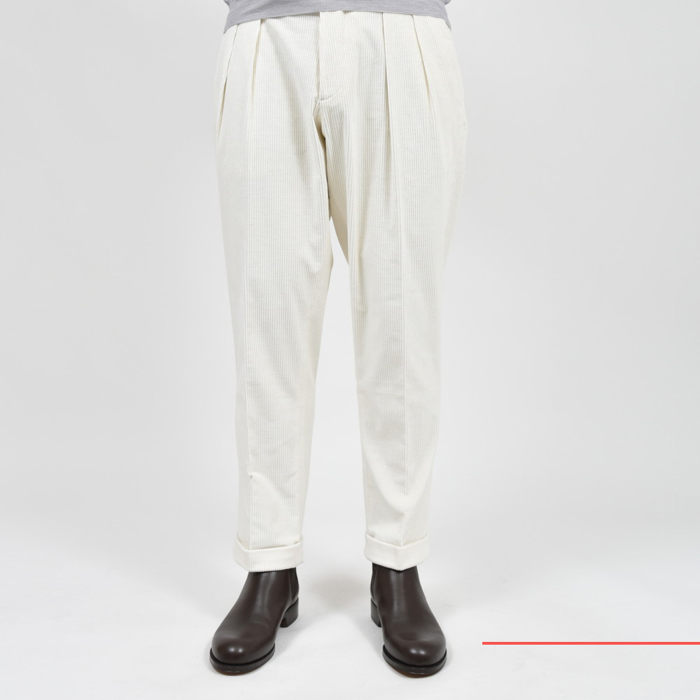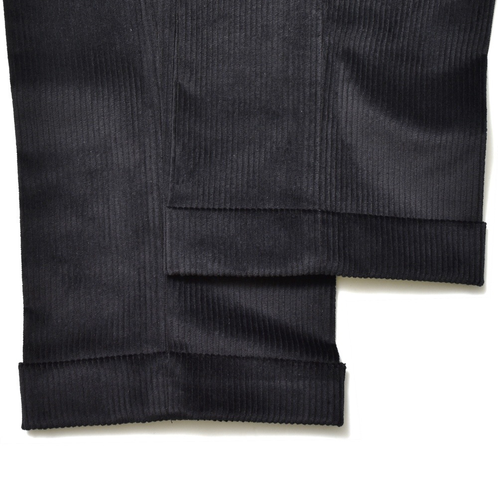 秋冬シーズンに欠かせない素材であるコーデュロイ、畝の感じはやや太めの印象でしょうか。シルエットのバランスも相まって他にはないムードが立っています。