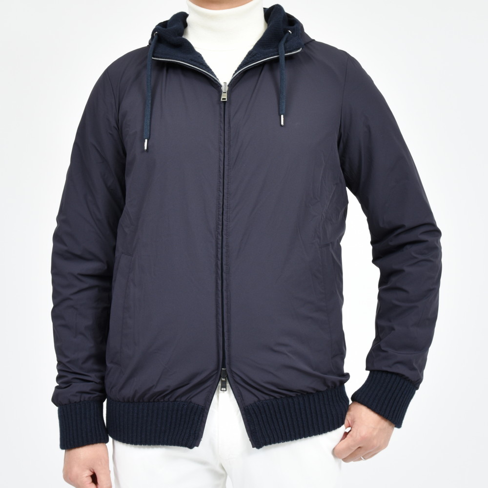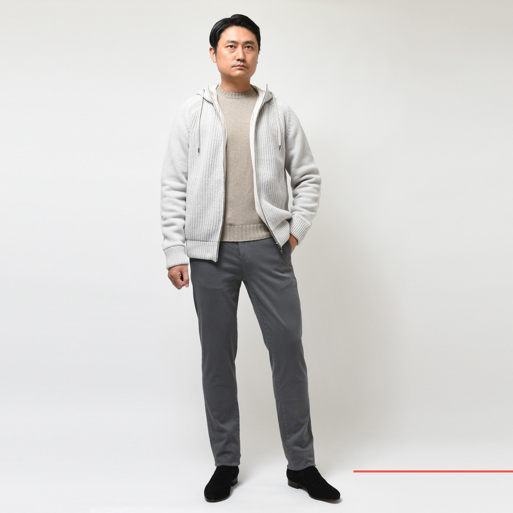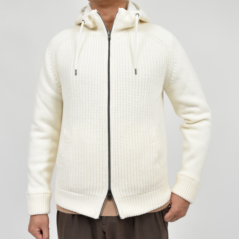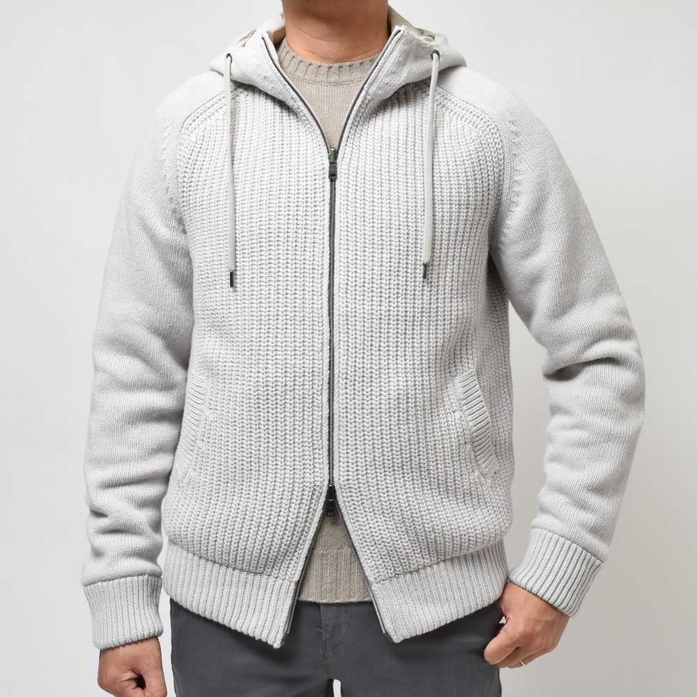 HERNO(ヘルノ)が提案するジップフーディーは、得意としているニットをアウター的に用いるアイディアによって仕上げられています。