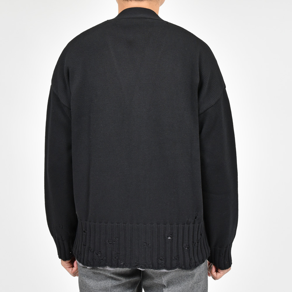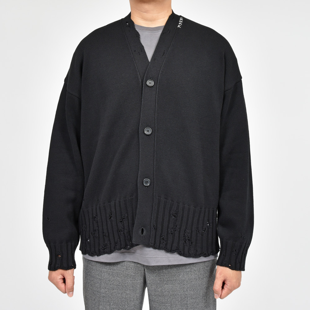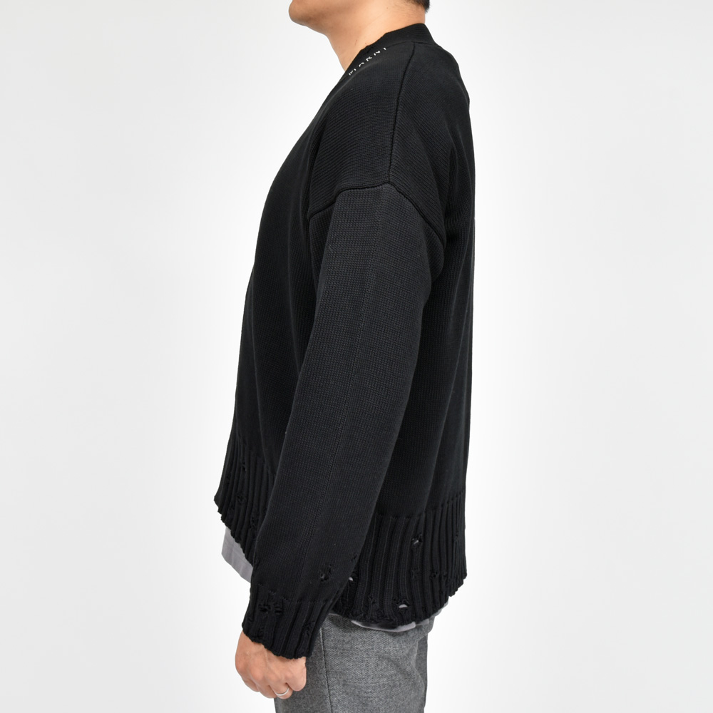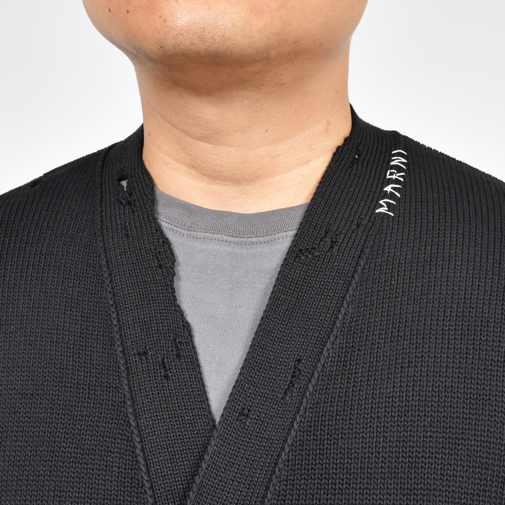 MARNI(マルニ)のダメージニットカーディガン、ここ最近定番的な存在となっているアイテムです。アイテムとしてはベーシックなんですが襟周りや裾リブ部分にダメージ風の穴あきを施すことによってファッション性を高めています。