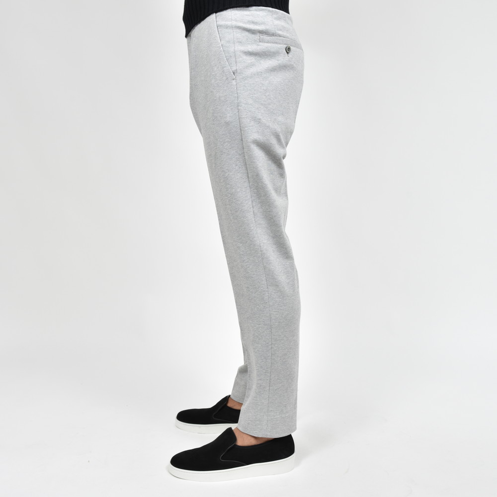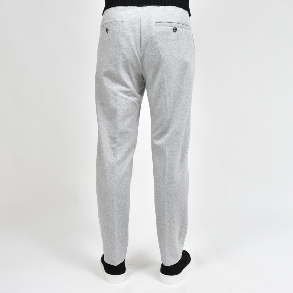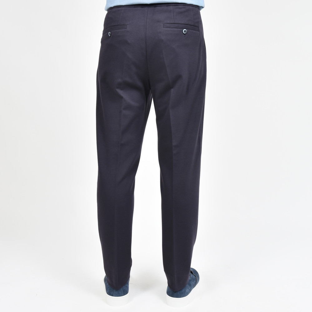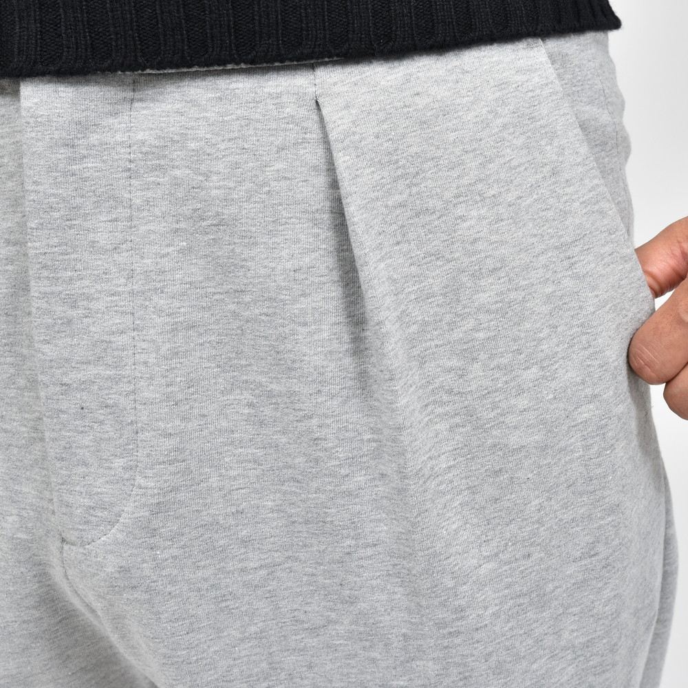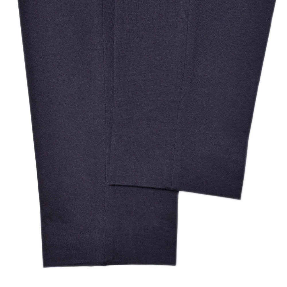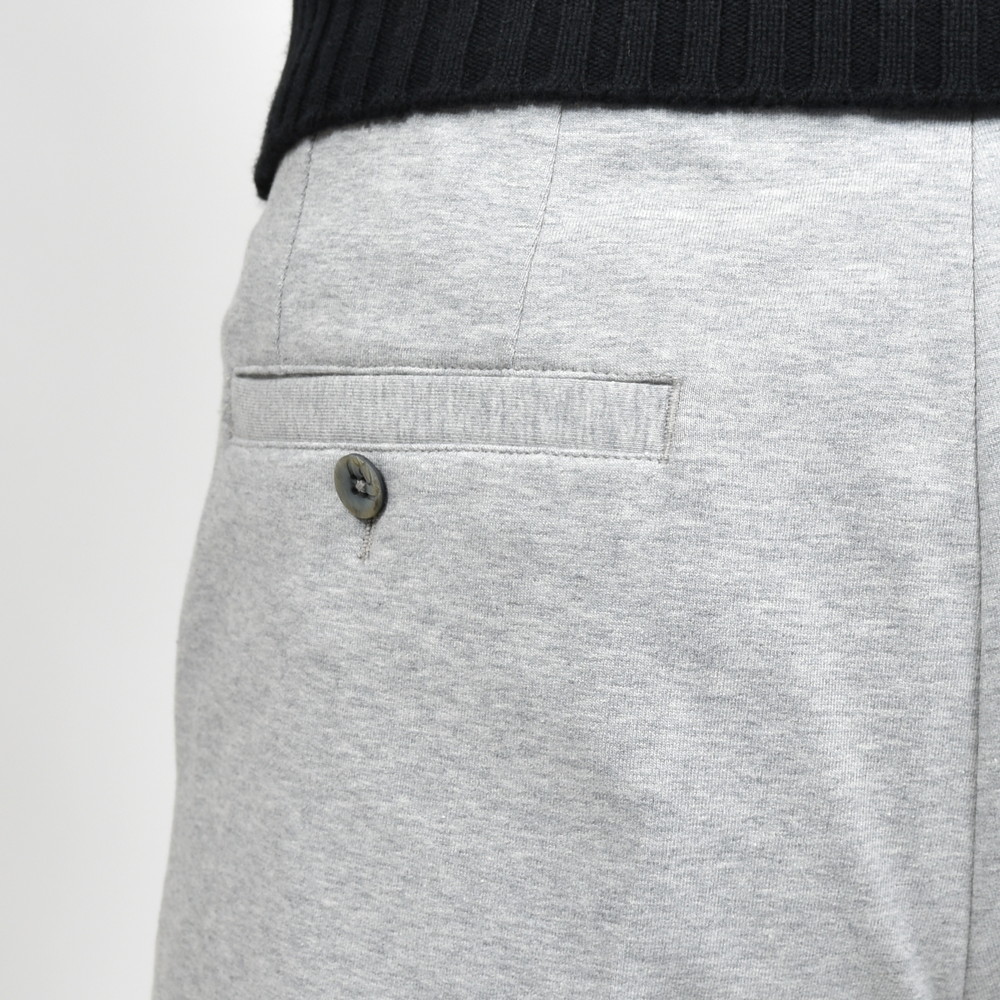 プリーツの入れ方やヒップポケットの玉縁などクリーンで上品な見え方になっているんですが、ウエストをシャーリングにすることで快適性が高められていますし、何よりキックバックの強いジャージ生地を用いることで膝の曲げ伸ばしなどがすこぶるストレスフリーなんです。