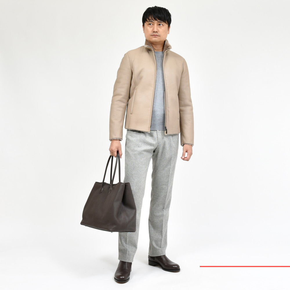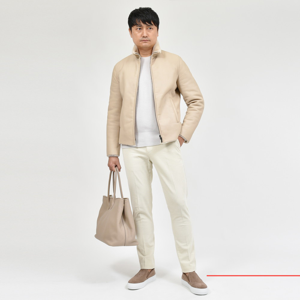 エレガントなんですがエレガンス過ぎない感じなんです、アイテム自体は至ってシンプルなスタンドカラーのブルゾンなので合わせも難しくありません。私ムートン着てますよ〜という主張が前に出過ぎず、それでいて品格はキープされているのもポイント。