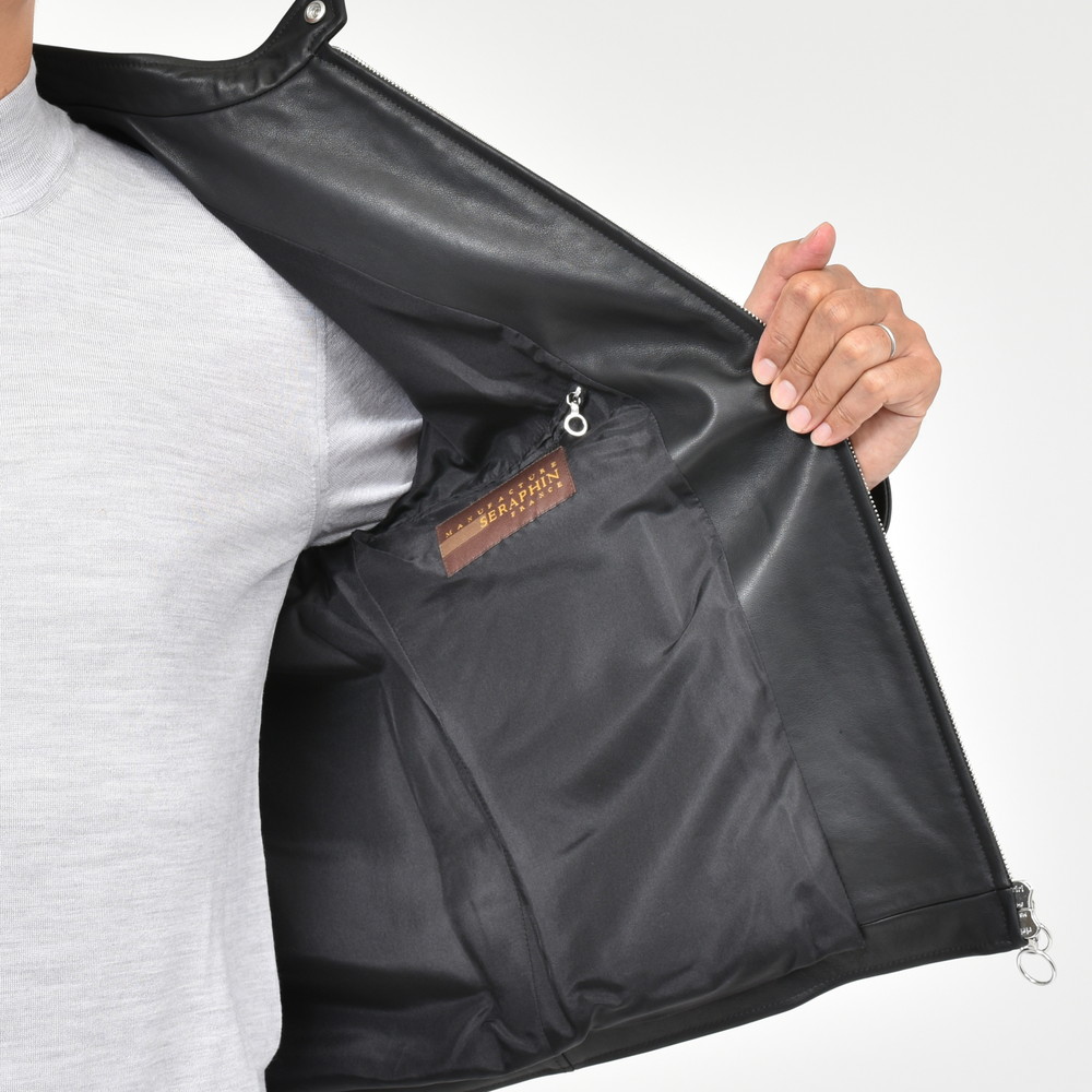 シルクの様にしなやかで、着ていることを忘れるくらいに着心地が良いラムレザーを用いることが最もSERAPHINらしいエレガンスであるとは今も思っていますが、ちょっと趣向を変えて、ややタフさをプラスすることで生まれるライダース本来のニュアンスも楽しみたいな・・・という事でこの素材を選んでいます。