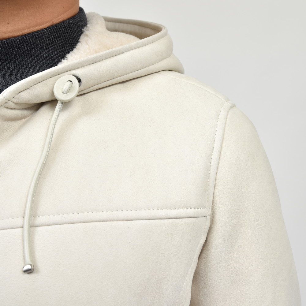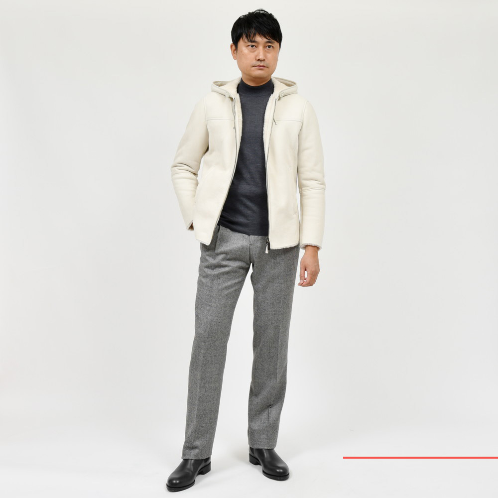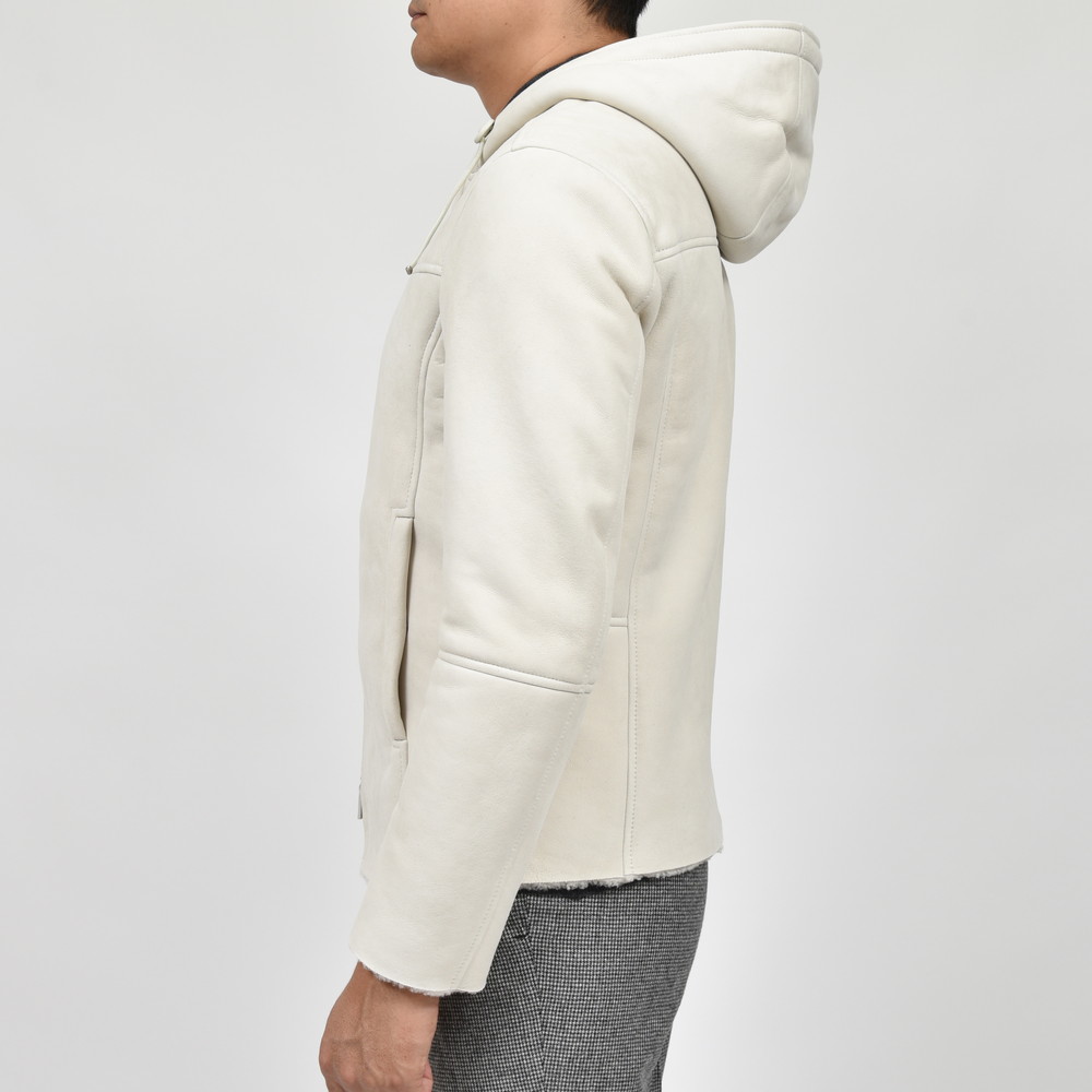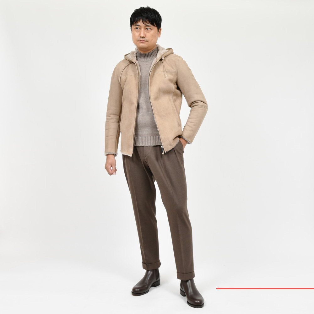 ムートンのフードブルゾン、スポーティ&ラグジュアリーですね、、、いやもう本当に溜息が出るぐらい良いものです。革のタッチや色出しのセンスが素晴らしいのは勿論のこと、立体感のあるフードやドローコードのデザインなんかも綺麗に整えられています。