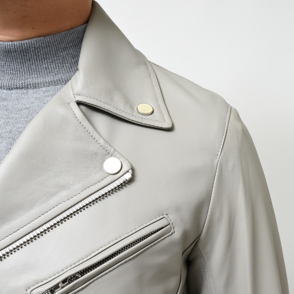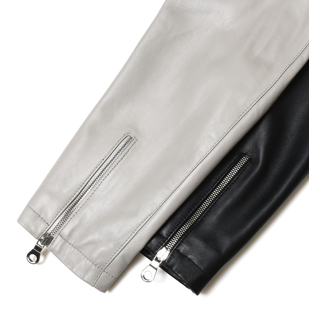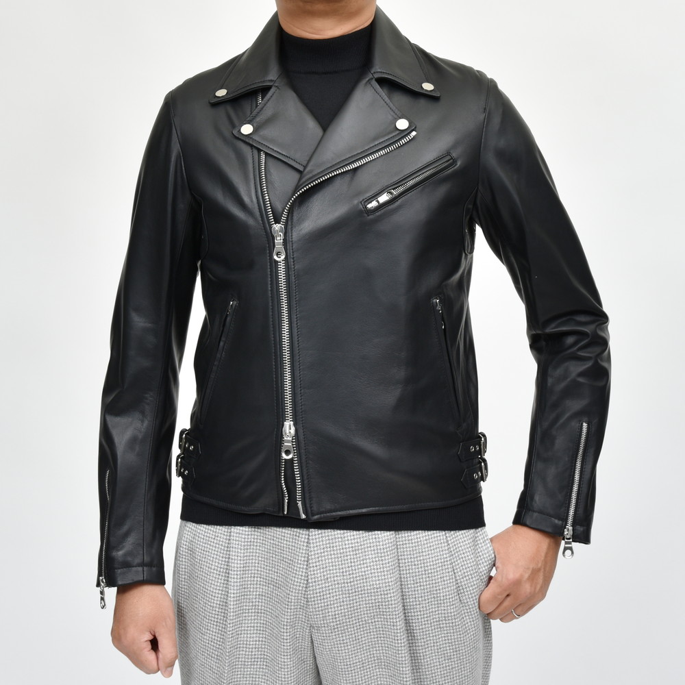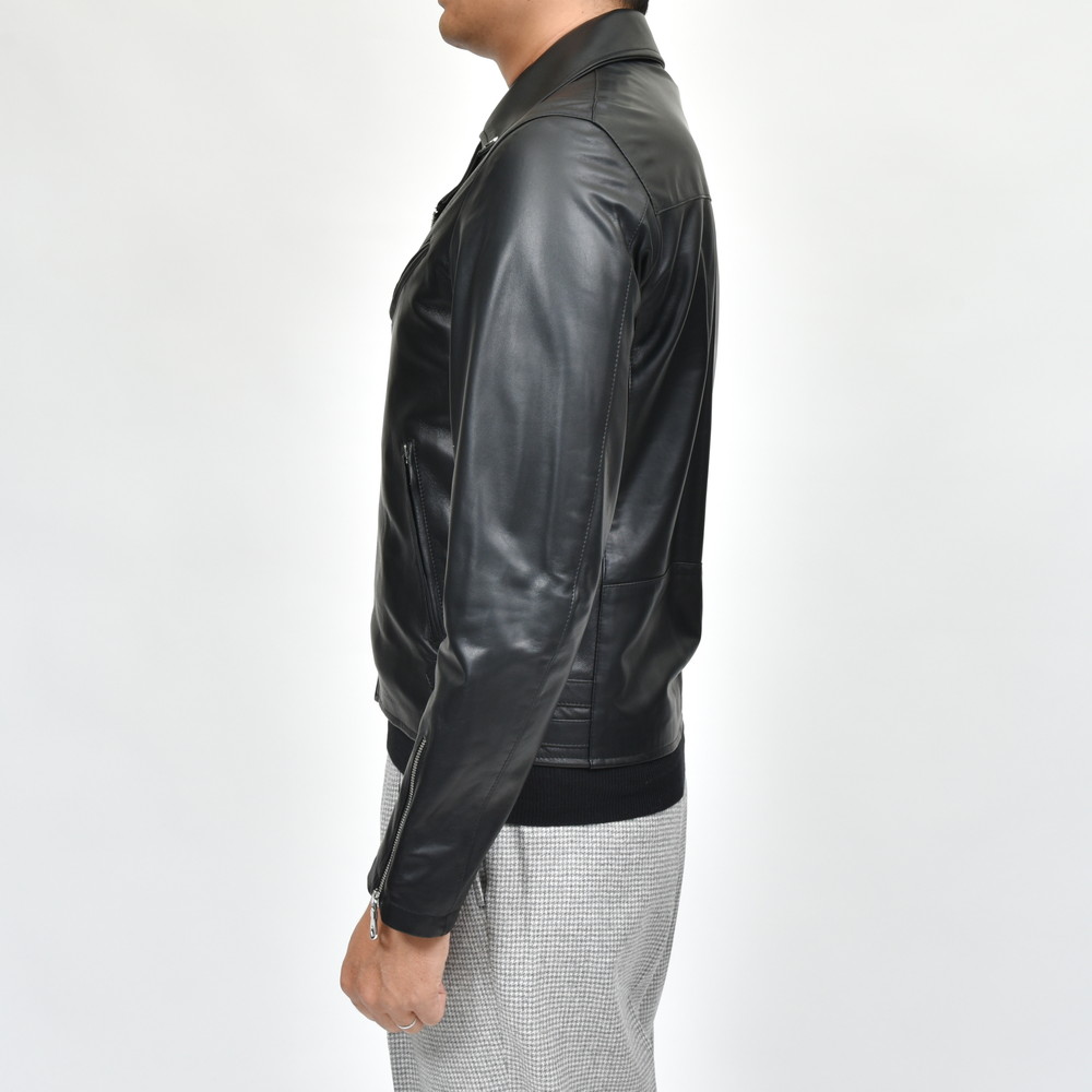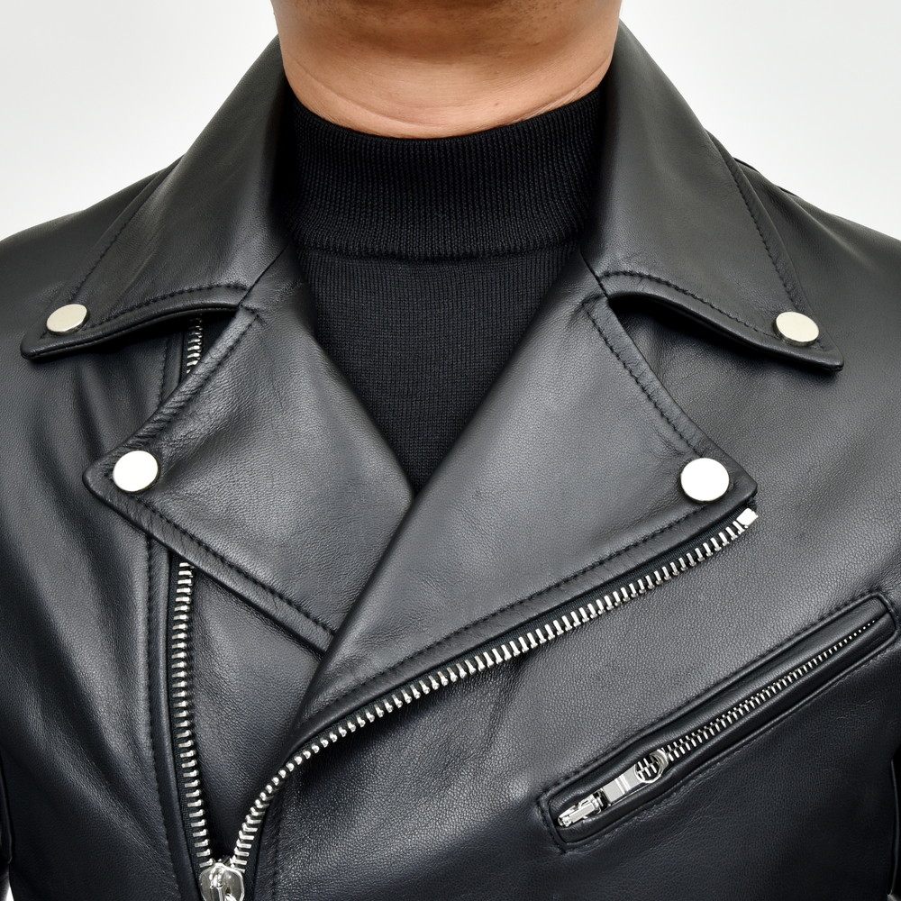 素材は通年着られる薄手のラムレザーでして、厚みは0.6mm。非常にしなやかで馴染みが良く、重さも感じないので着心地的にも◎であり、大人が無理なくスマートに着られるライダースといえるのではないでしょうか。