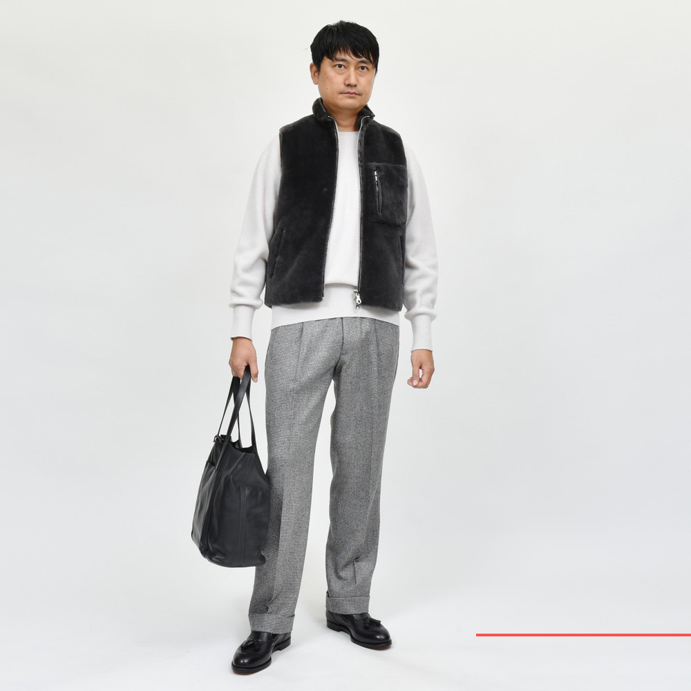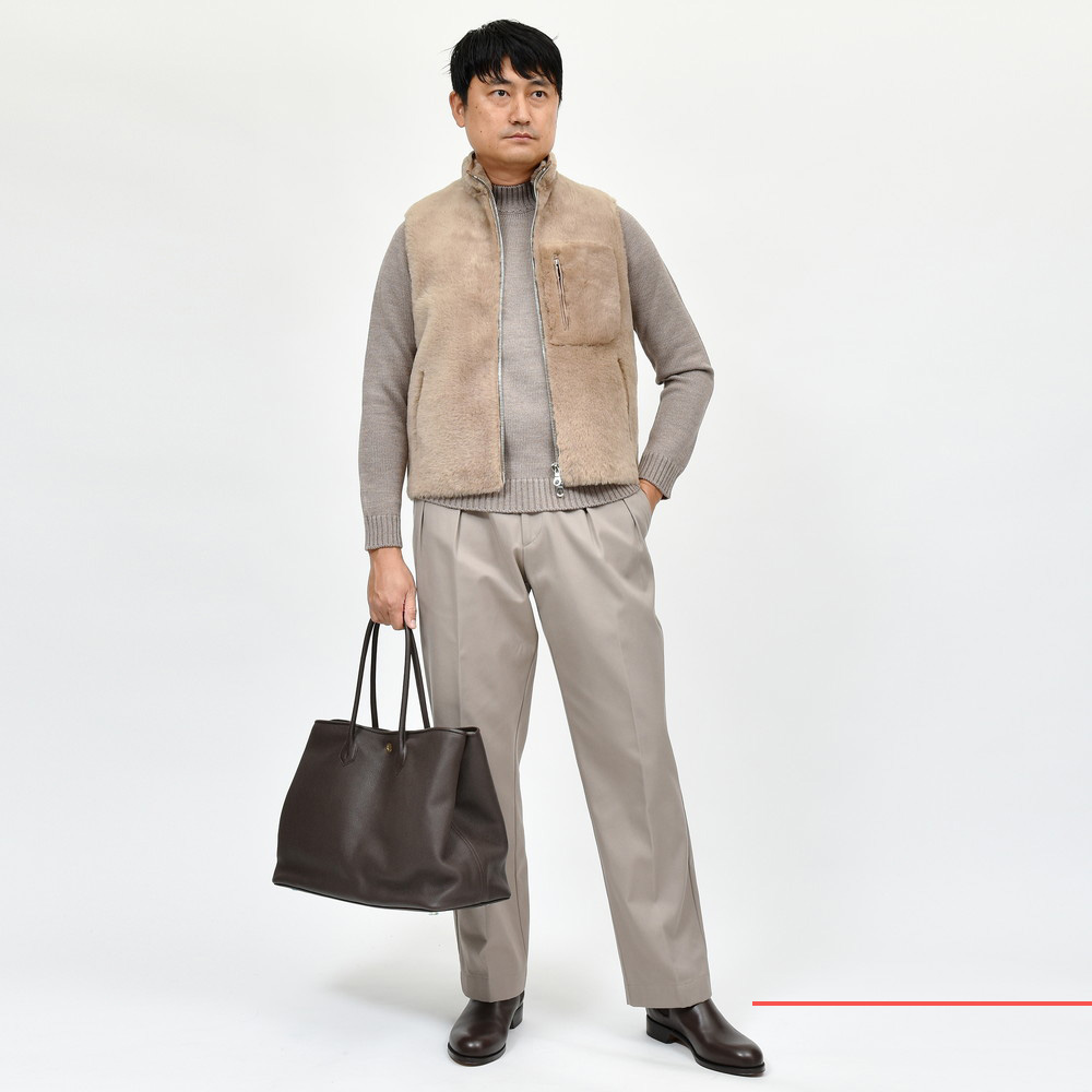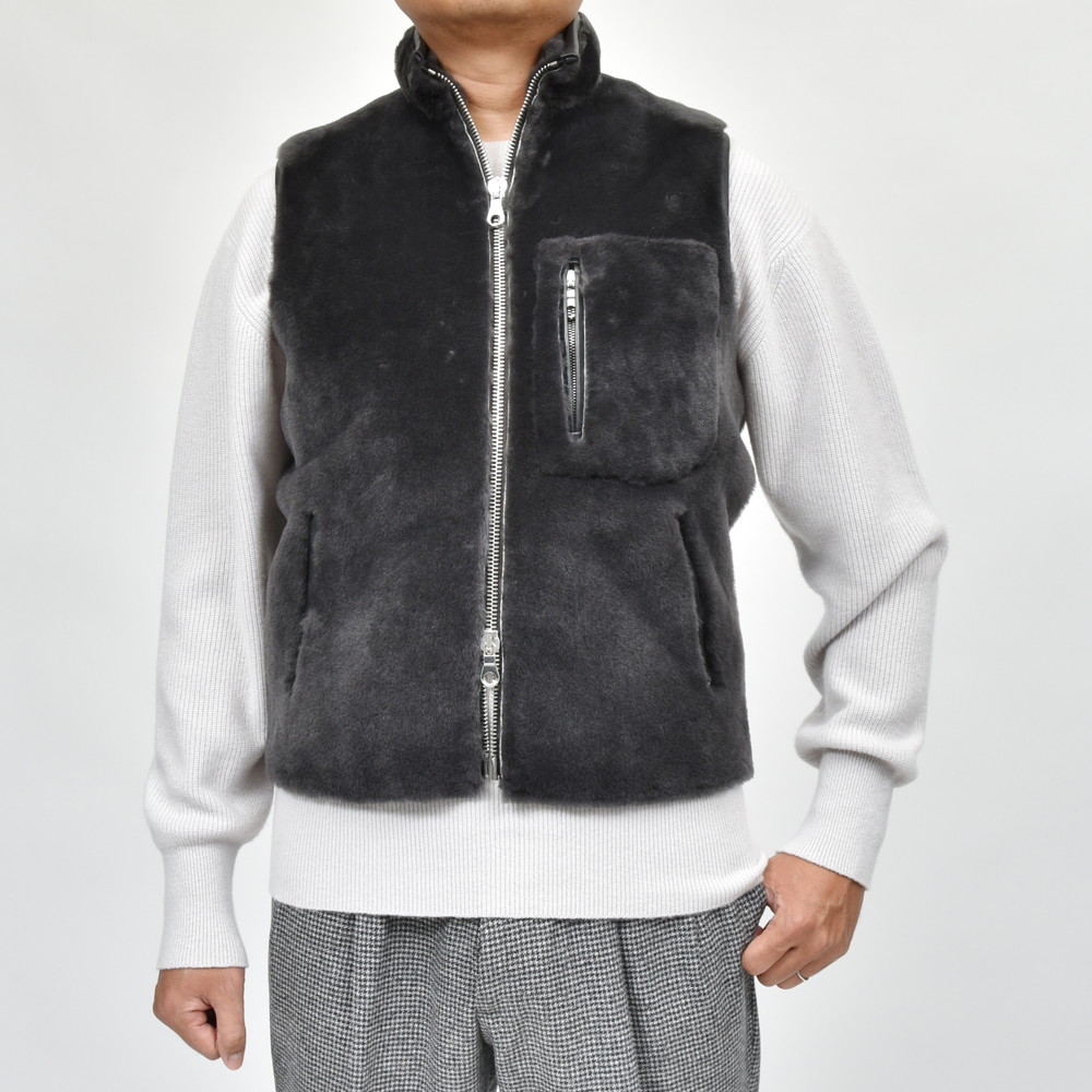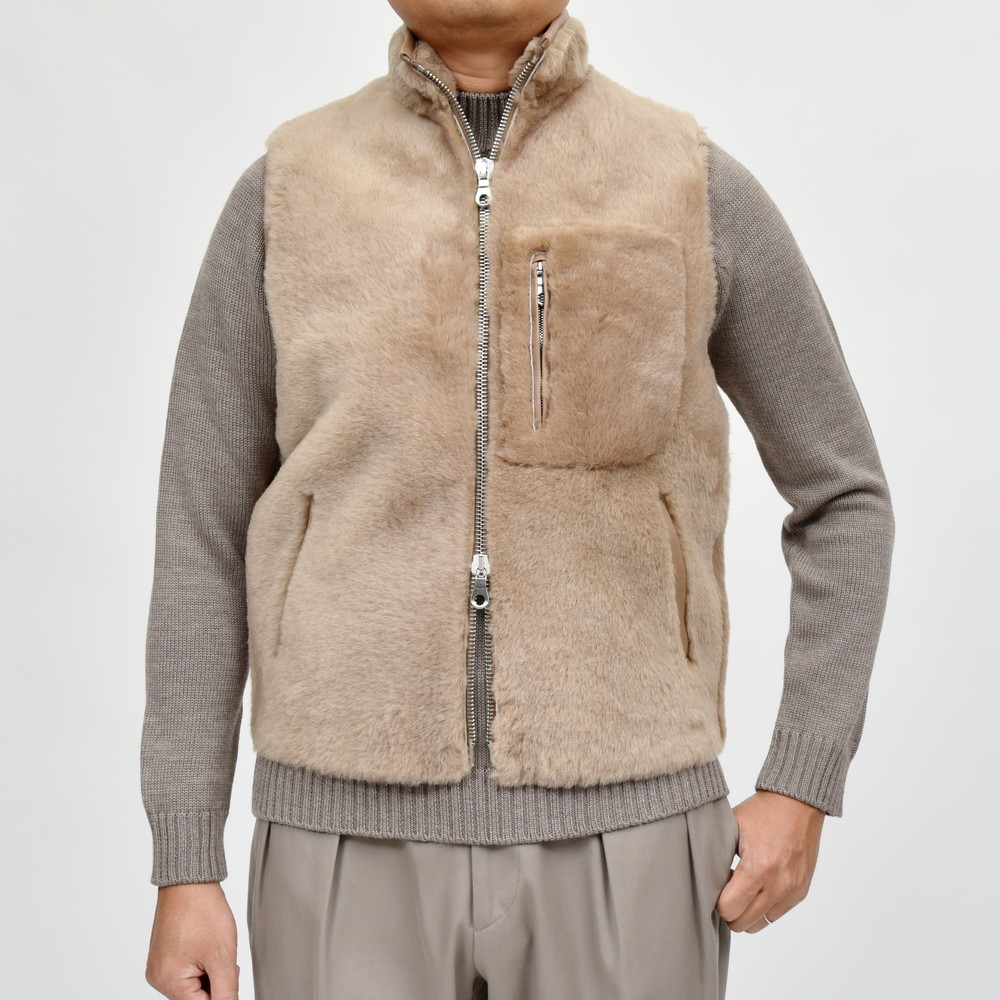 Cinquanta(チンクアンタ)がアレンジするアウトドアベストは上質なムートンを使用し、パイピングや気品あるメタルジップを用いることでラグジュアリーなテイストに昇華しています。