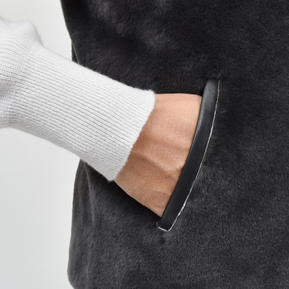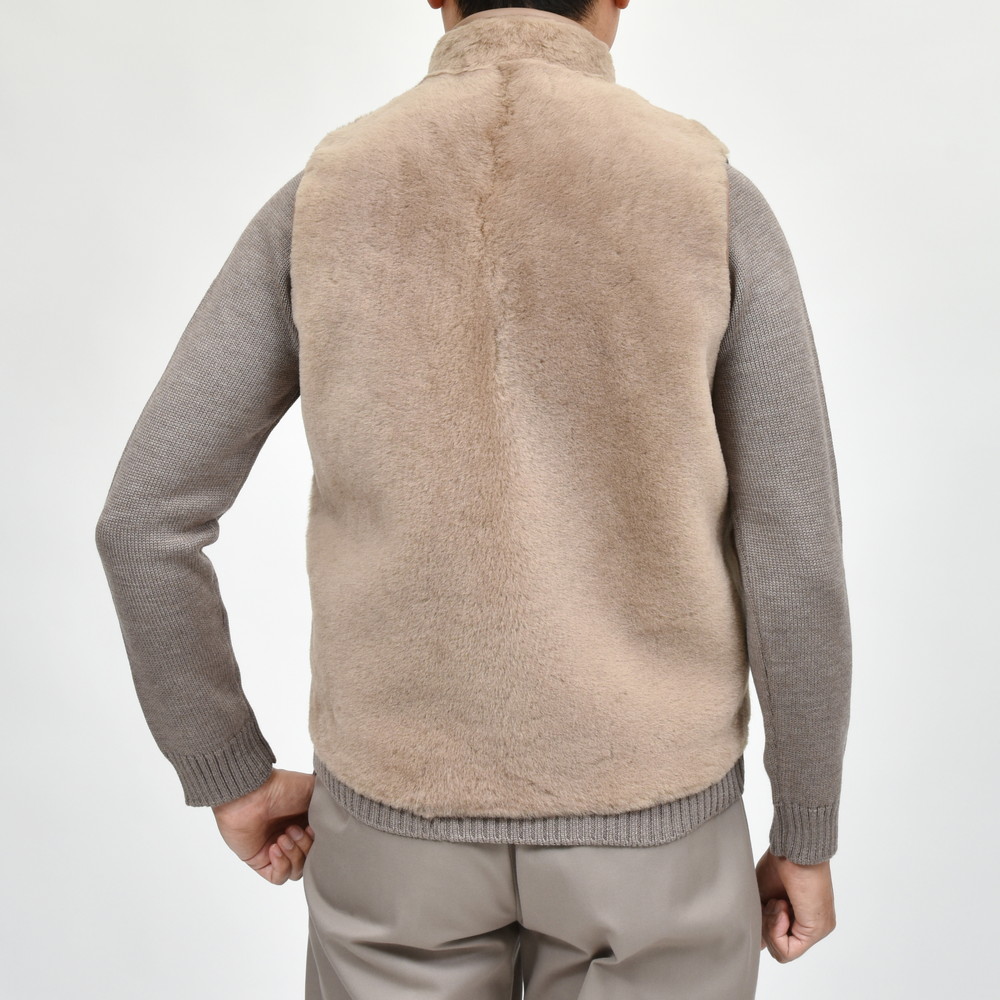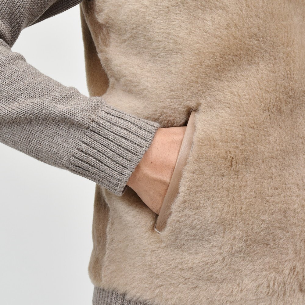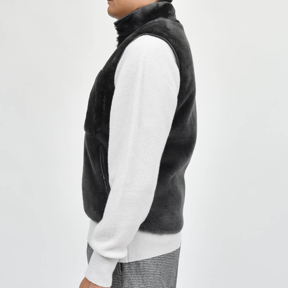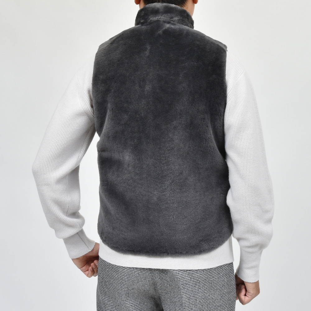 Cinquanta(チンクアンタ)がアレンジするアウトドアベストは上質なムートンを使用し、パイピングや気品あるメタルジップを用いることでラグジュアリーなテイストに昇華しています。