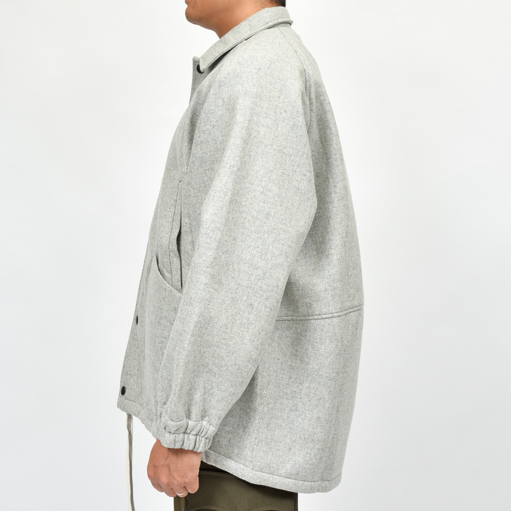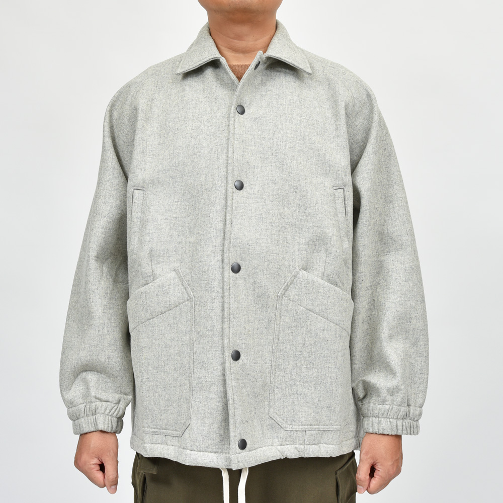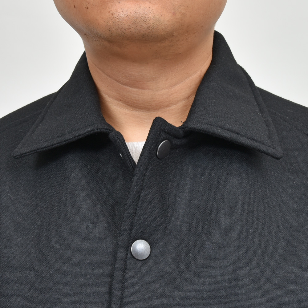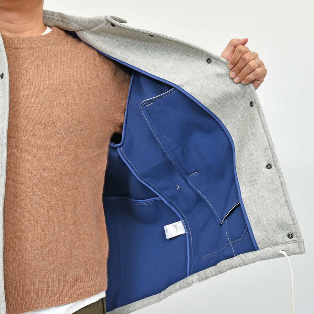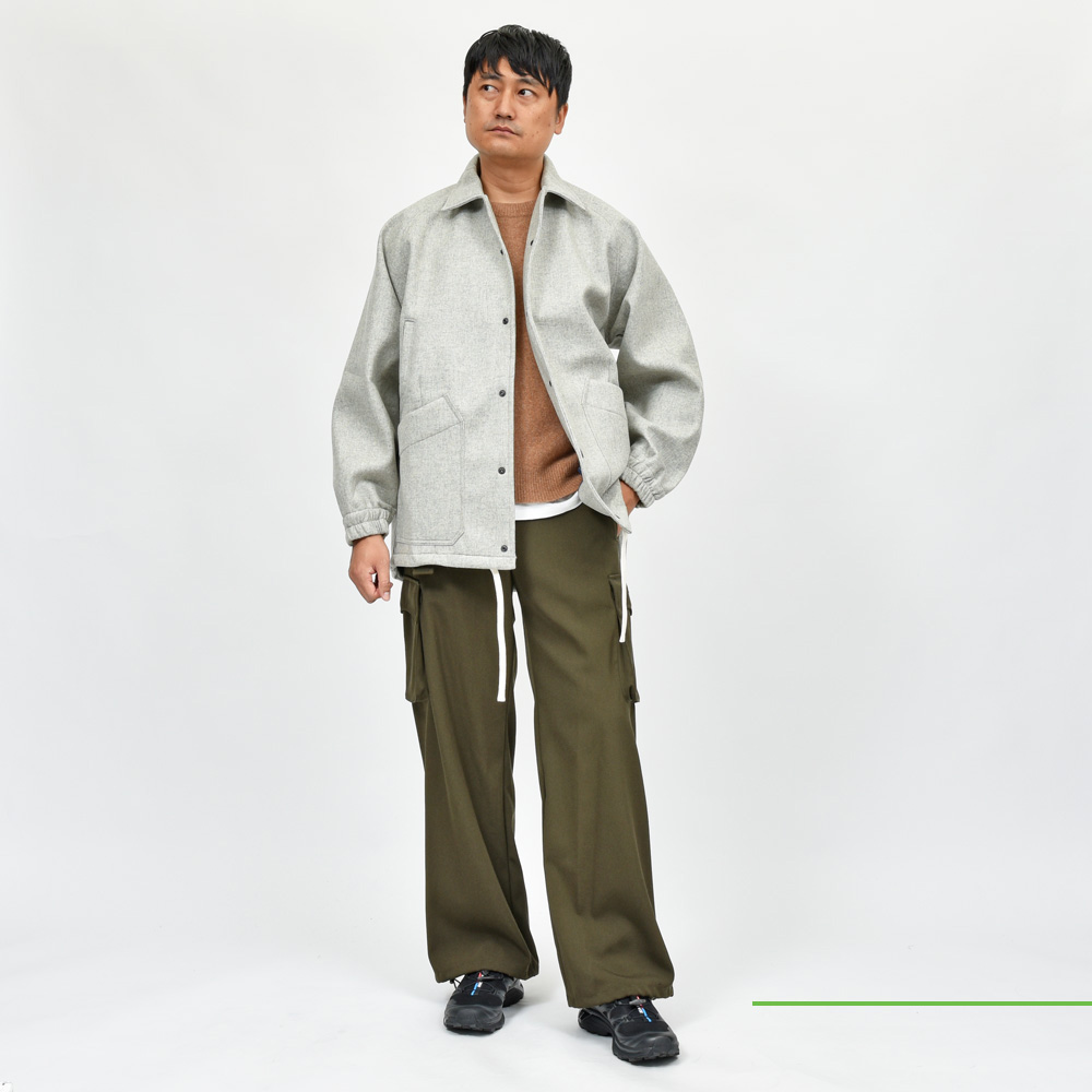 rdv o globe(ランデヴー オー グローブ)では定番的にリリースされるコーチジャケットデザインのアイテム、今回はウール素材に丸みを持たせたシルエットの一着になっていましてらしさ溢れるものになっています。