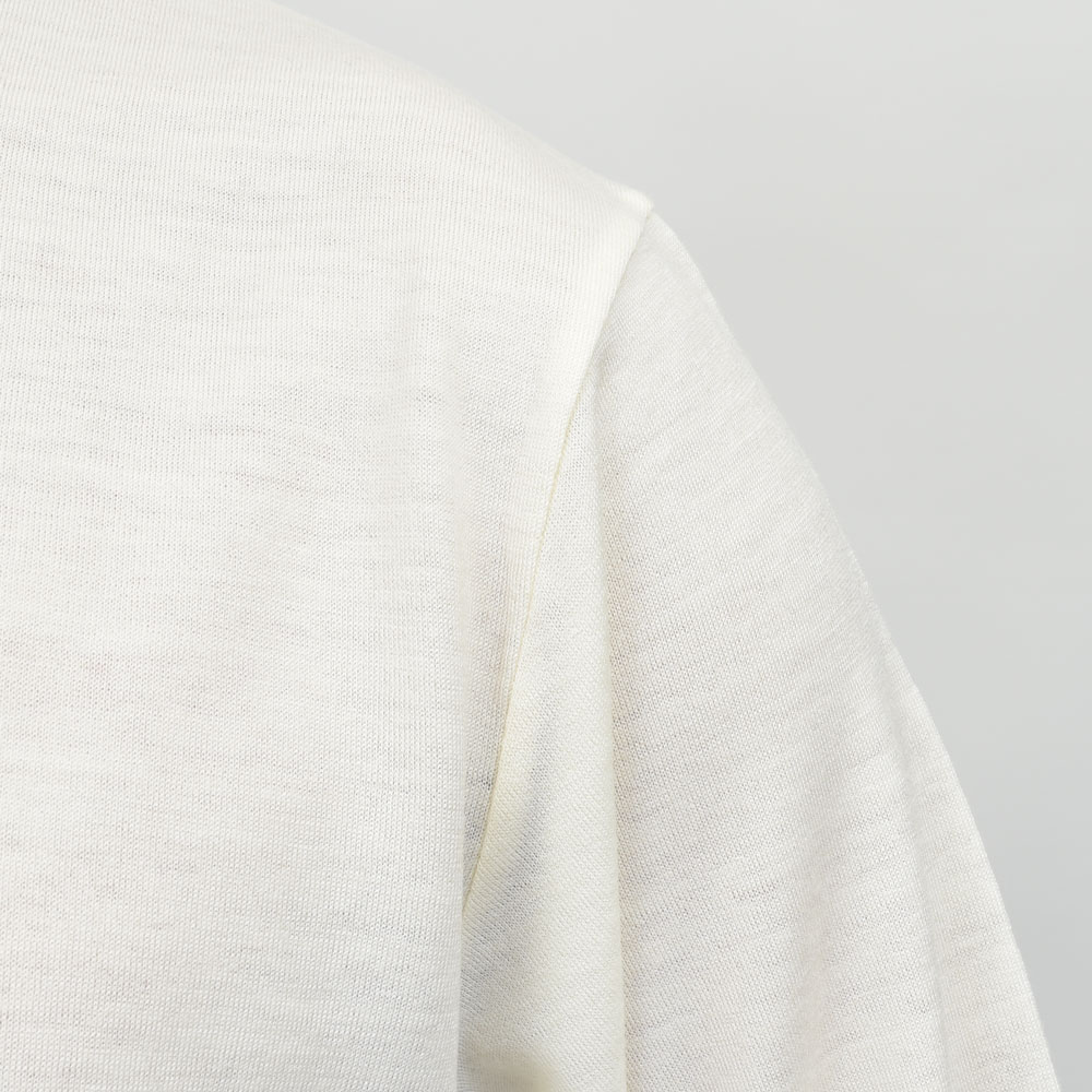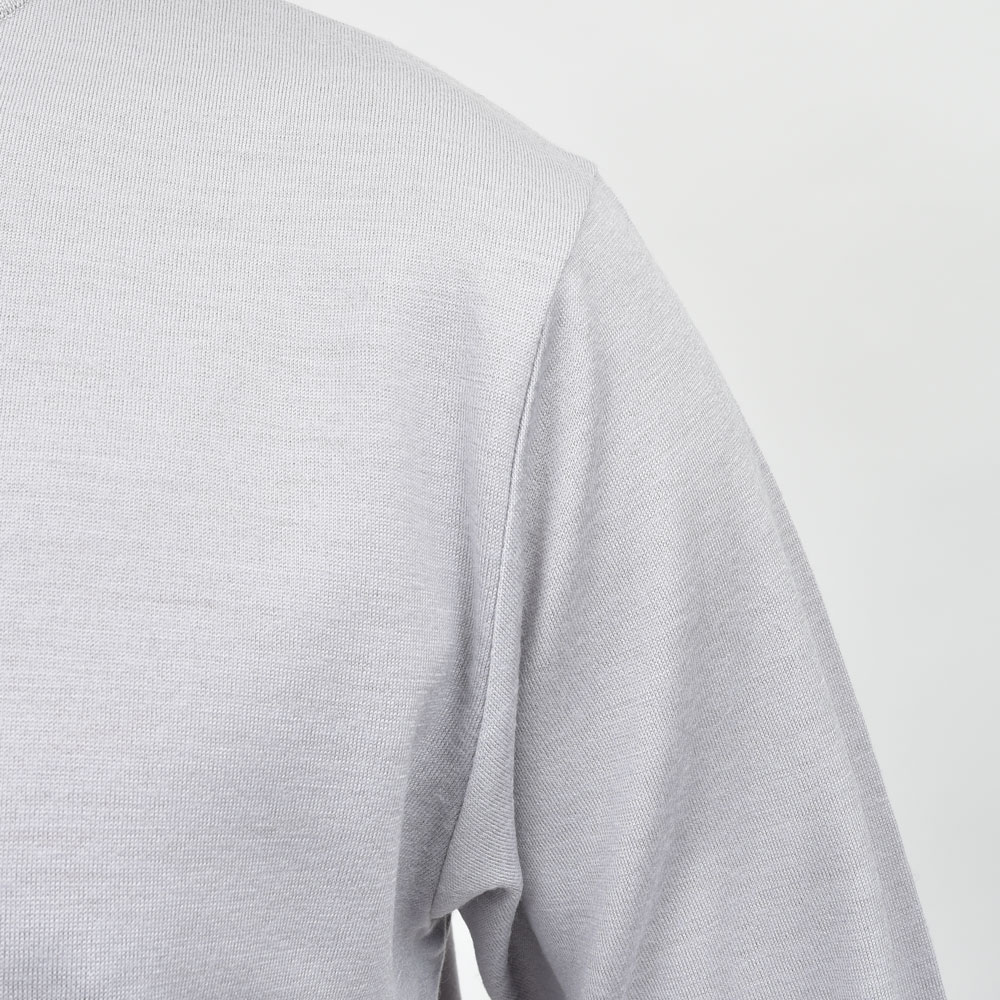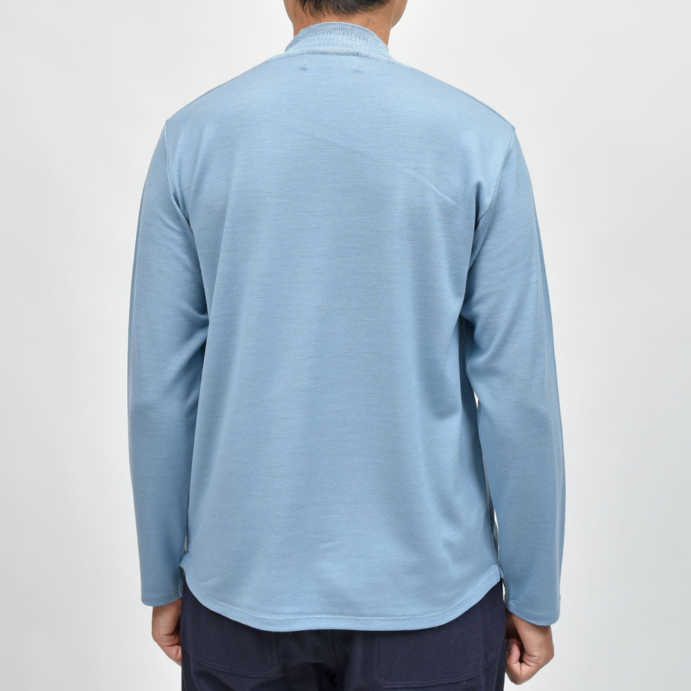 AMBELL(アンベル)のモックネックニット、Super120’sの糸を採用したクリーンで品がありながらもデイリーに活躍してくれる一着。生地の段階で樹脂でコーティングすることで毛羽立ちをさせず、ピーリングしづらい仕上げに。素肌で着用してもチクチク感がなく、ロンTのような感覚で活躍してくれる汎用性の高いニットになっています。
