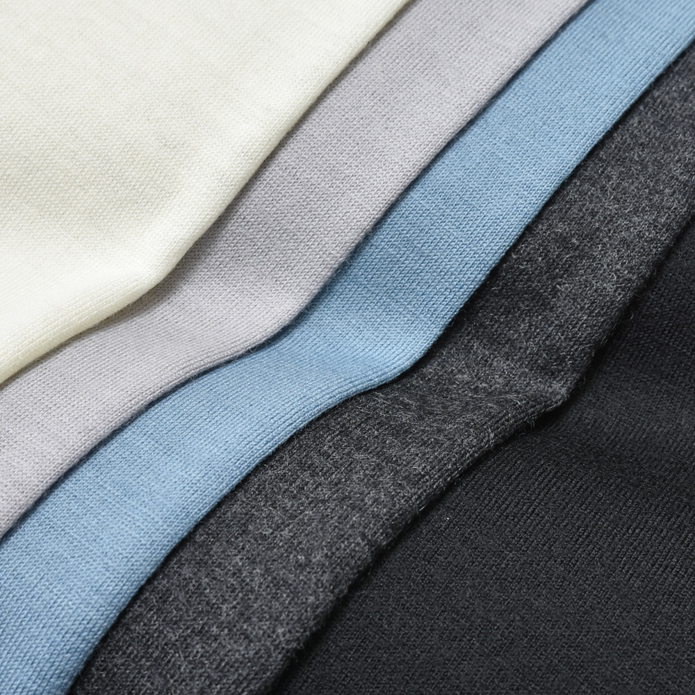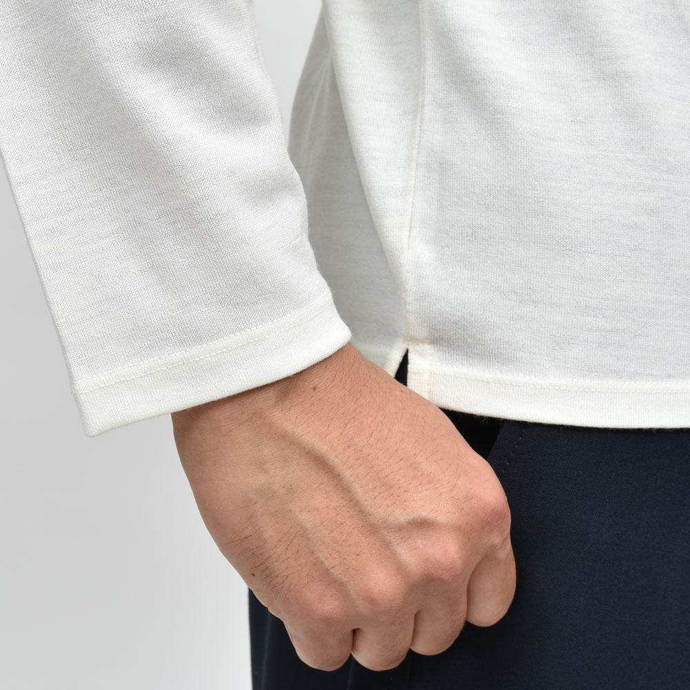より首回りをスッキリと見せられるようにデザインされていて、ジャケットやブルゾンを合わせてももたつかず、カットソーに近い感じで着られるニットという印象ですね。