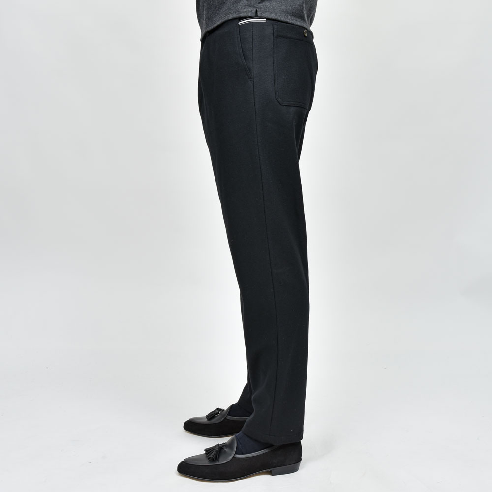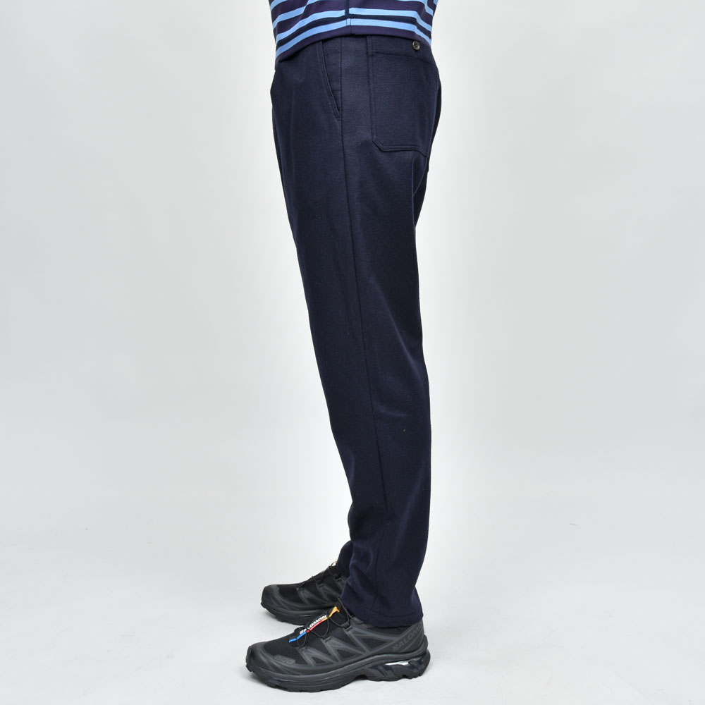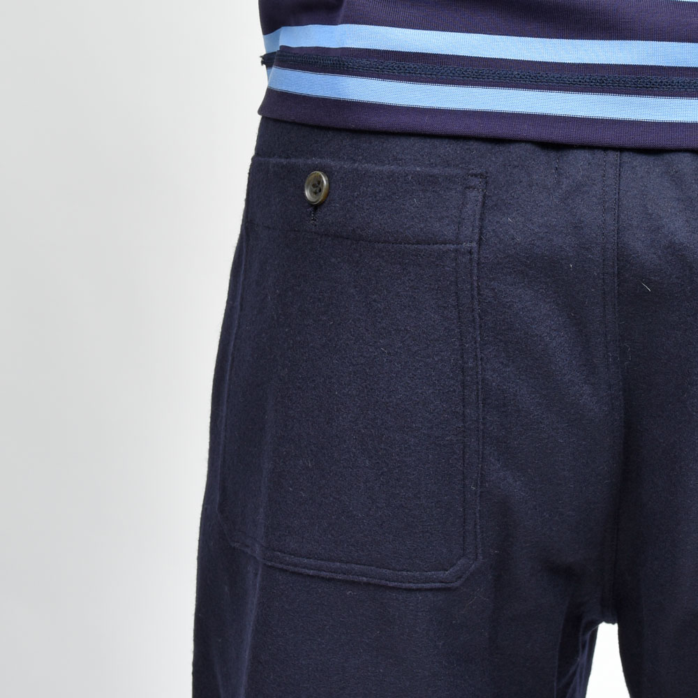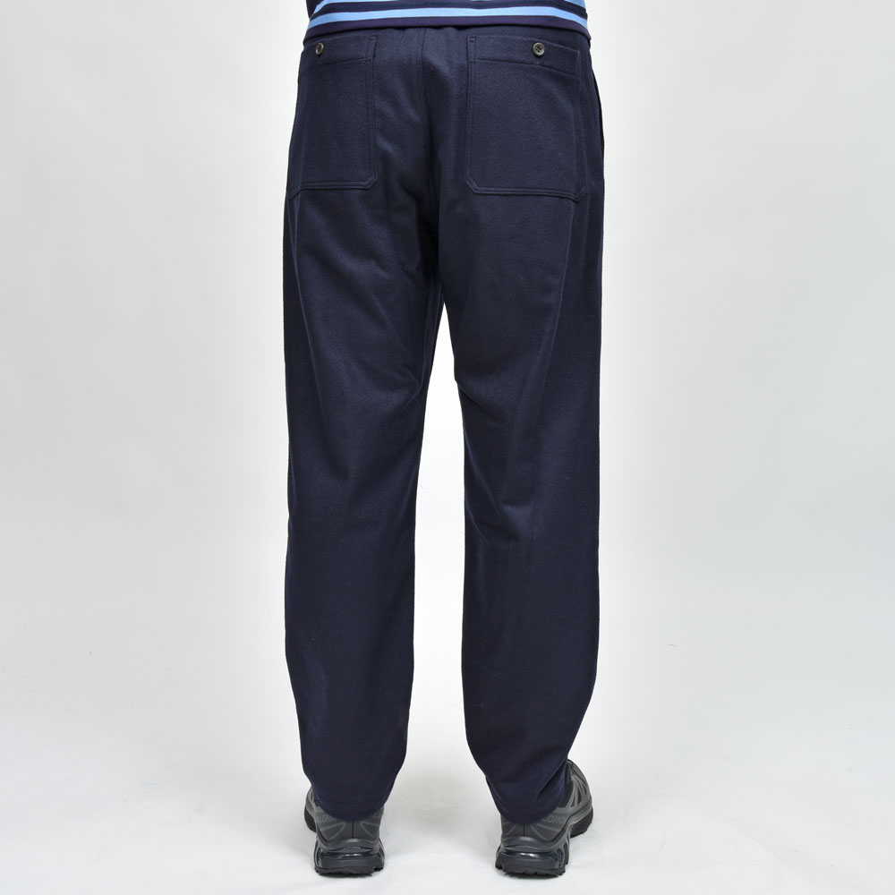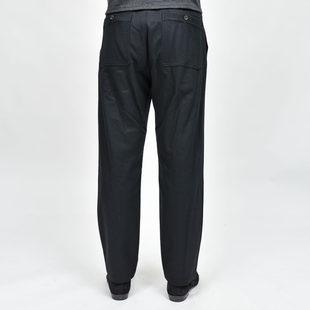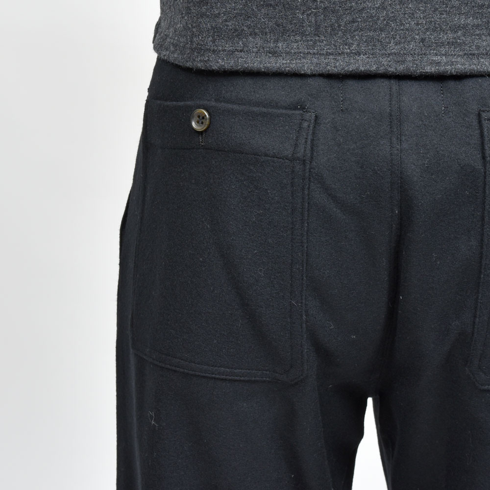 ウールフランネルのしっかりとした生地にウエストのシャーリング部分がバックのみに、タックインのスタイルの場合でもよりすっきりとした雰囲気で着用いただけます。