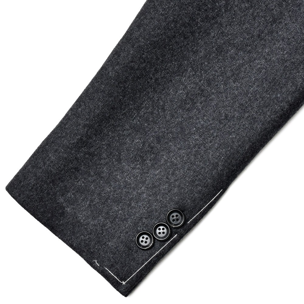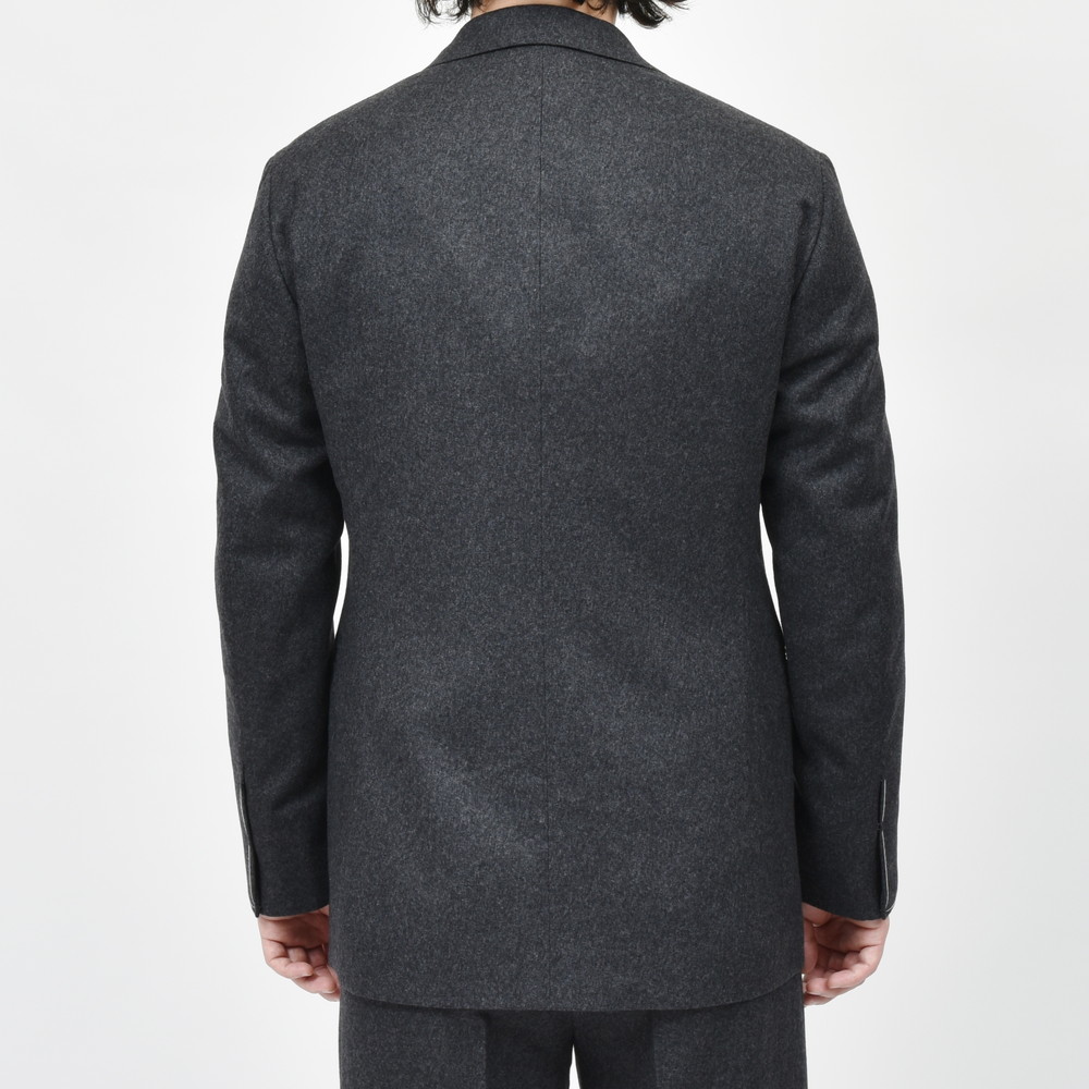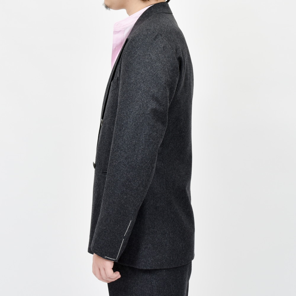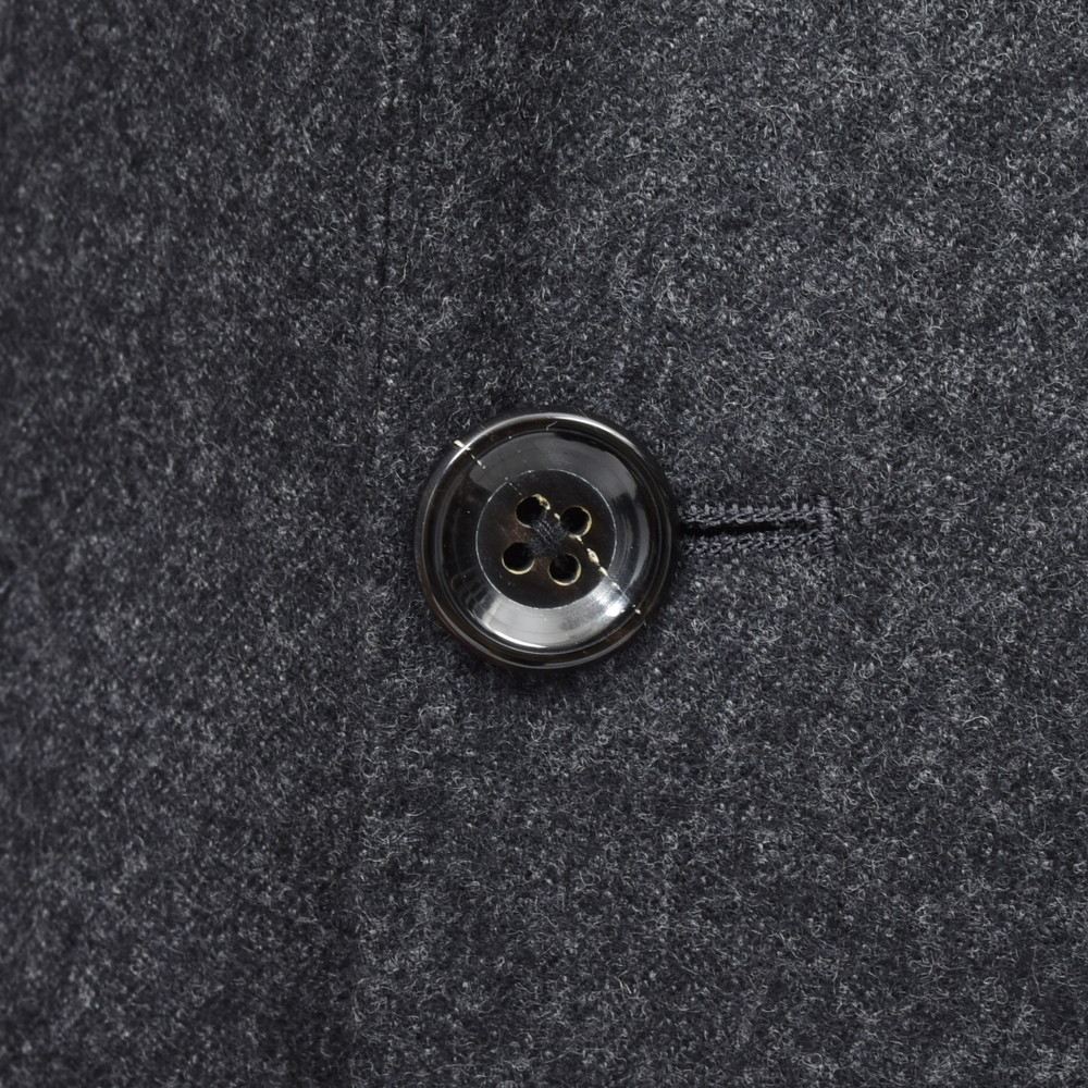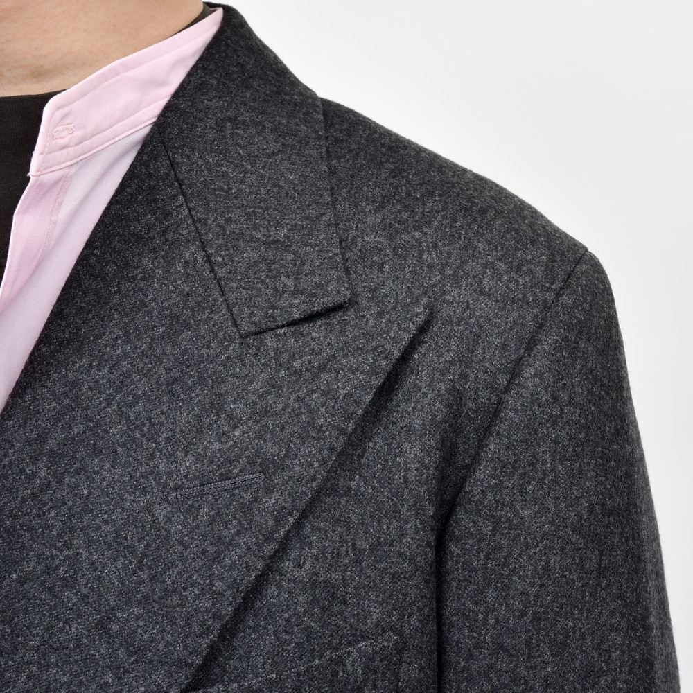 深みのあるグレーフラネルの発色が非常に好みでして、艶っぽくなりすぎず、硬くなりすぎず絶妙な塩梅の色合いだなと。特にダブルブレストになっているのもポイントでして、シングルより洒脱な雰囲気を演出できるように思います。