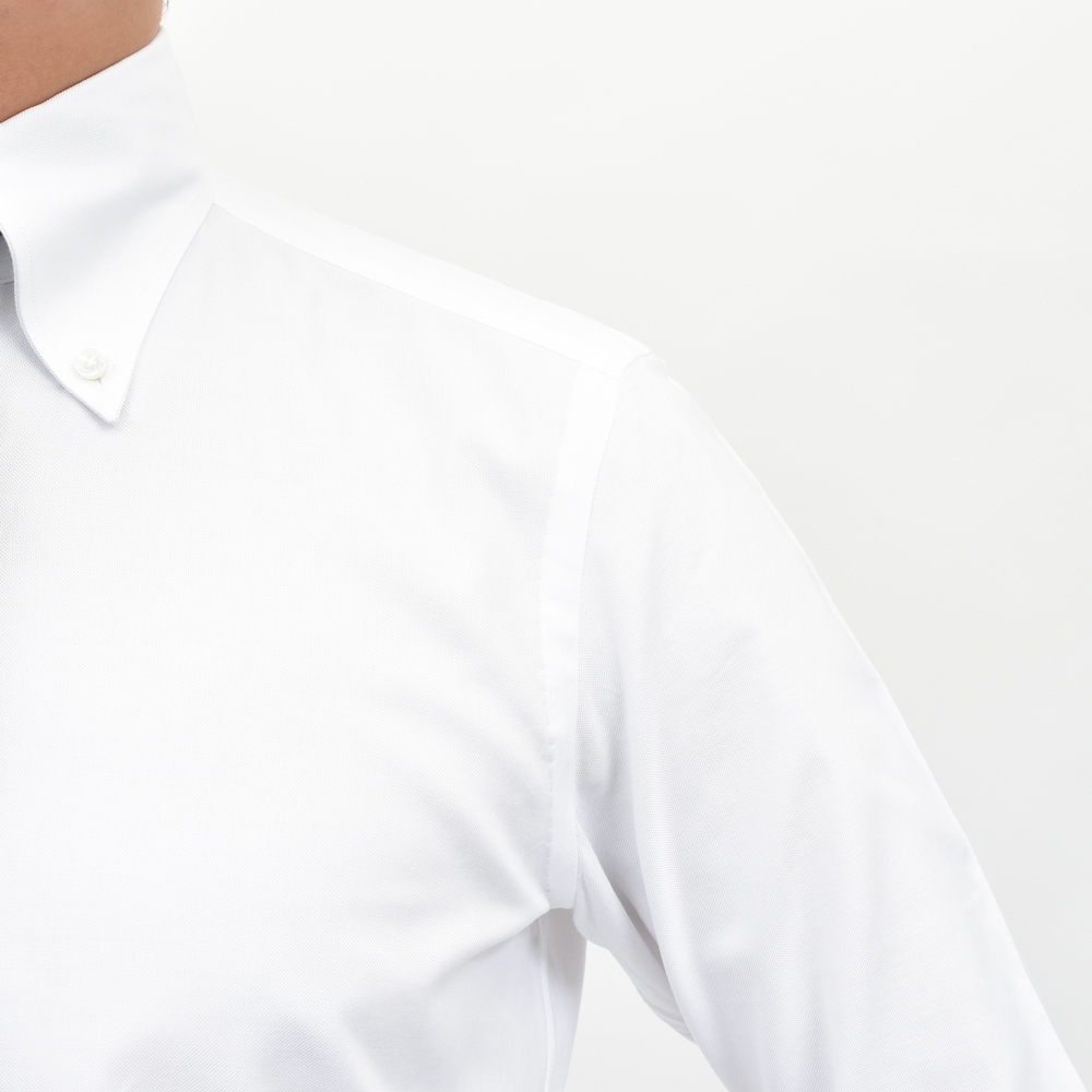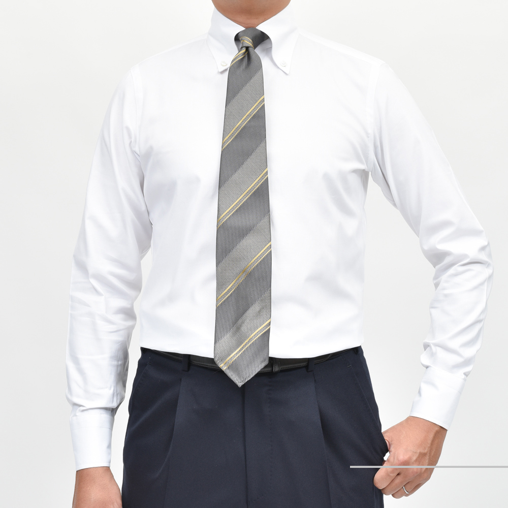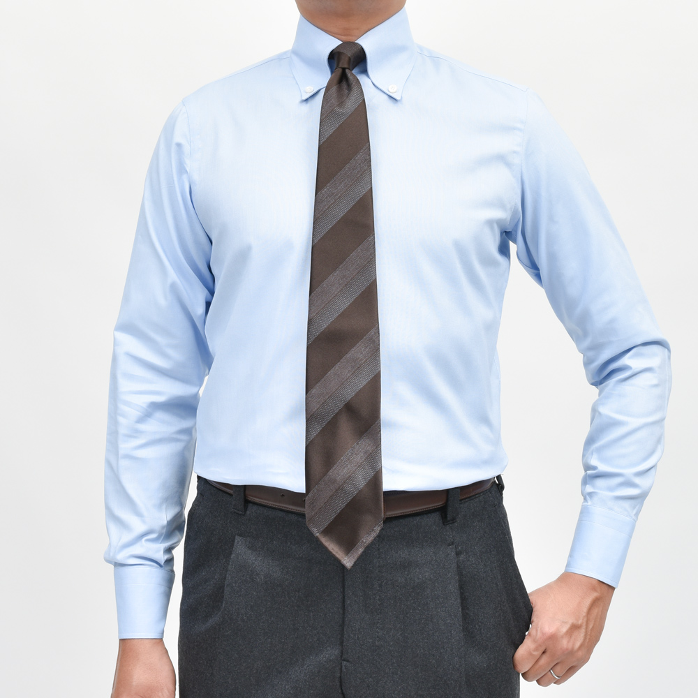 ドレスシャツの襟型のラインナップにも広がりを検討しておりまして、同ブランドでは定番のセミワイドタイプに加えてボタンダウンも導入してみました。