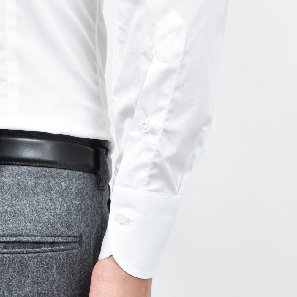 襟の開きは90度ほど、大きすぎず小さすぎずの襟羽根で、ネクタイのノットも詰まることなく程よく引き締まって見えますね。