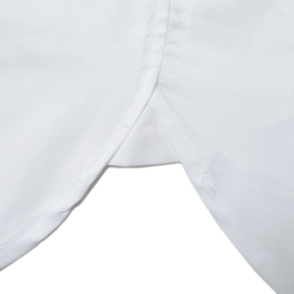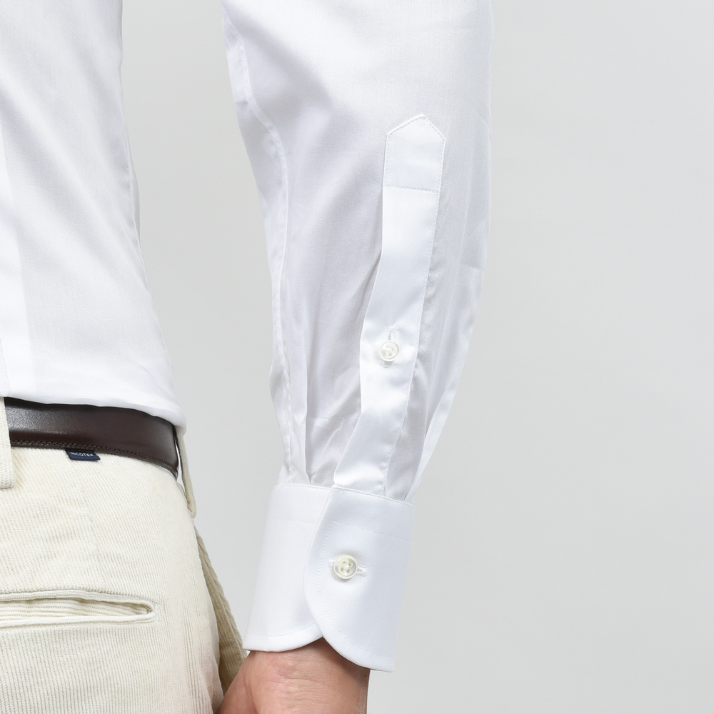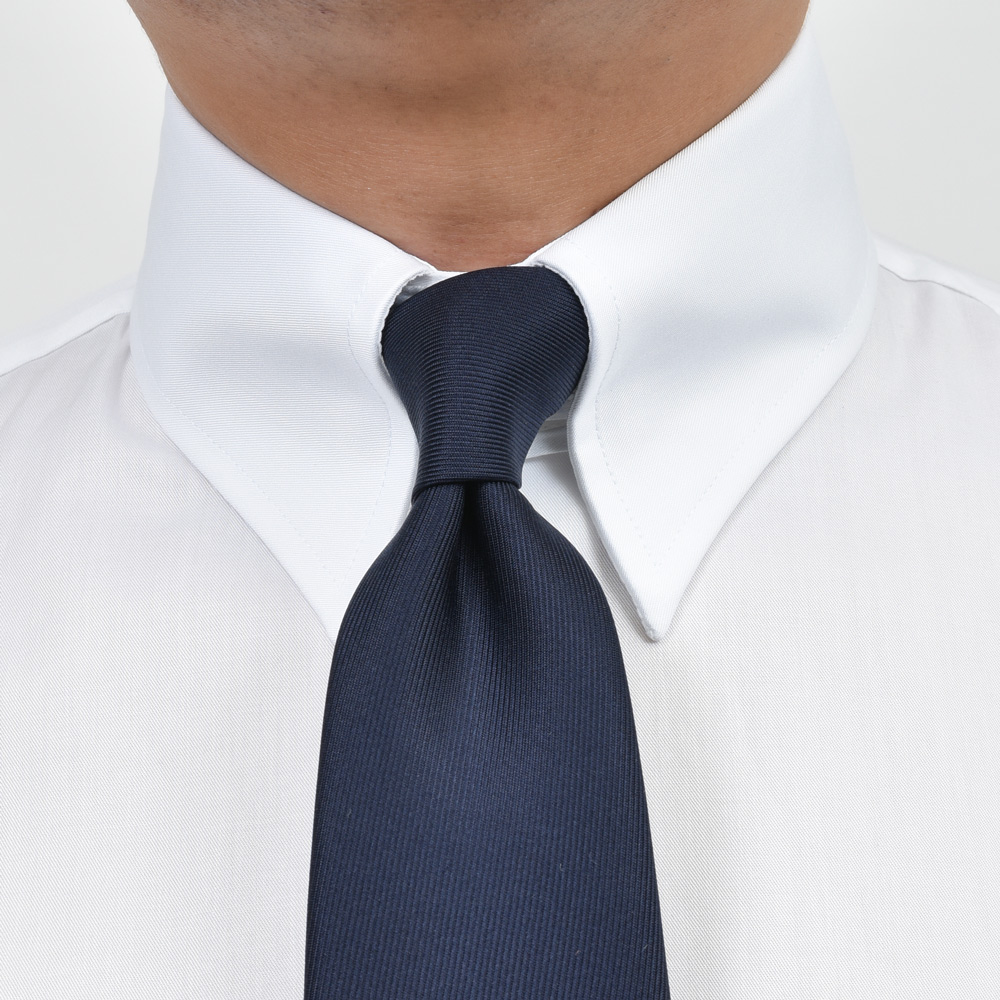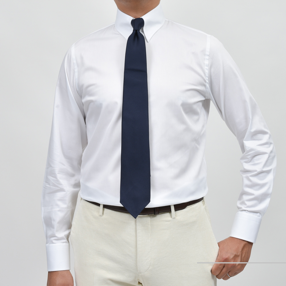 タブカラーシャツは基本的にネクタイをする前提のデザインのため、ネクタイが一層引き立ち、フォーマルな場やビジネスシーンで非常にエレガントな印象を与えます。