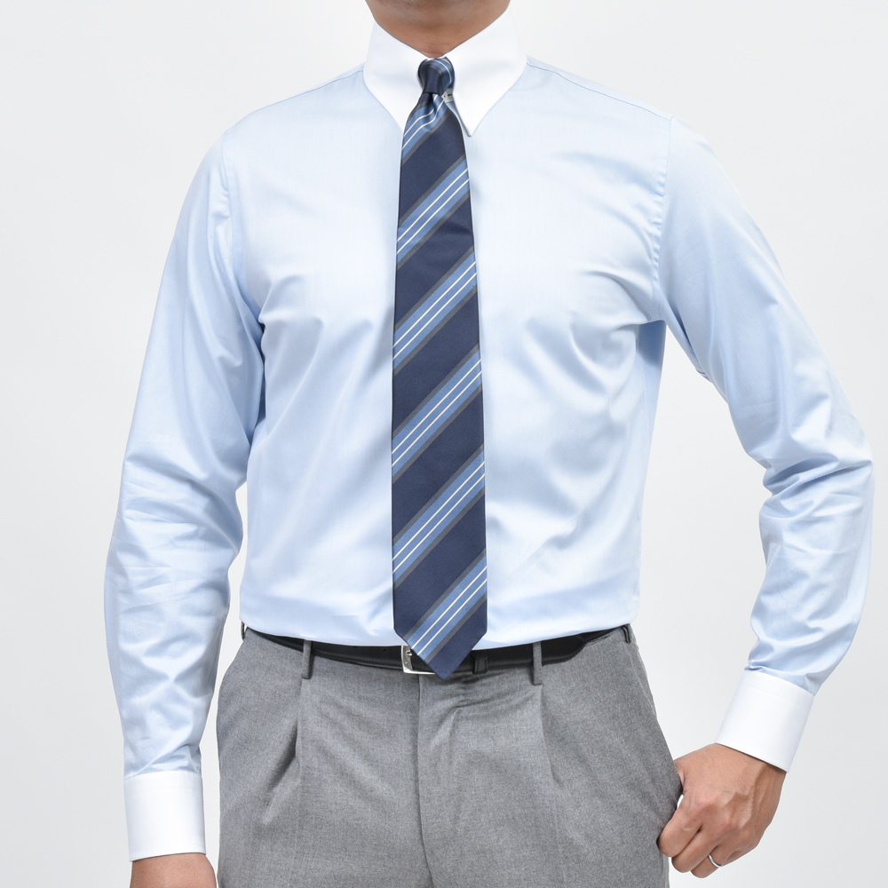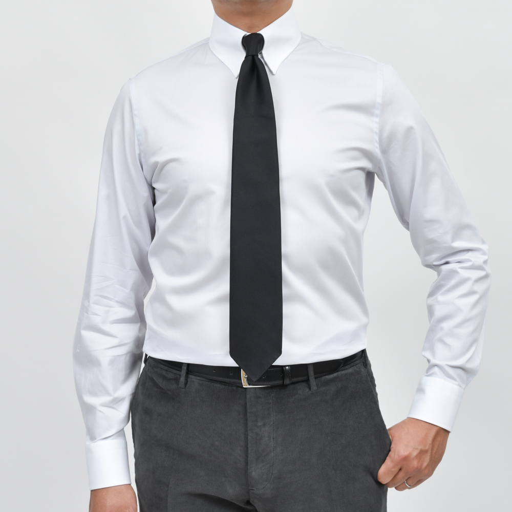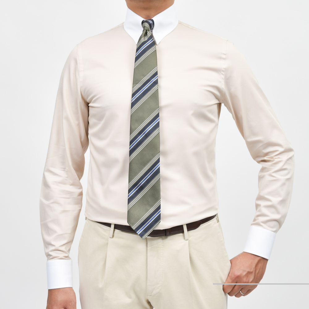タブカラーシャツは基本的にネクタイをする前提のデザインのため、ネクタイが一層引き立ち、フォーマルな場やビジネスシーンで非常にエレガントな印象を与えます。