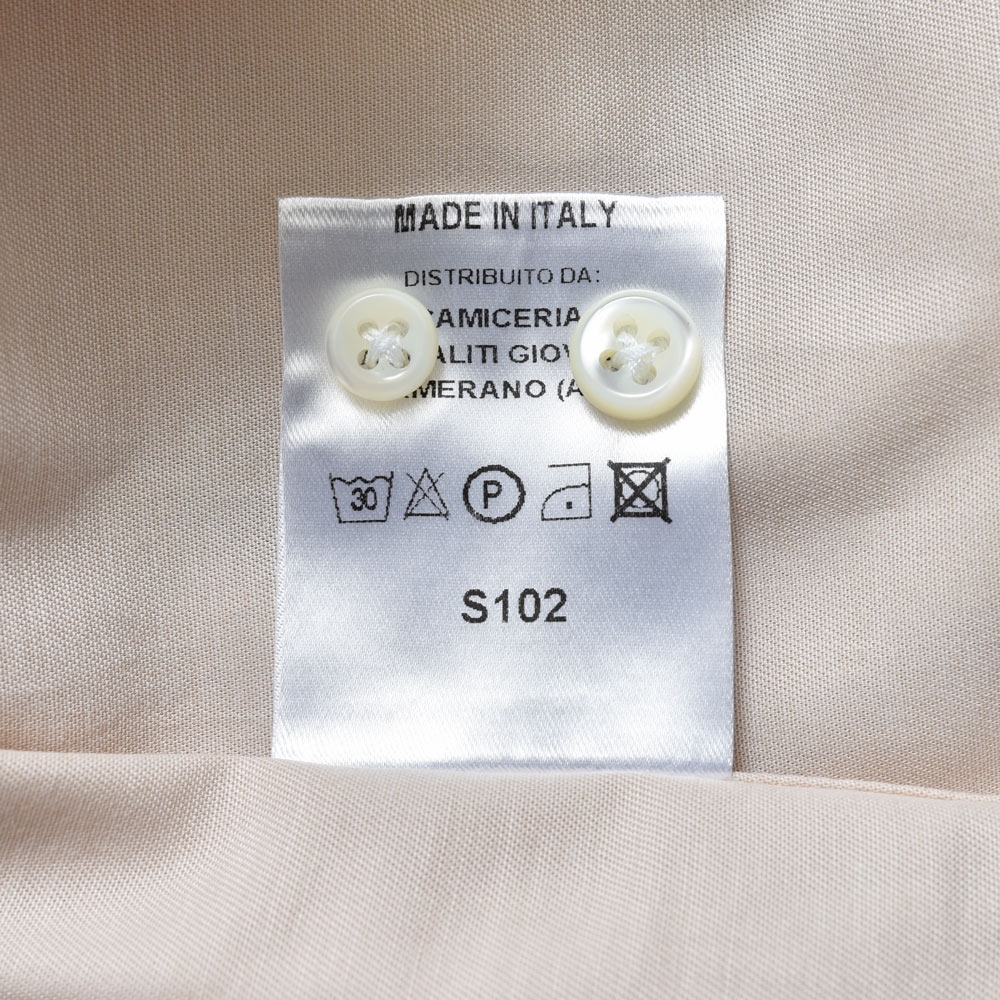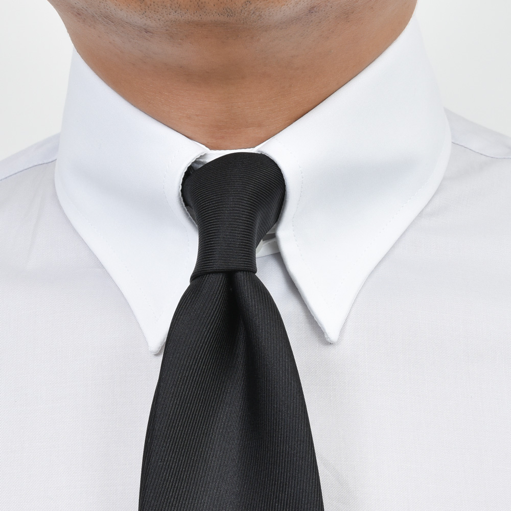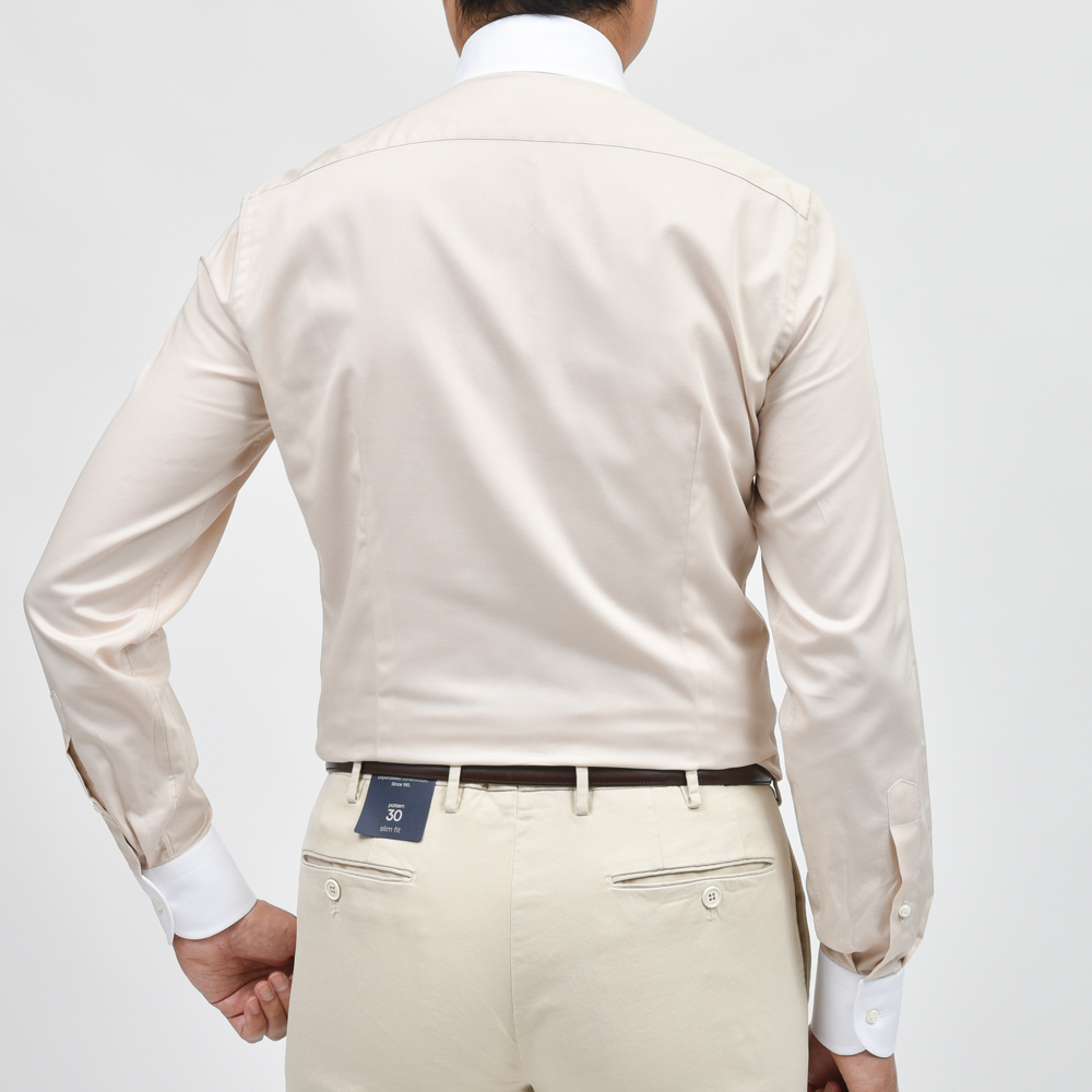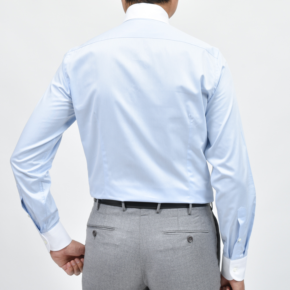 タブカラーシャツは基本的にネクタイをする前提のデザインのため、ネクタイが一層引き立ち、フォーマルな場やビジネスシーンで非常にエレガントな印象を与えます。