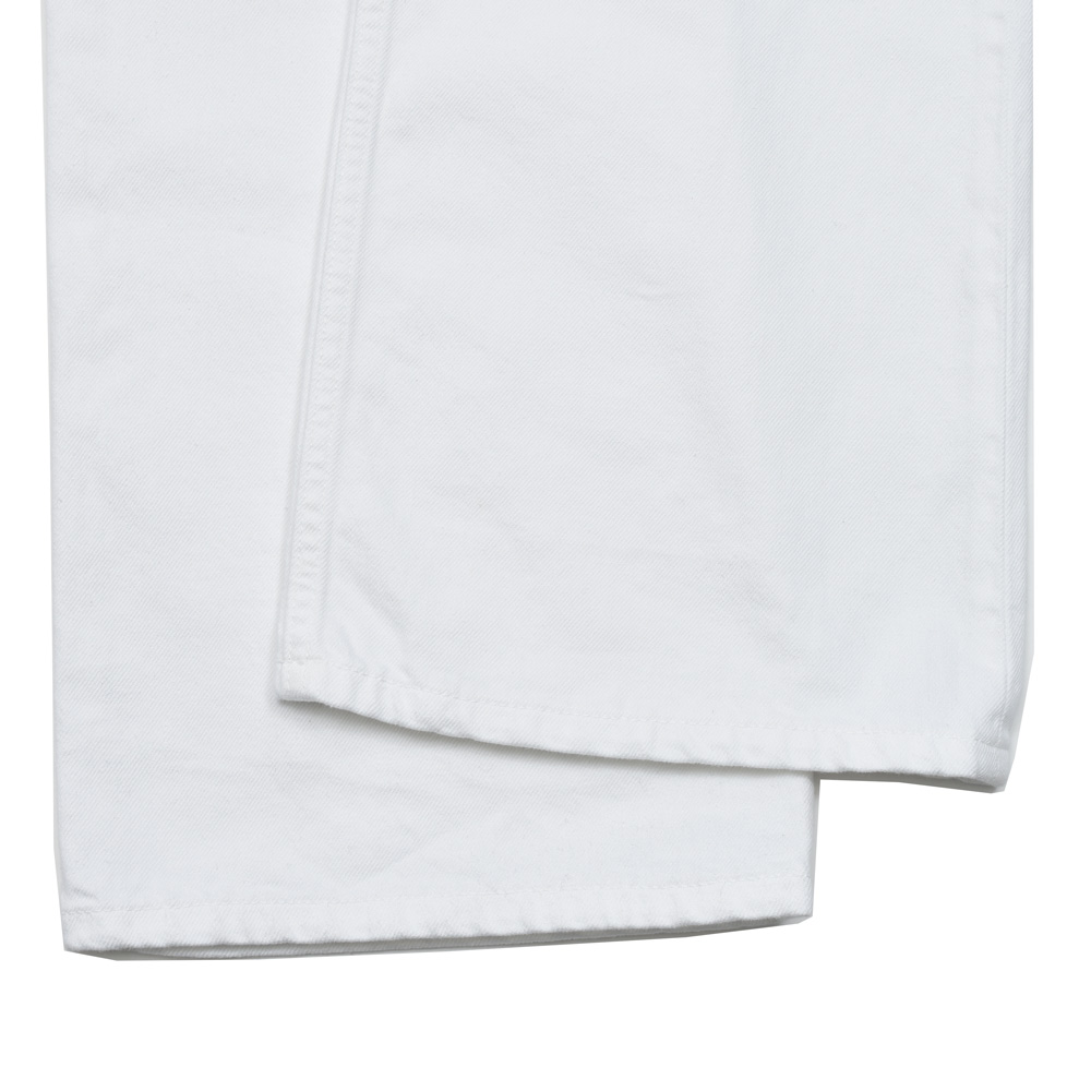 日本製のデニム生地を用いた真っ白な一本、生成りではなくあくまでもピュアなホワイトを提案しているのがこのブランドらしいなと。シルエットは腰回りをコンパクトにすることで縦のラインを強調、裾に向けて広がっていくシルエットは足をスマートかつ長く見せることができる仕上がりになっています。