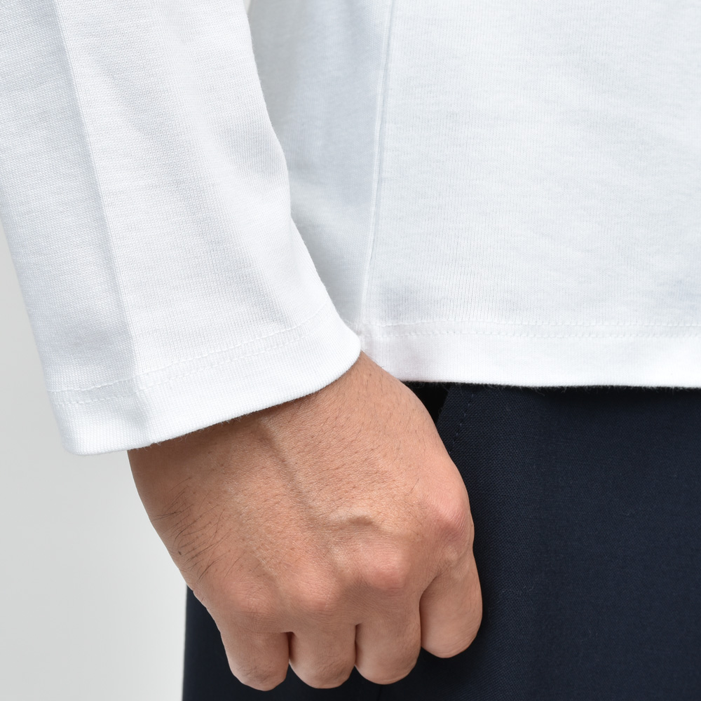 秋冬シーズンはクルーネックカットソーよりもモックネックの方が季節感が出しやすく、温かみも得られます。