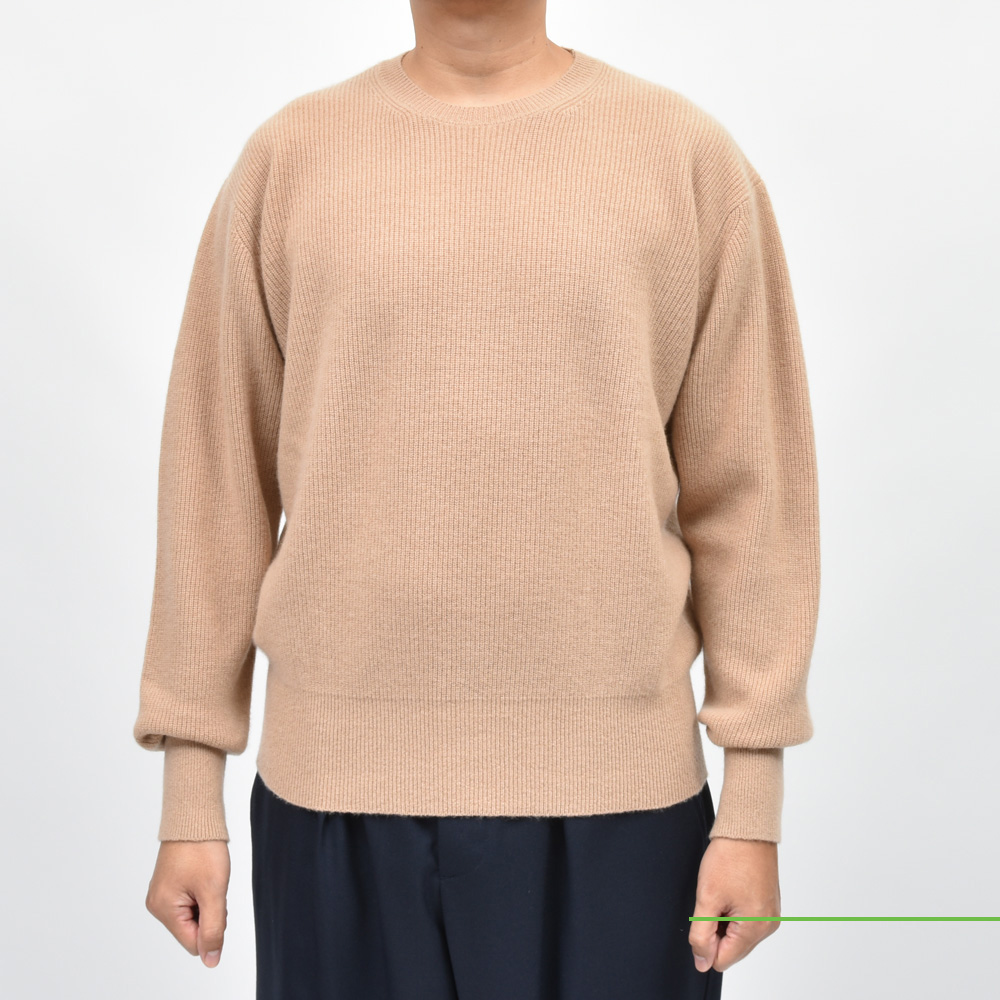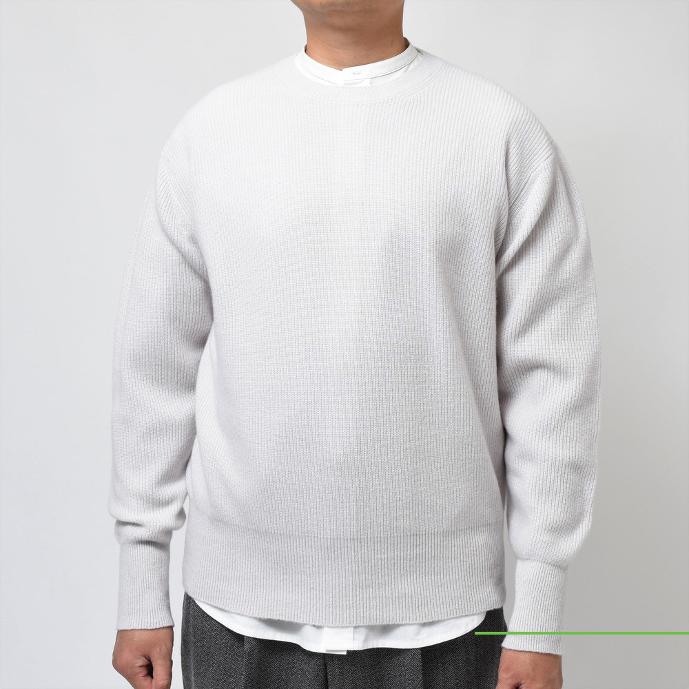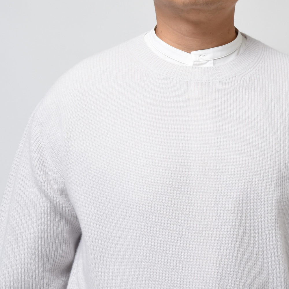身幅はやや広めにとっていますが着丈はそこまで長く見せないように、リブをやや長めにすることでバランスの調節をしやすくなっているのもポイント。編み地は柔らかくカシミアの風合いを存分に感じてもらえるタッチに仕上げています。