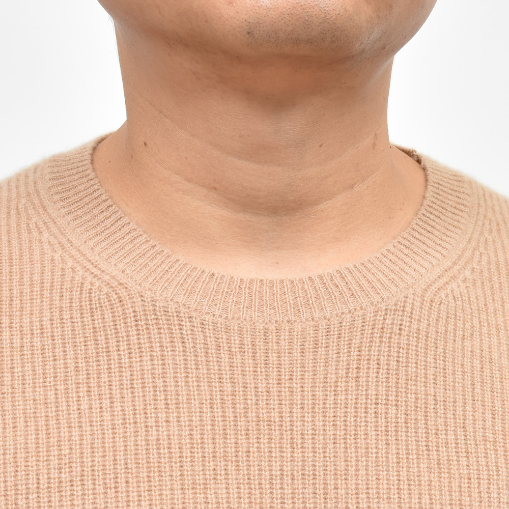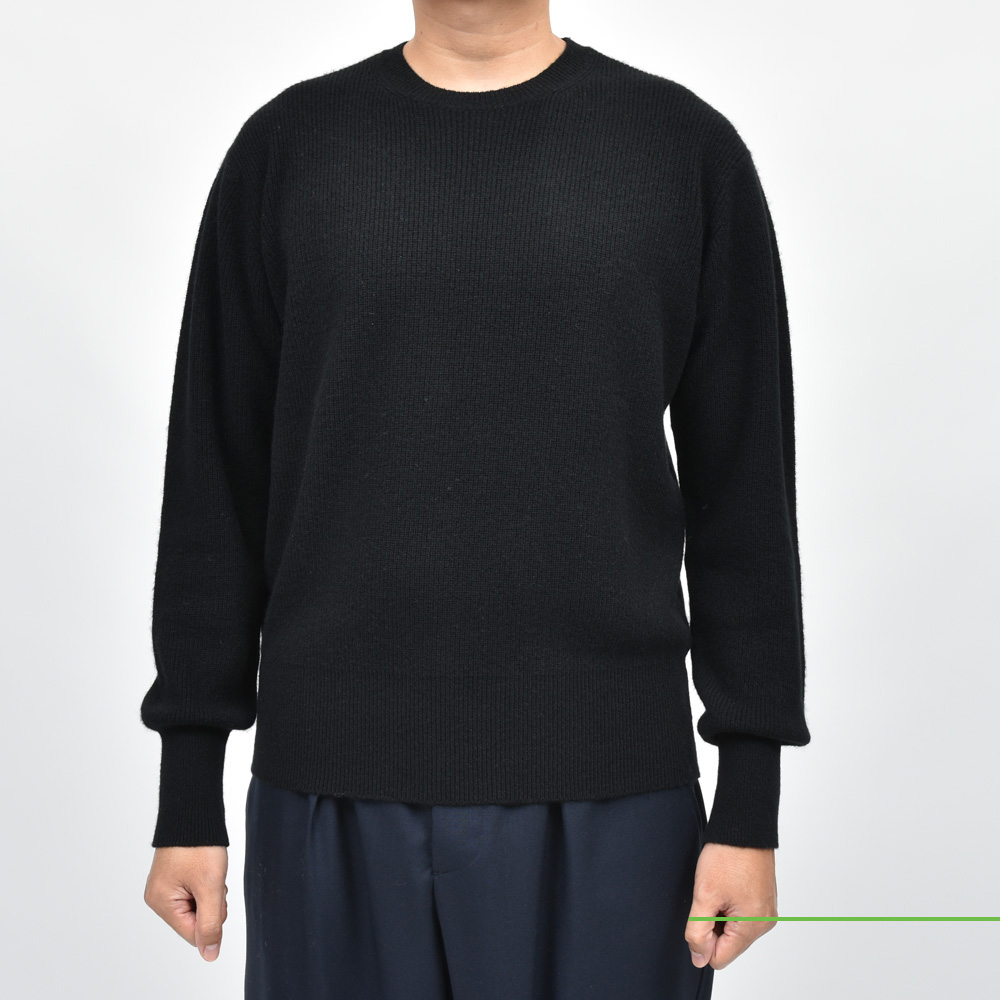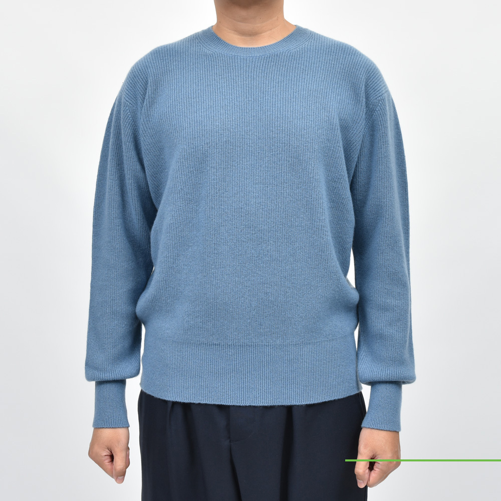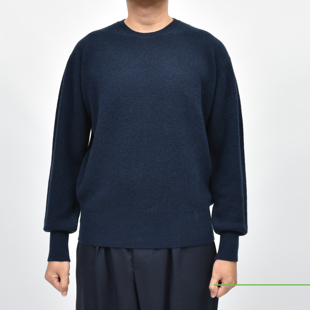 身幅はやや広めにとっていますが着丈はそこまで長く見せないように、リブをやや長めにすることでバランスの調節をしやすくなっているのもポイント。編み地は柔らかくカシミアの風合いを存分に感じてもらえるタッチに仕上げています。