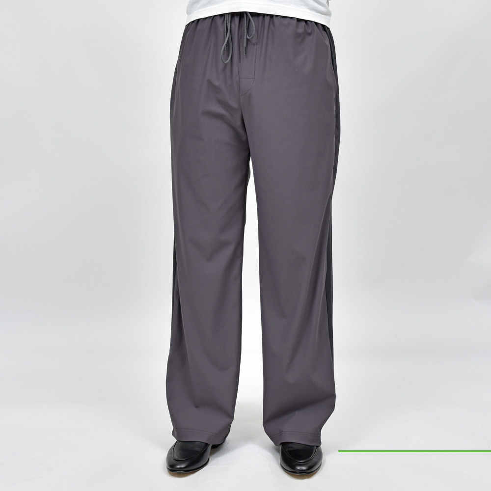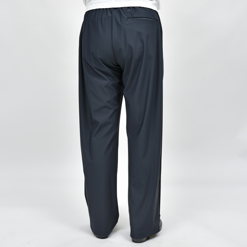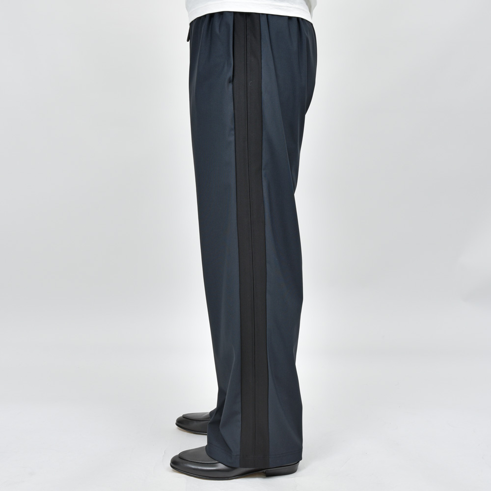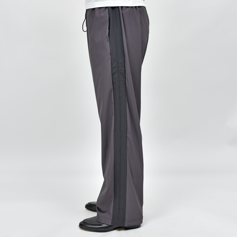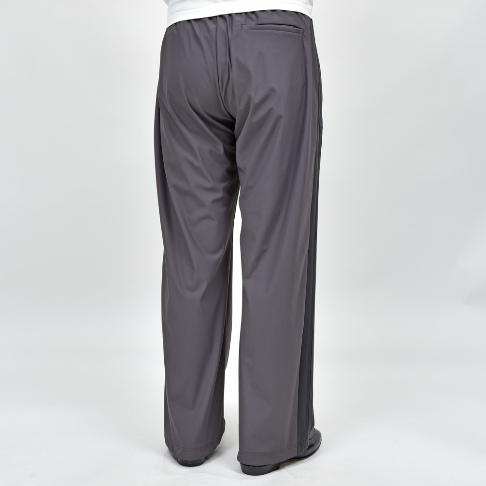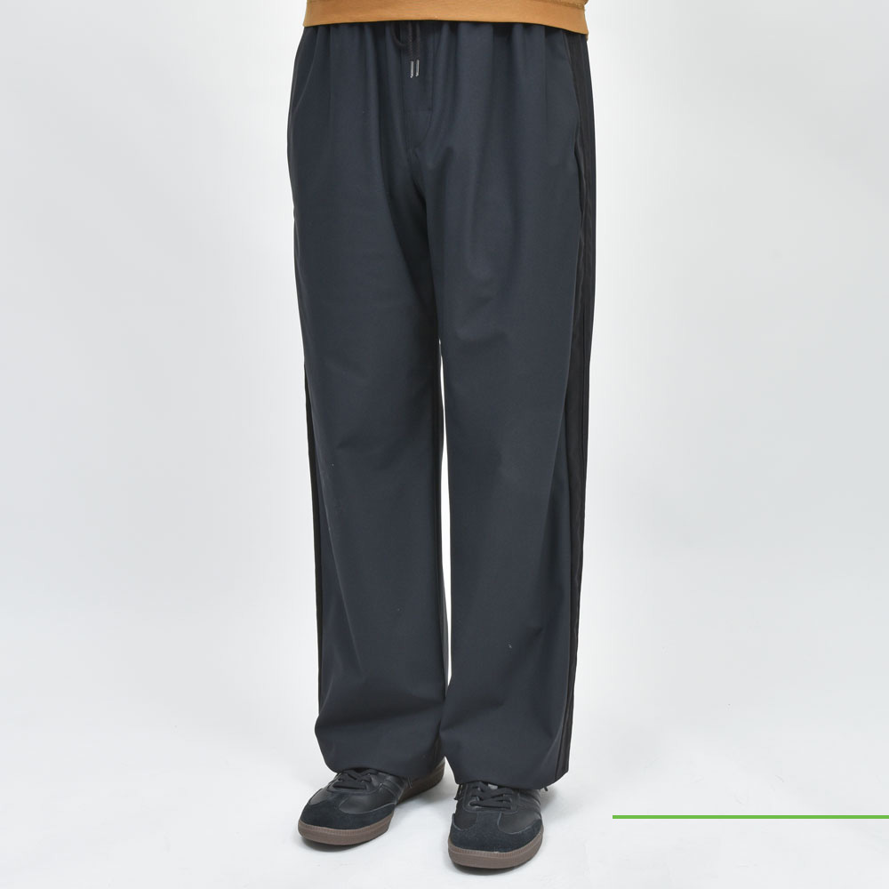 いわゆるトラックパンツ的なアイテムなんですが、スポーツブランドと違いミニマルで主張が控えめになった仕上がりというのがポイントですね。サイドラインがデザインとして効いていますが、コントラストが強くないので落ち着いた、まとまりのあるルックスに仕上がっています。