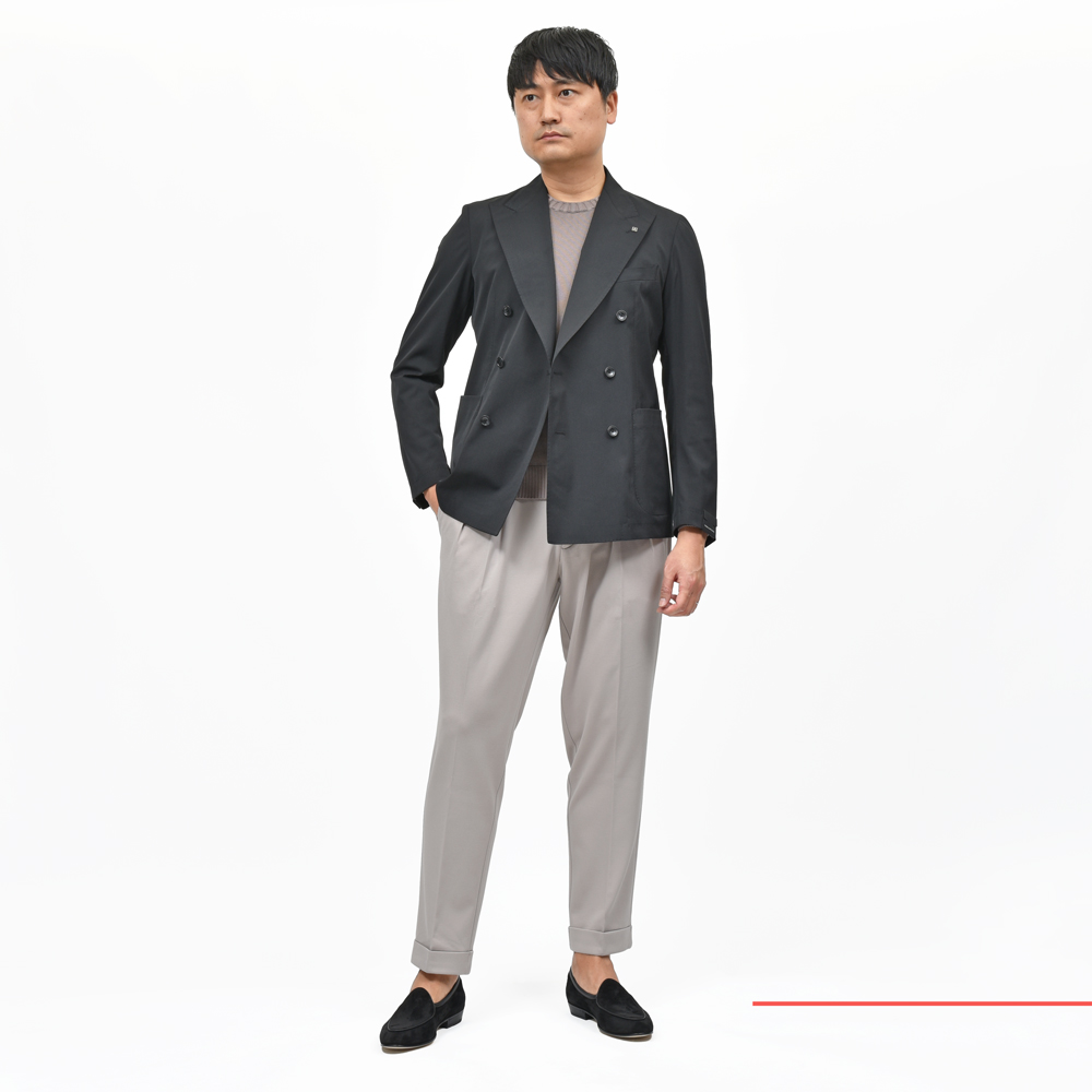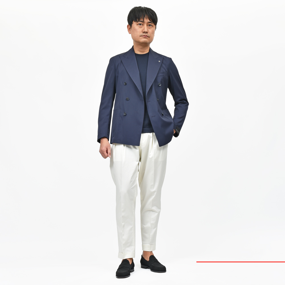 ダブルブレストを軽快に着る、今となってはごく当たり前のような感じですが、その走りはTAGLIATOREにあるように思います。副資材を極力用いらない仕立ててでありながらも着用した時の見栄えは非常に洗練されているというのが大きなポイントでして、クルーネックのニットで合わせても品をキープしてくれるんですね。