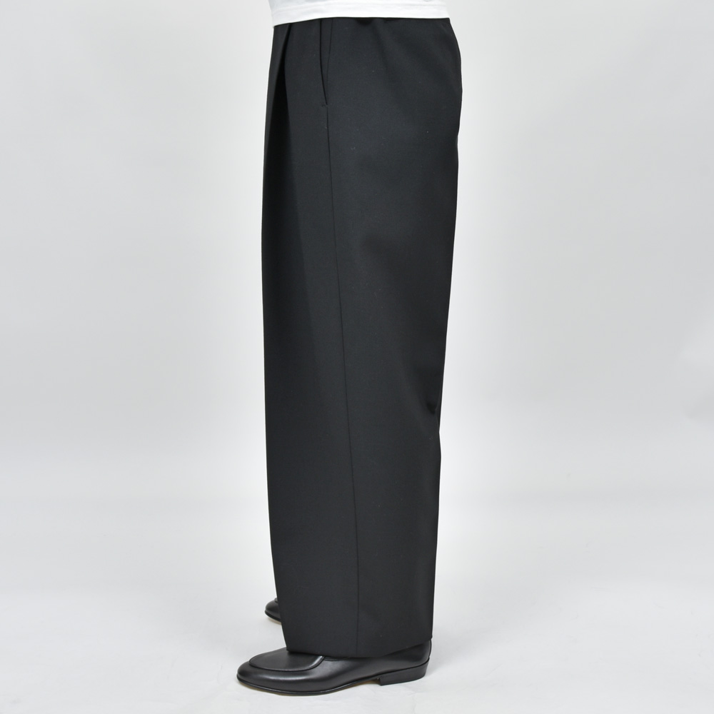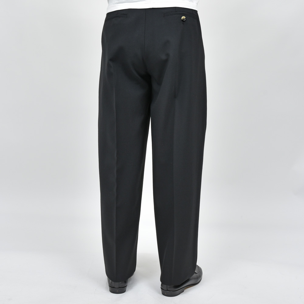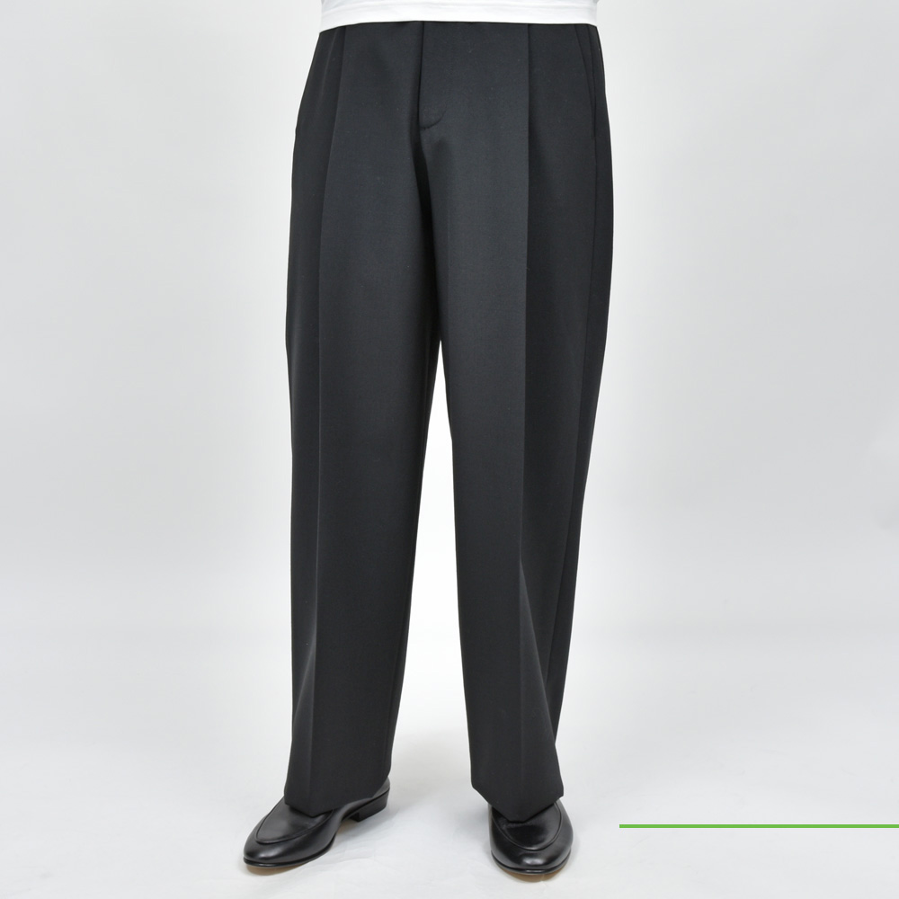 シルエットは定番のタイプと異なりまして、ワイドにストンと裾まで落ちていくようなタイプに。完全なストレートではなくややテーパードがかかっている為、あまりワイド慣れしていない方でもトライしてもらい易い形となっています。しっかりとクリースを効かせることで横への広がりを適度に抑えているのもポイント、こうする事によって全体で見た時により収まりの良い印象に。