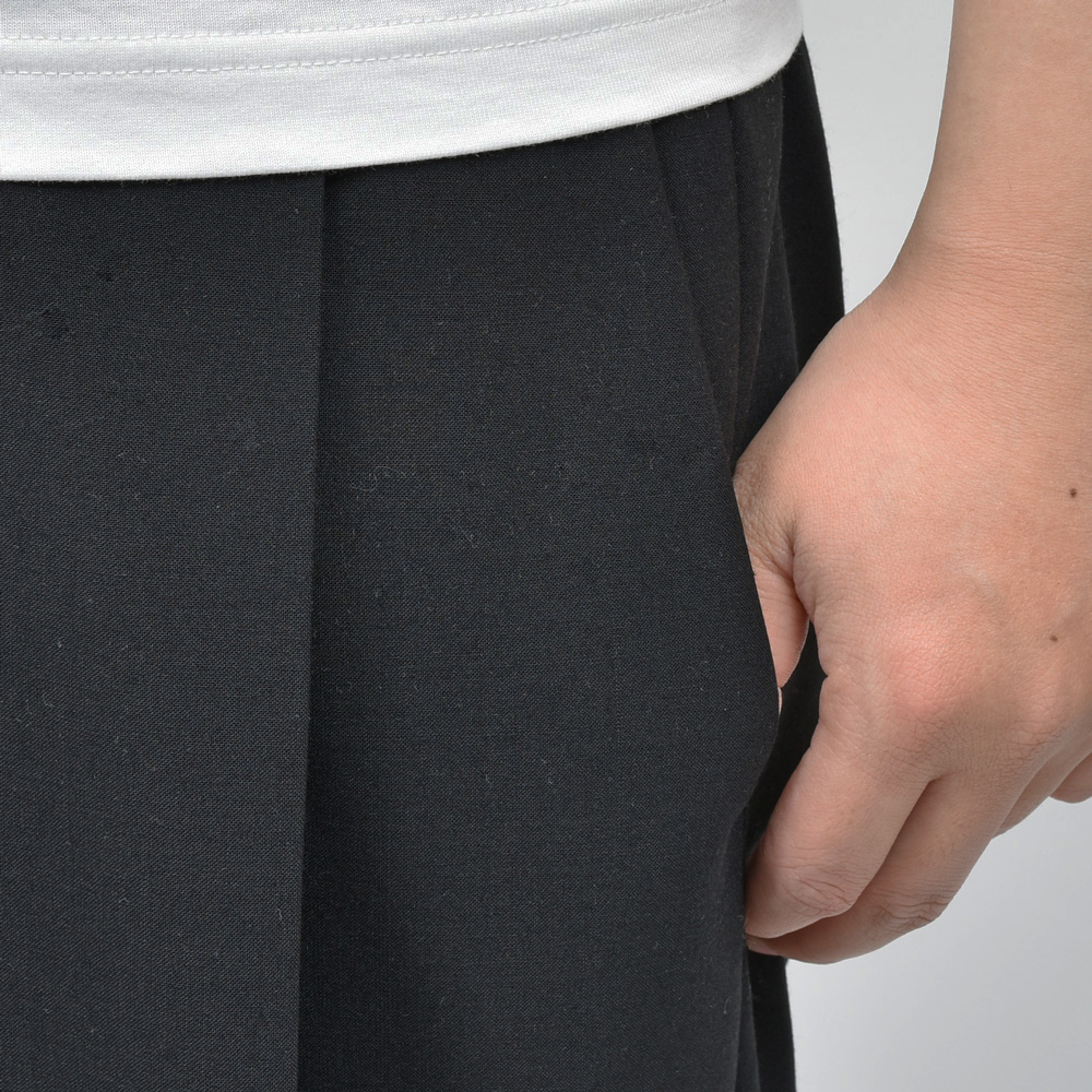 定番のシャーリングテーパードパンツに比べると、よりシャキッとした雰囲気のあるパンツです。特にこれといってロゴも入っていません、ストレートにシルエットと生地で勝負しているストイックな印象がありますね。