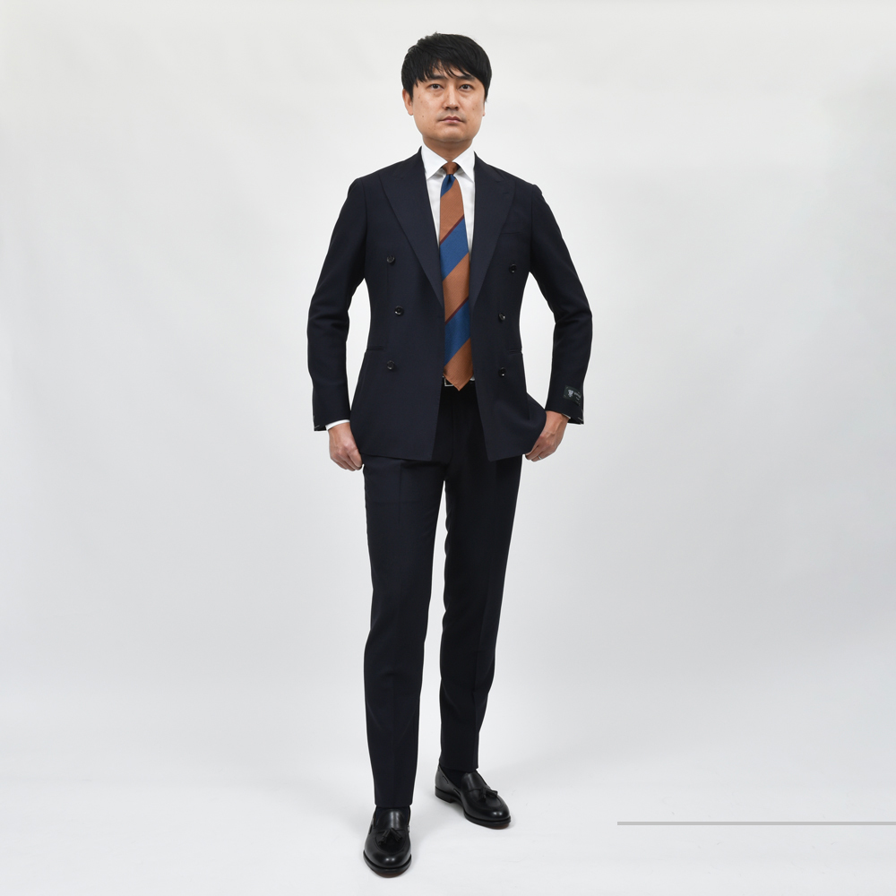 よりクラシカルで重厚感のあるダブルブレストですがシルエットはスリムフィット。