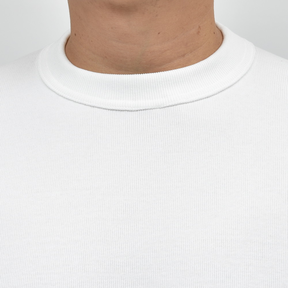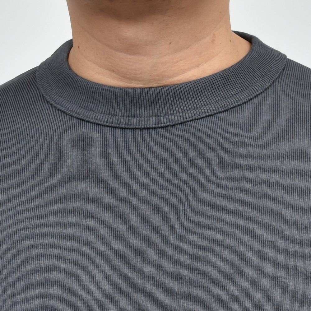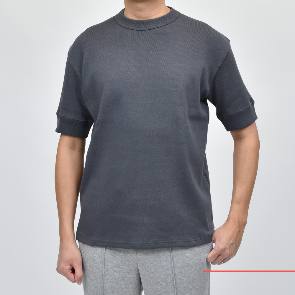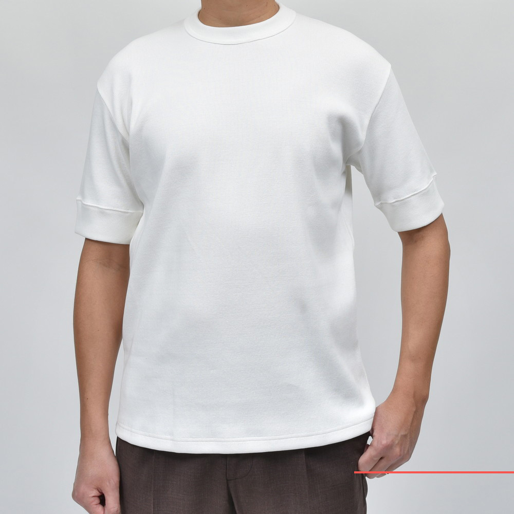 縦畝が入る伸縮性を持ったフライス生地、言うなればそれなんですが、とにかく度詰めに編まれており、一般的なものと比べると倍以上のウェイトになります。