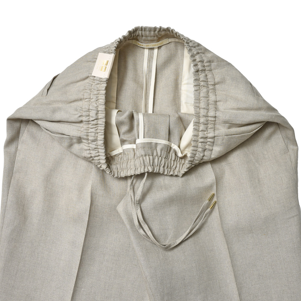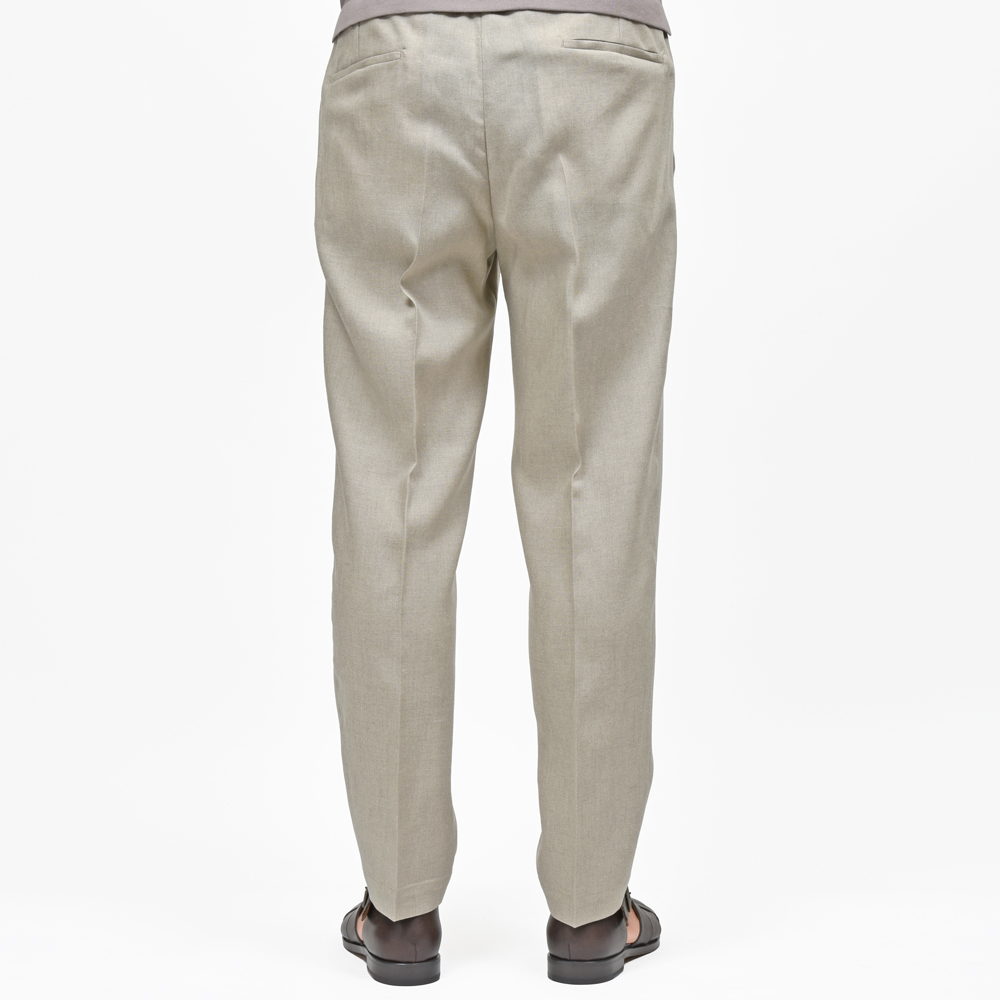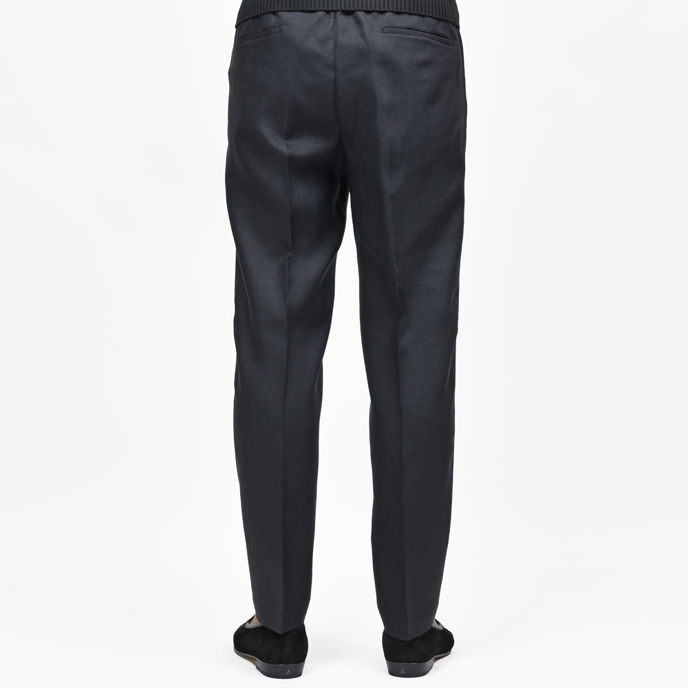 デザインは極めてシンプルで、ウエストは全面ゴムシャーリング、ドローコード付きで固定可能、細すぎず緩すぎないリラックステーパードシルエット、ウエストに立体感とサルトリアルなムードを加味する1プリーツ仕様。