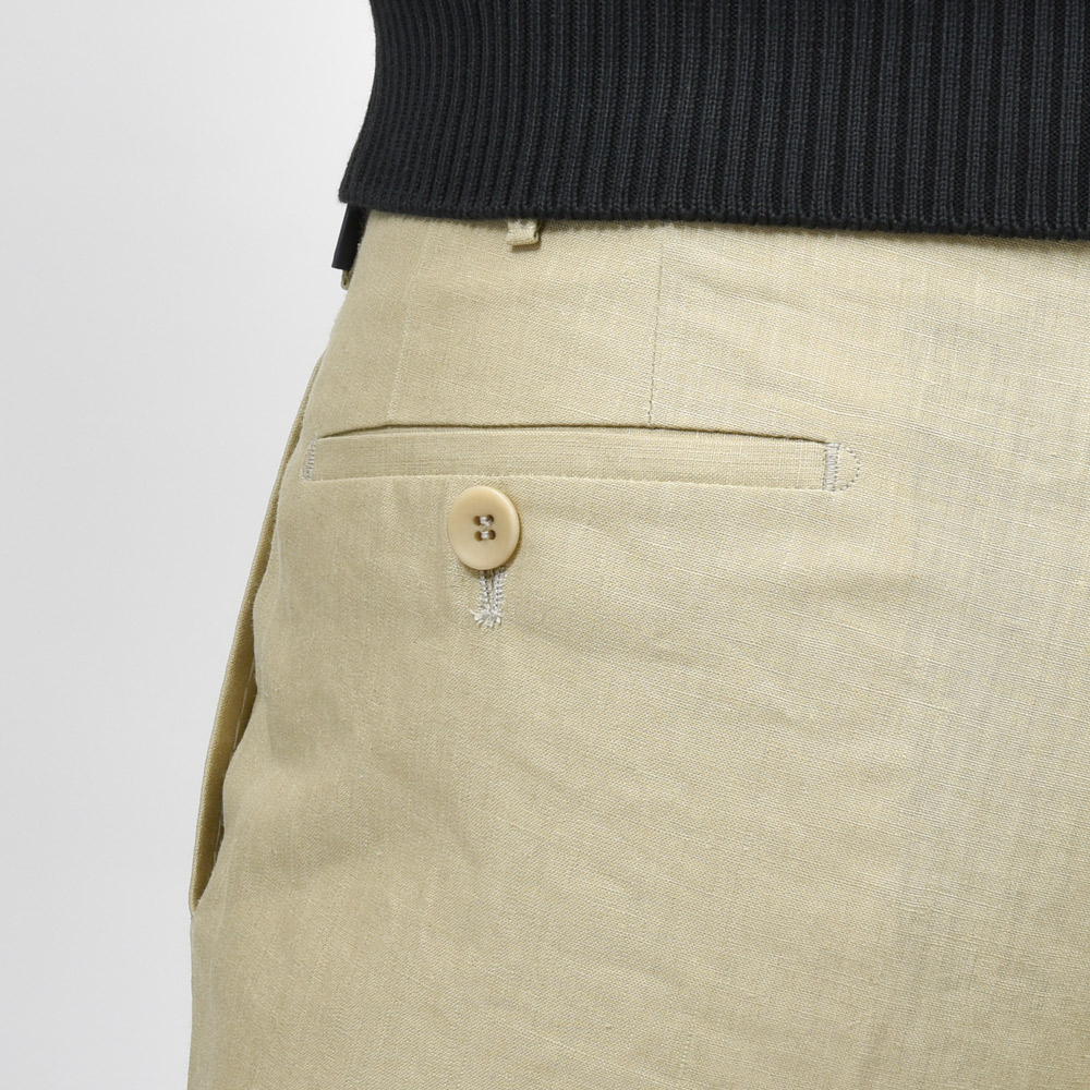 リネン素材使いということでトップスはシャツ1枚などのリゾートスタイルにも勿論マッチするのですが、ジャケットを着てニットタイを結びこのパンツを穿くという、夏場でも整ったスタイルでドレッシーに装いたいな・・・