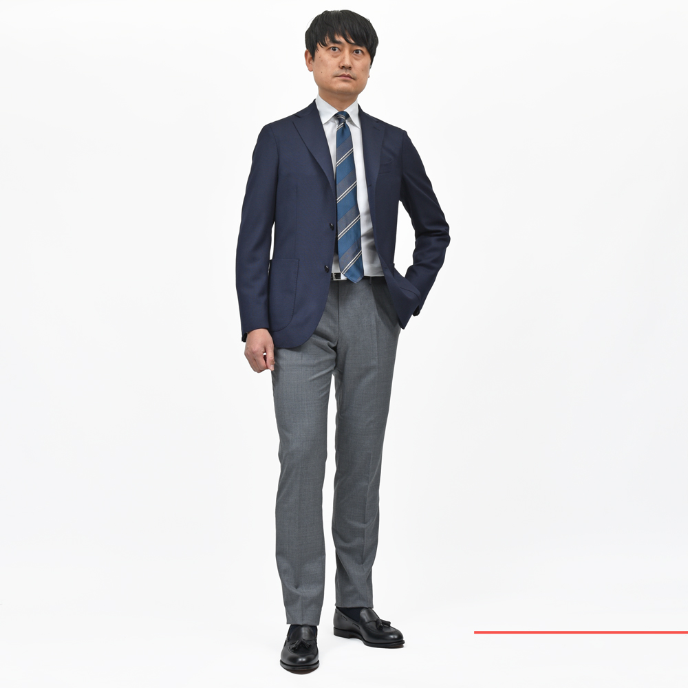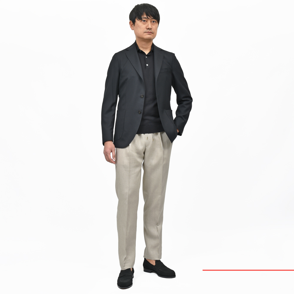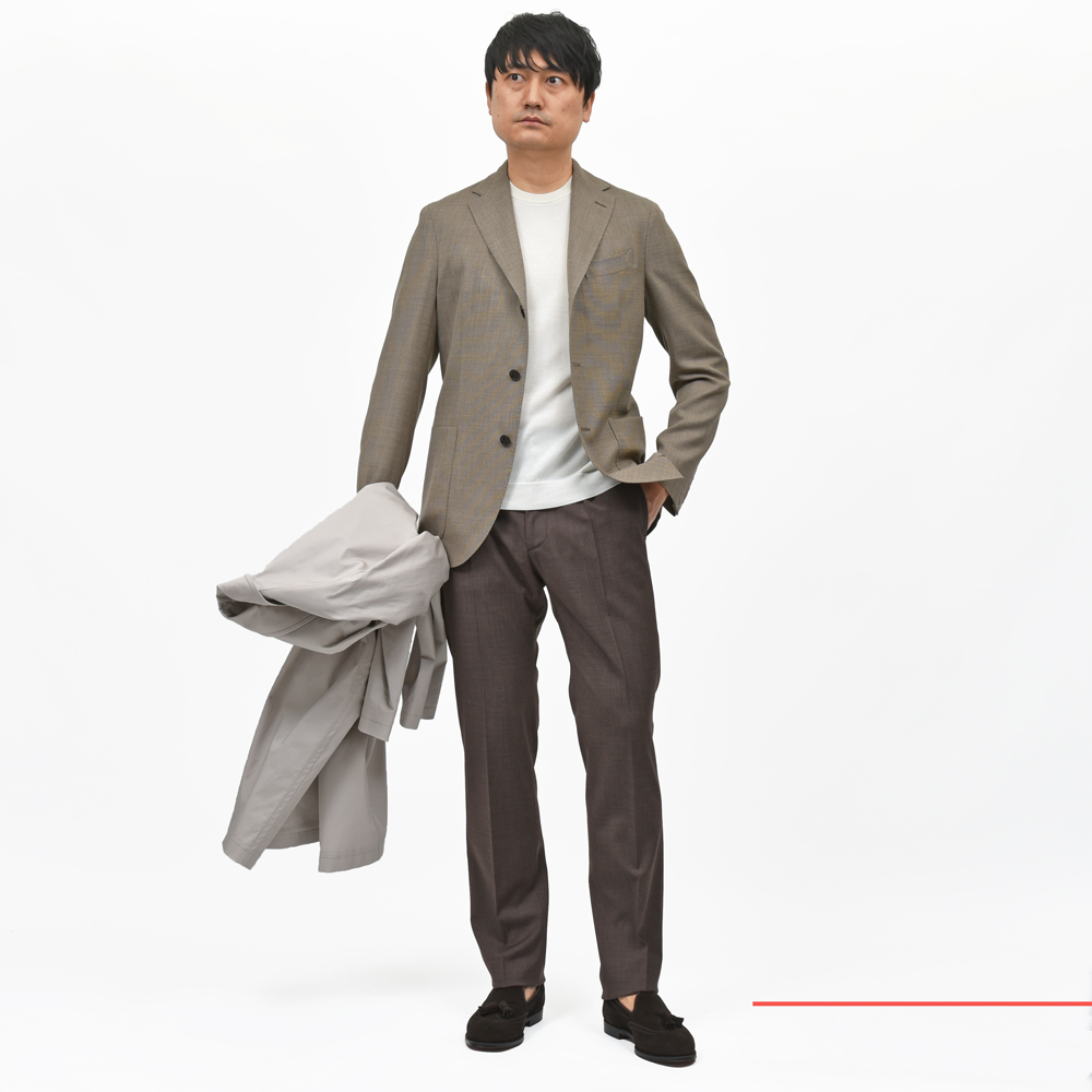 ベーシックなホップサックジャケットがあればだいたいのシーンは何とかなります。インナーはタイドアップでも、ハイゲージニットでもという感じなので、コーディネートに軸を決めかねているという方はまずご検討頂ければという名品ですね。